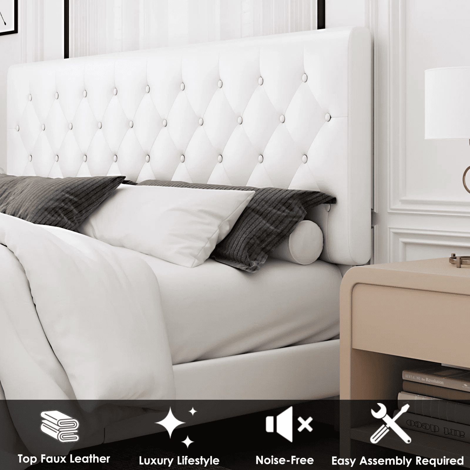 Homfa Queen Size Bed, Faux Leather Upholstered Button Tufted Low Profile Platform Bed Frame with Adjustable Headboard for Bedroom, White