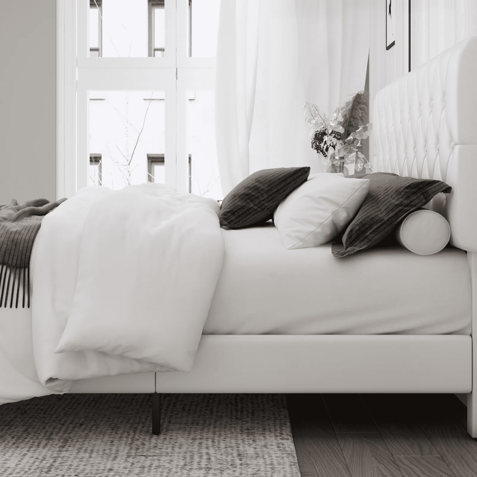 Homfa – Create a comfortable life! The white queen bed frame’s leather upholstery makes a luxurious statement right out of the gate. It’s built strong with a sturdy steel interior framework and dependable wood slats that can support your mattress without the box spring. The rectangular adjustable foam-padded headboard features diamond button tufting, offering a tailored look. The upholstered bed frame for the bedroom is the perfect complement to any modern or glam contemporary interior. Plus, there are 6” of ample space under the bed that allow you to store plenty of off-season clothing and bedding. This bed accommodates up to 800 lbs; these slats and center legs are included for added stability. We recommend a 10-12″ thick mattress (sold separately). Explore more Homfa items
