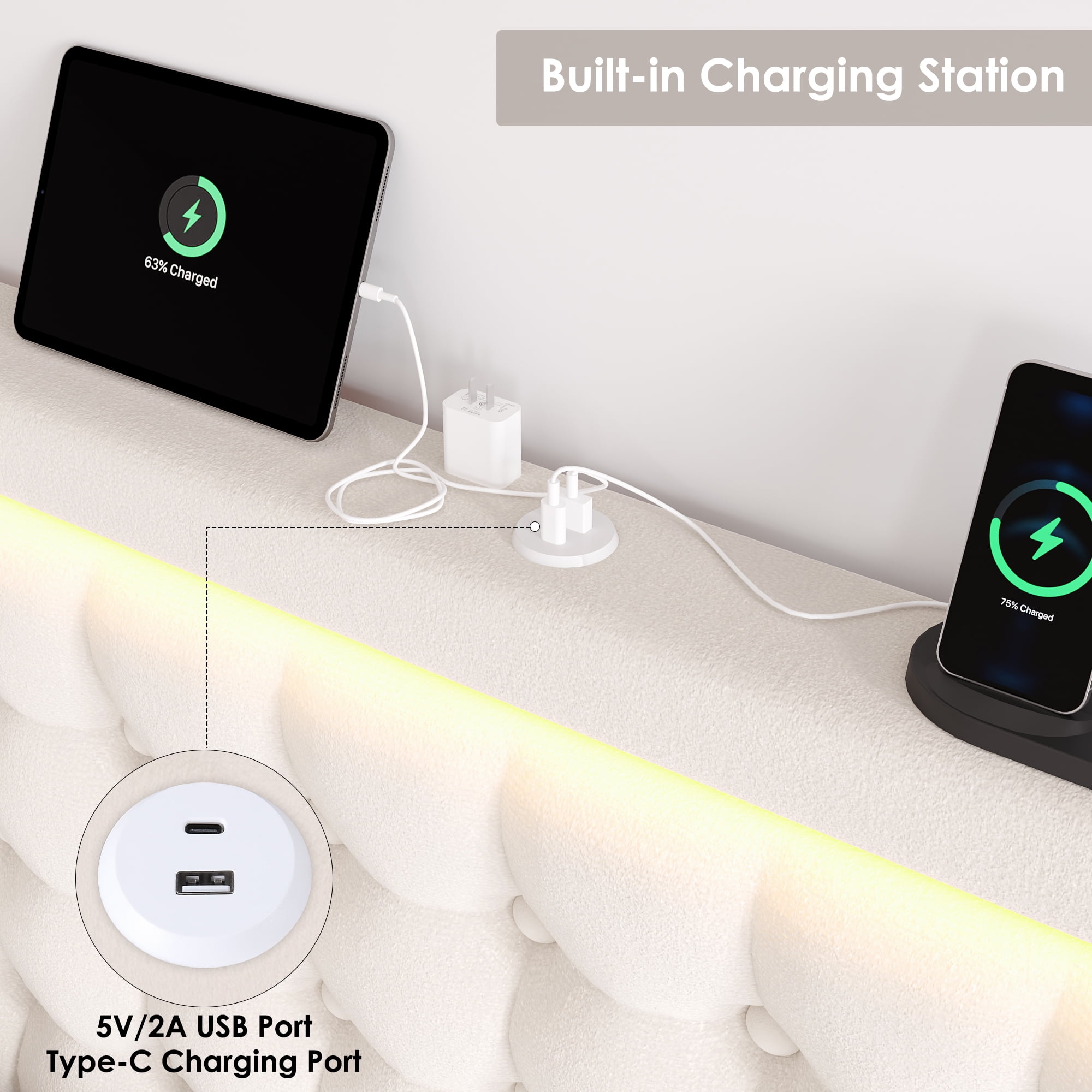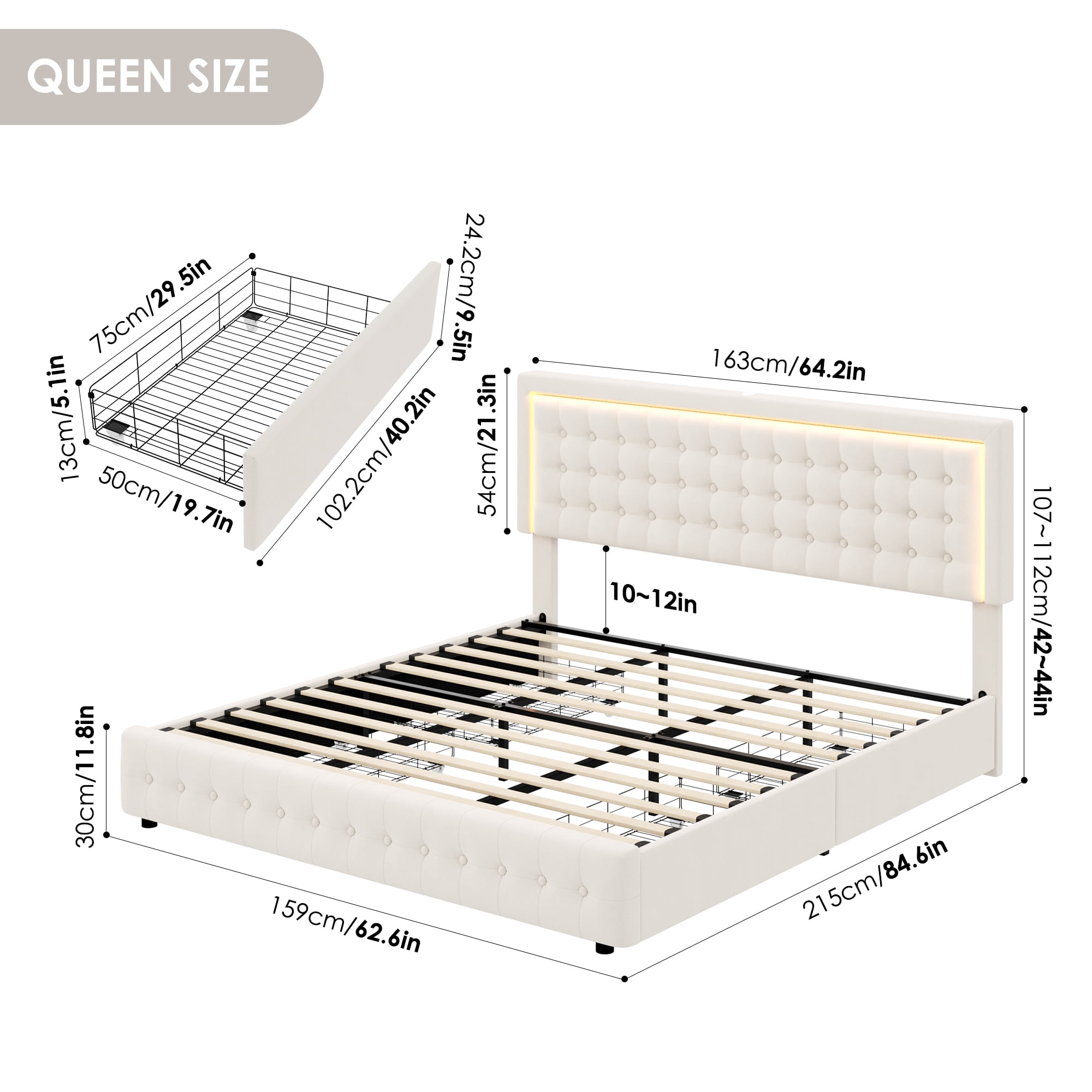 Features 【Smart LED Light 】The unisex bed frame is equipped with smart LED lights that can be switched via remote control or mobile APP with 16 colors of RGB lights and 4 changing modes. Satisfy your bedtime rituals and create different atmospheres according to your mood. 【2 USB Ports】The LED storage bed have built in 2 USB Ports in the headboard, make charging mobile phone or ipad easily on bed. 【4 Hidden Drawer】There are 4 removable storage drawers on wheels under the bed for easy sorting and storage of your everyday items. 【Height Adjustable Headboard】 Height-adjustable tufted headboard, fits mattresses 10-12 inches, no box spring required. 【Easy Assembly】Our LED bed frames come with detailed instructions, assembly tools and numbered parts and can be easily assembled by 2 people in less than 60 mins. 【24/7 Customer Service】We provide quality customer support, if you have any questions, please email us and we will reply within 24 hours. Specification: Color: Beige Bed Size: Queen Bed Frame Type: Platform Bed Frames Material: Metal / Manufactured Wood / Velvet Assembled Product Weight: 112 lb Maximum Load Weight: 900 lbs Assemble Required: Yes Dimensions: Twin Size: 86.6‘’L x 42.9” W x 42”-44” H Full Size: 79.9″L x 57.5″W x 44″H Queen Size: 84.6″L x 64.2″W x 44″H King Size: 84.6″L X 79.9″W X 41.3″-43.3″ Packaging Includes: 1 x Queen LED Bed Frame 1 x Assembly Kit 1 x Instructions