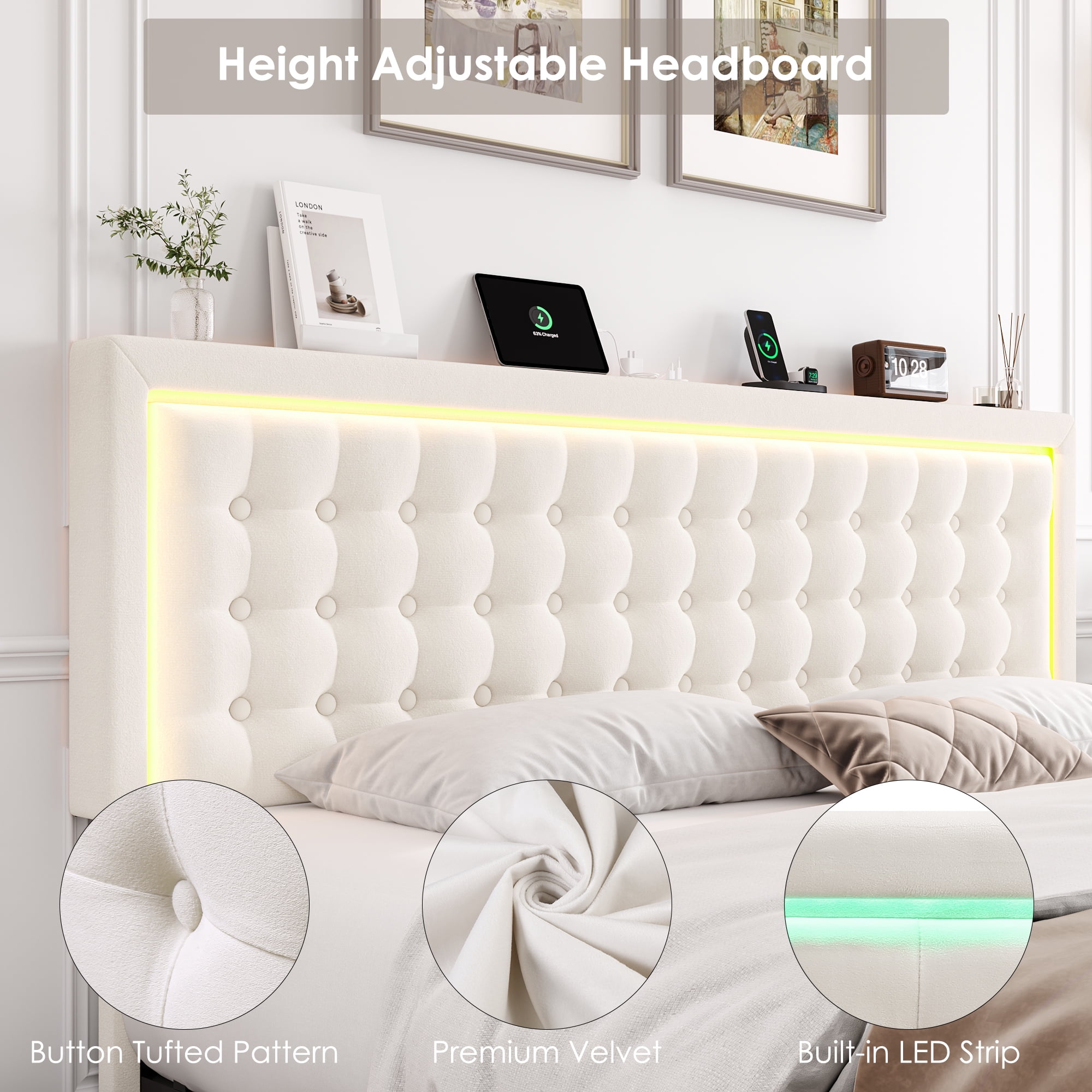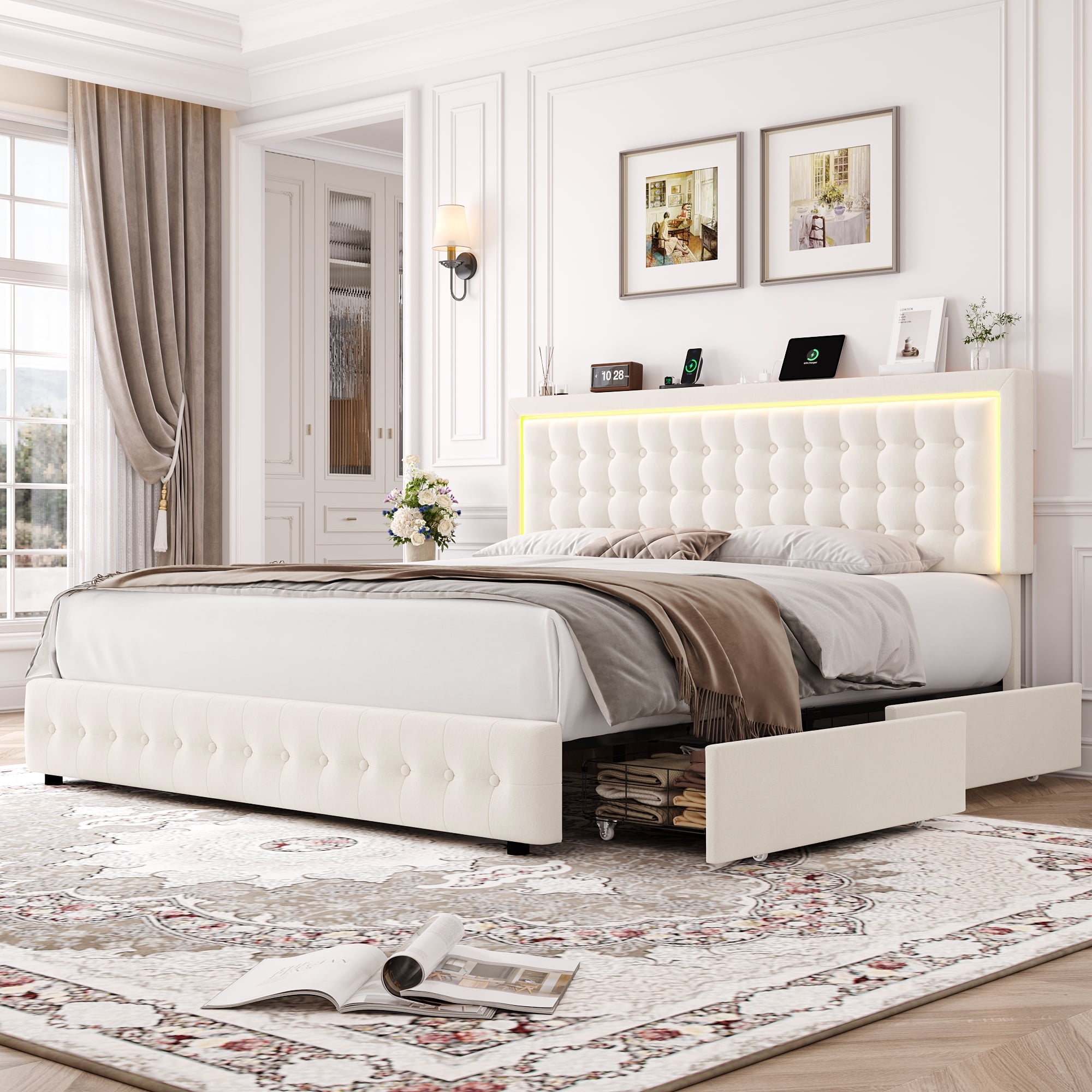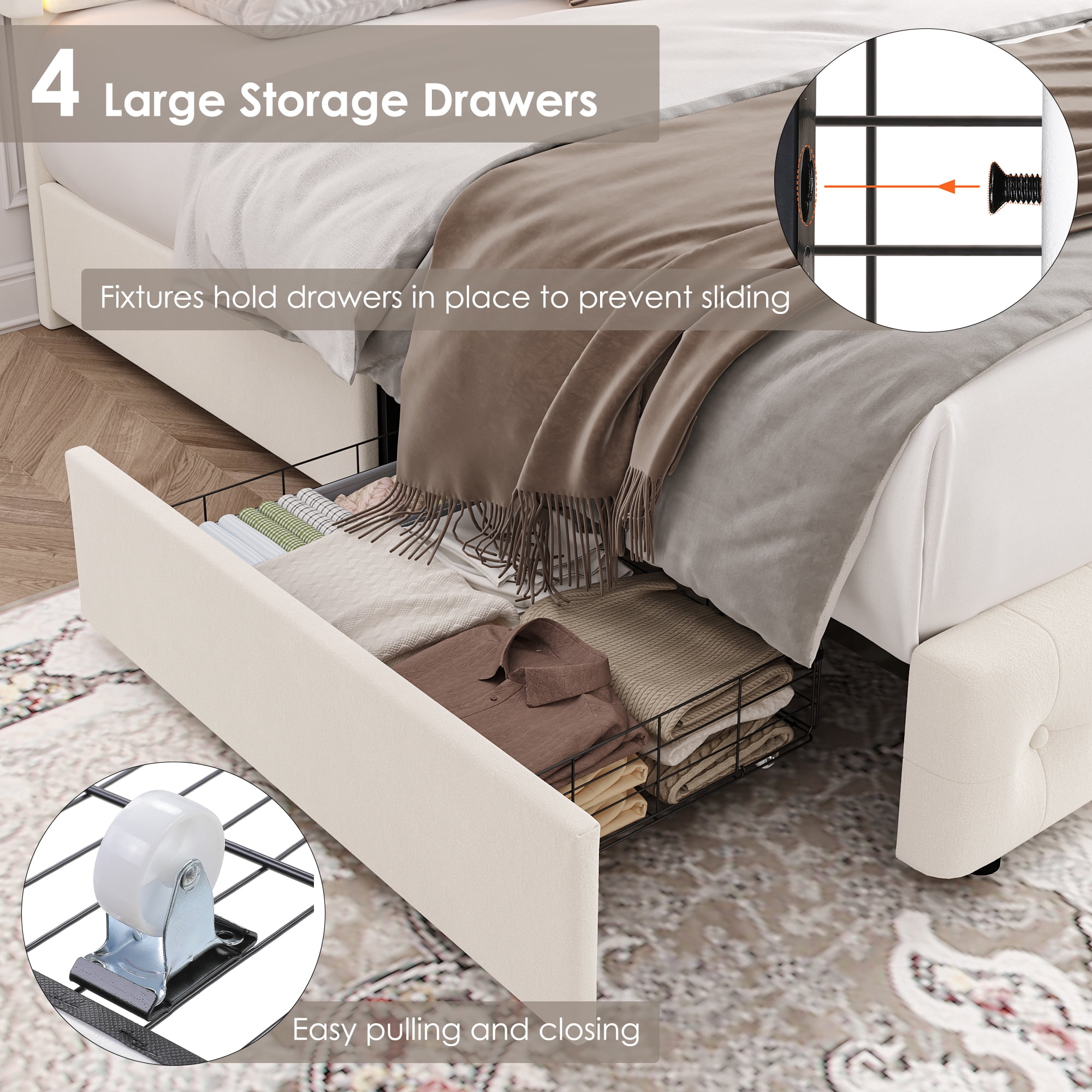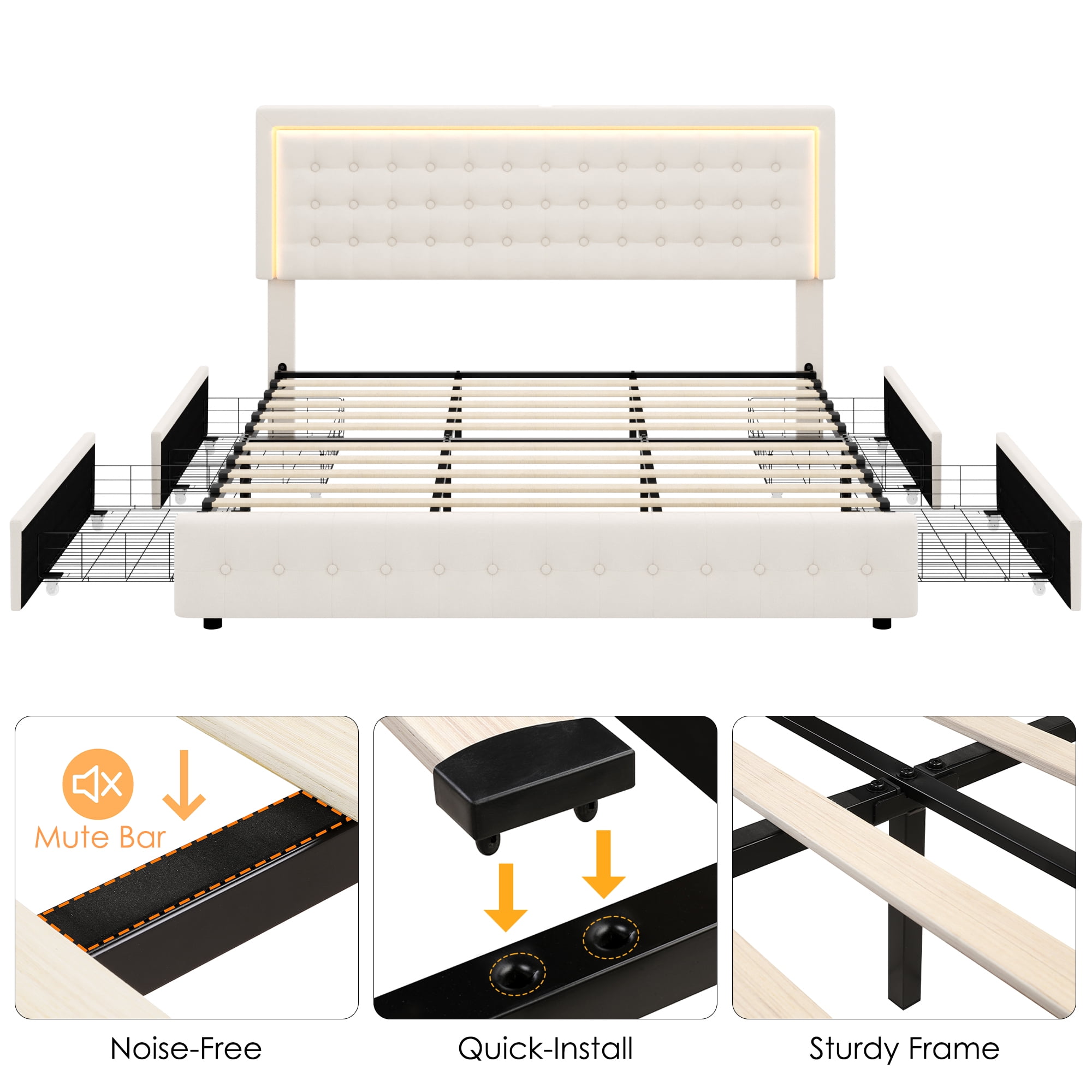 Homfa Queen Size LED Bed Frame with 4 Drawers, Velvet Platform Bed with Built-in USB Ports, Beige