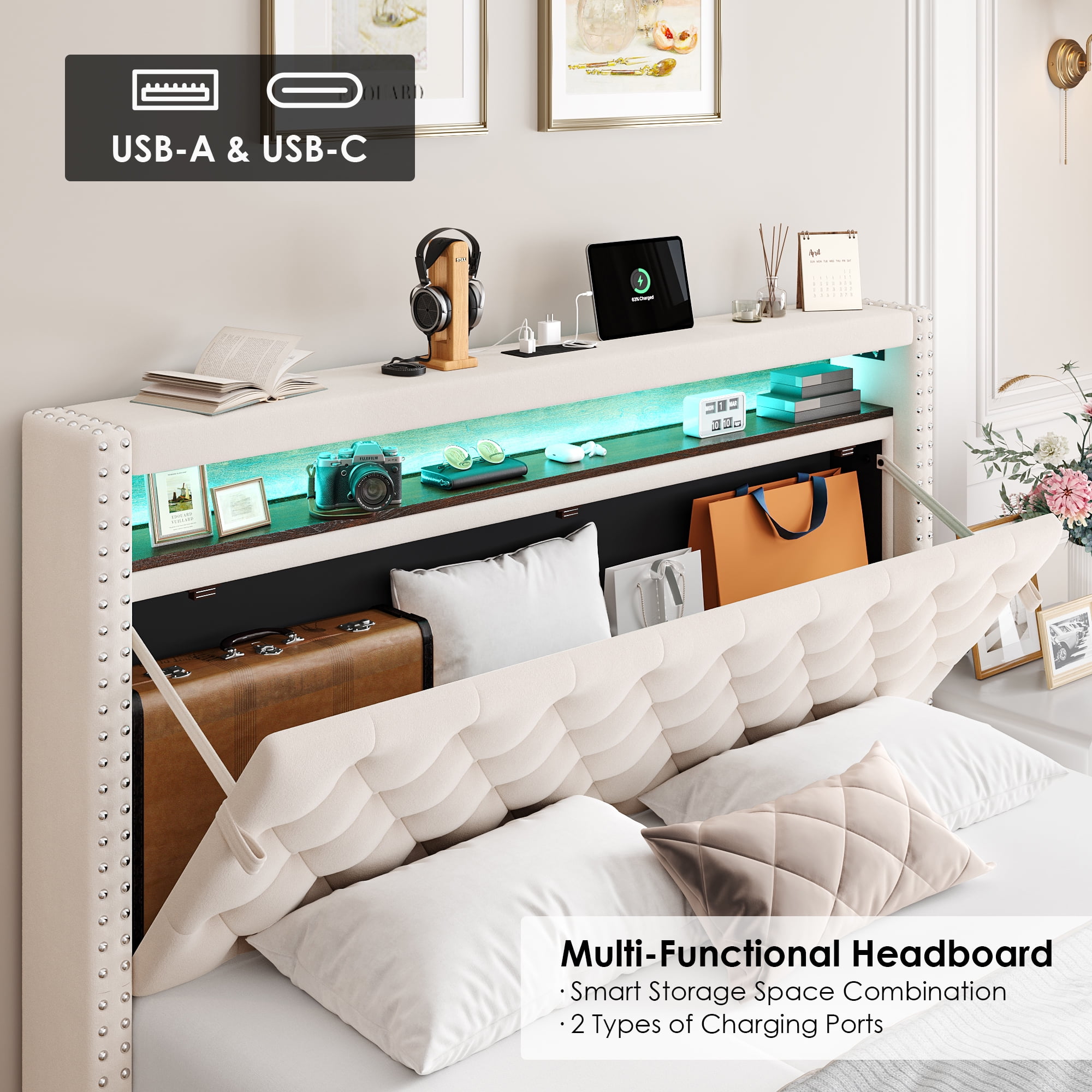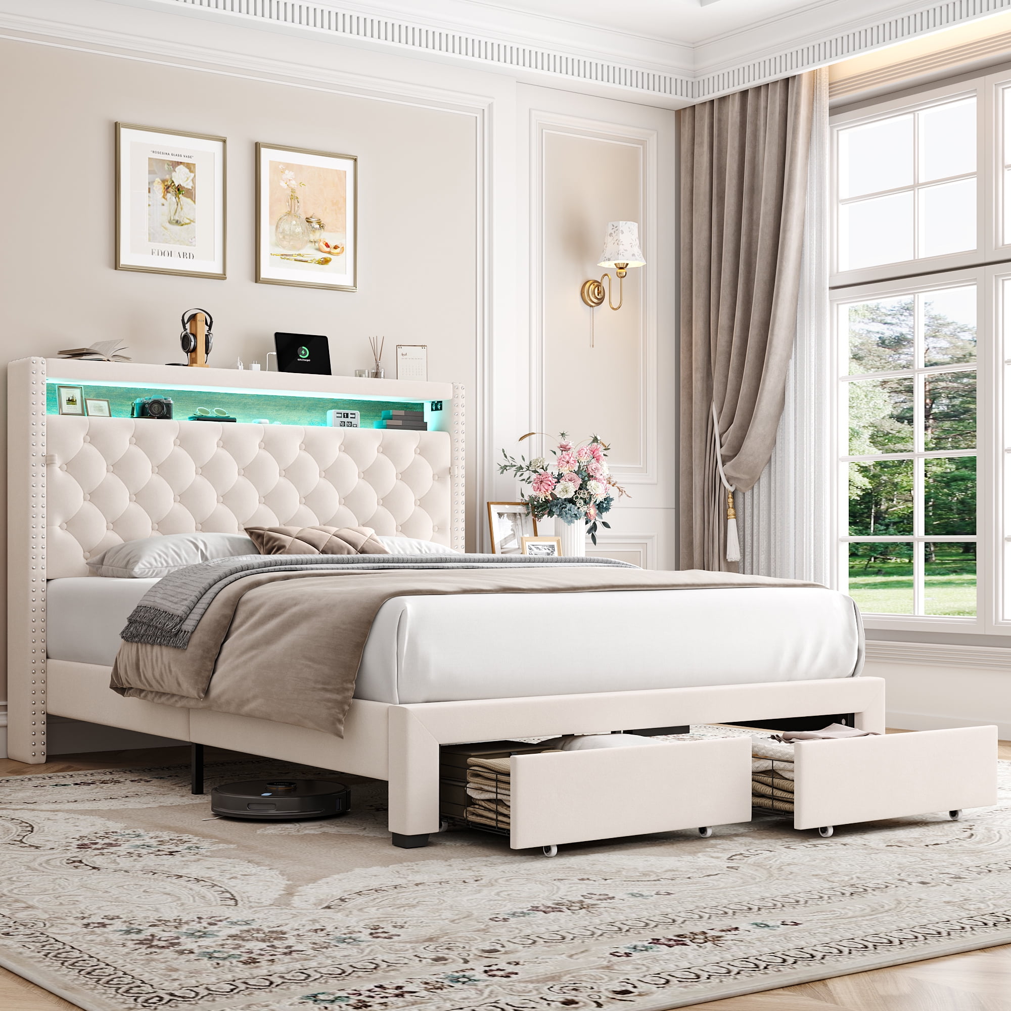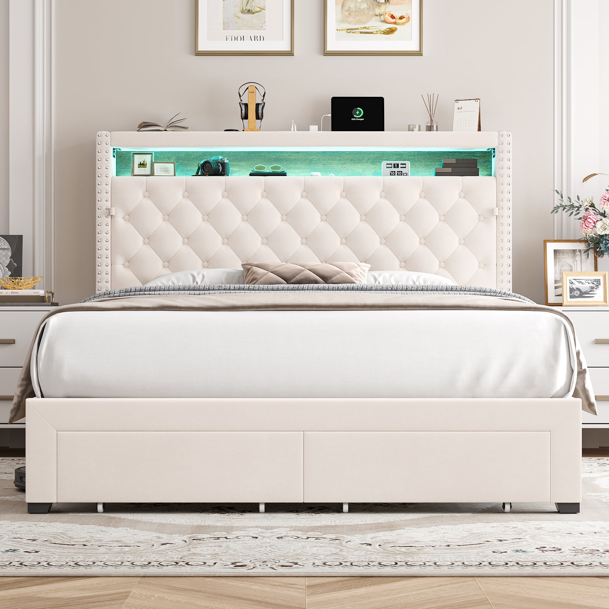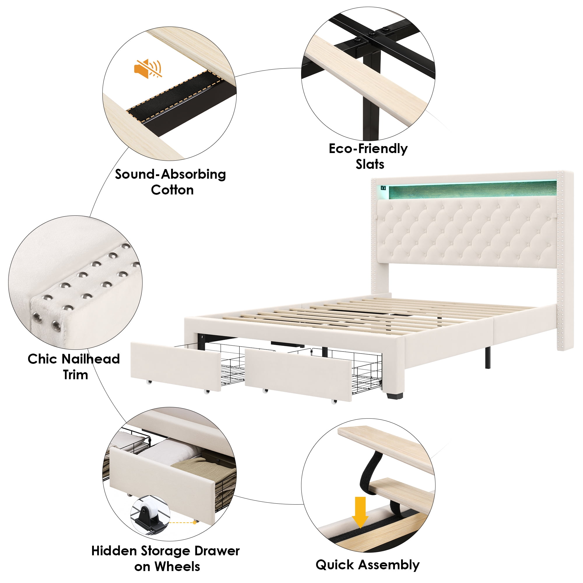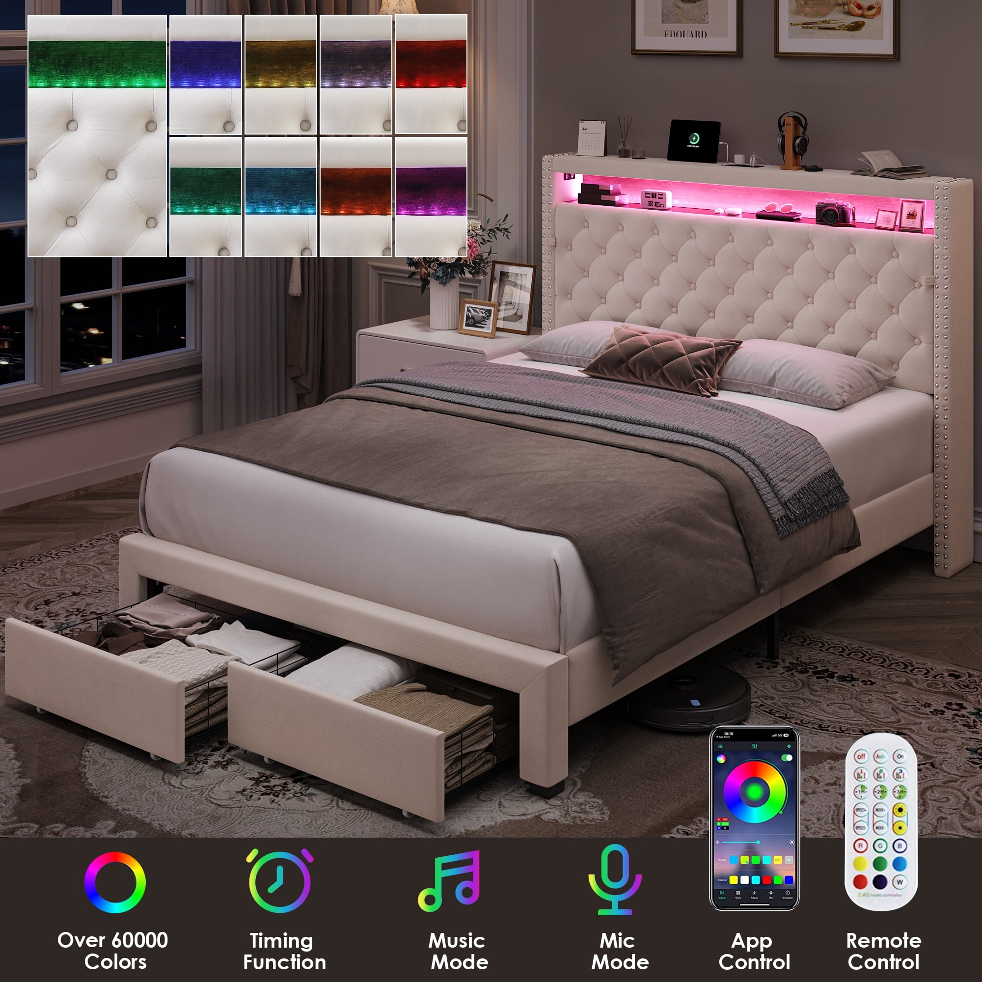 Features: 【Multifunctional Bed Frame with Amazing Storage】Headboard storage space and 2 large hidden storage drawers on wheels under the bed, which is convenient to daily storage. Headboard platform in moderate size definitely an excellent stage for your item display. 【Convenient Bed Frame with Charge Ports】3 types of ports, meeting safety standards, are placed on the headboard platform, making it super easy to your daily charging. 【Smart LED Light Bed Headboard】More than 6,000 colors; SYNC with music beats in smart activation modes; All joy you want will easily get. 【Modern & Breathable Fabric Bed Frame Style】Modern simple beige velvet fabric upholstery, adding fresh and elegant sense to your bedroom. 【Comfortable Upholstered Bed Frame】Well-filled and soft headboard futon, comfortable body support from neck to leg, bringing you gorgeous bedroom leisure time. 【Sturdy and Quiet】Made of solid wood, this tufted upholstered platform bed frame base can support up to 800 lbs. Equally spaced wooden slats and double-skin boards increase stability and durability, while the bed frame is equipped with a silent patch to ensure your quiet sleep. 【24/7 Customer Service】We provide quality customer support, if you have any questions with this Homfa LED bed frame, please email us and we will reply within 24 hours. 【Warning】Unplug the charging cable from the USB port when not in use to avoid potential safety risks. Specifications: Color: Beige Bed Size: Queen Bed Frame Dimensions: 89.8″L X 61.8″W X 48.4″H Storage Drawer Dimensions: 19.7″L X 16.9″W X 4.8″H Material: Metal, Line Fabric, Sponge, Wood Weight Capacity: 800 lbs Recommended Mattress Thickness: 10″ – 12″ Assemble Required: Yes Package Contents: 1 x LED Queen Bed Frame 1 x Accessory Kit 1 x Instructions