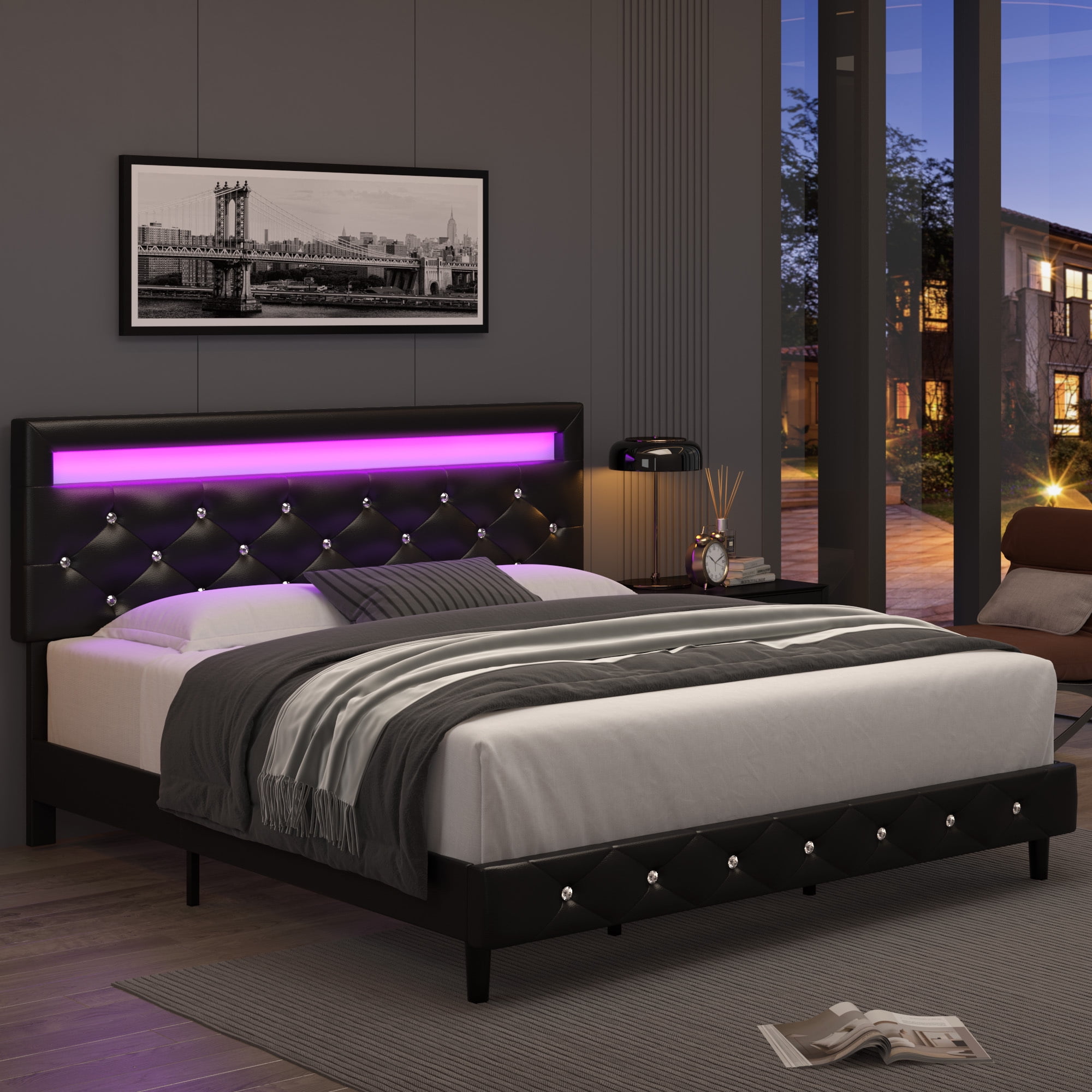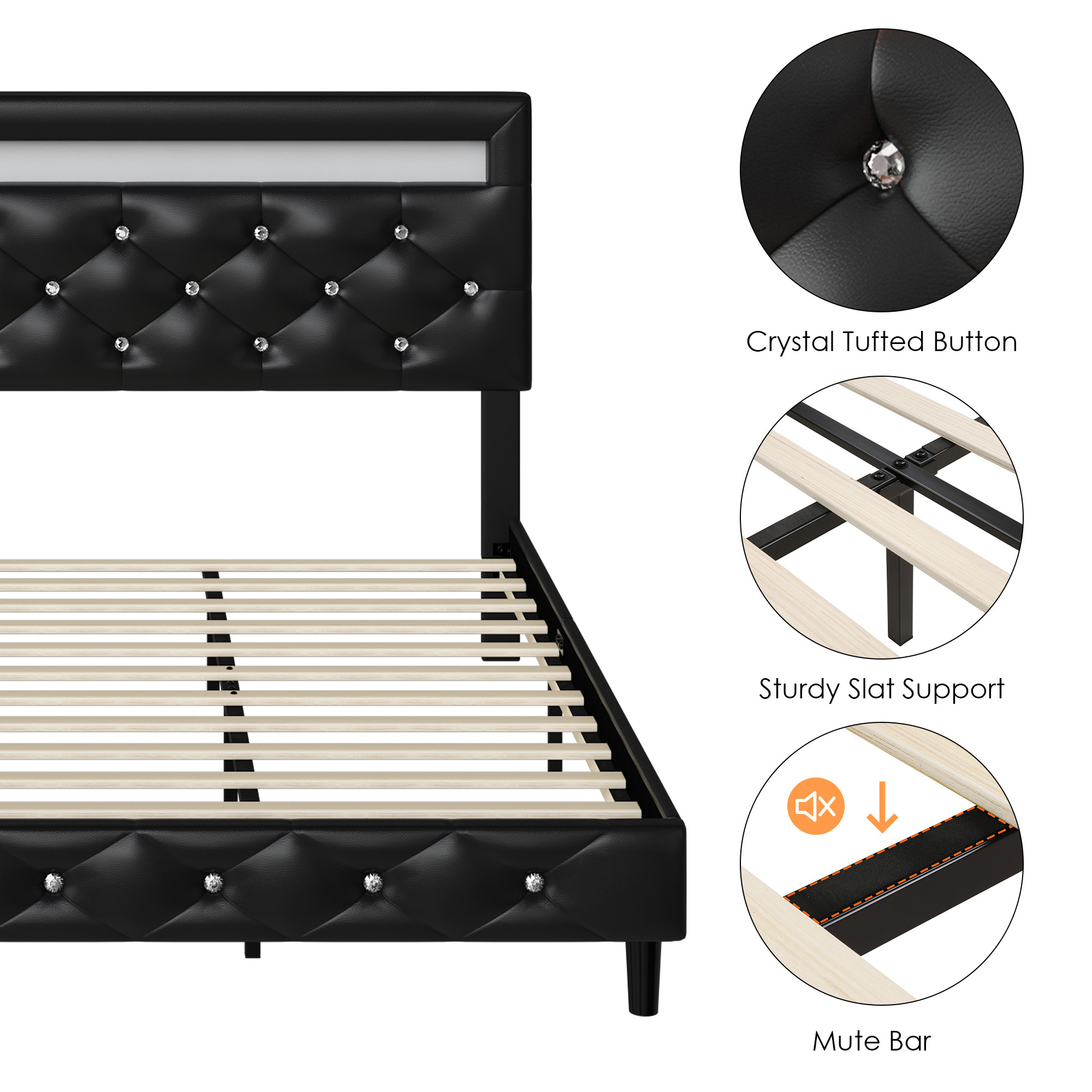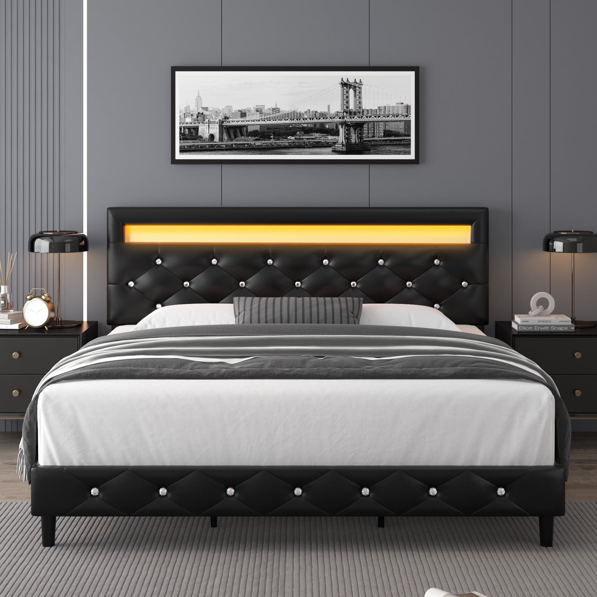 Homfa Queen Size LED Bed, PU Crystal Buckle Upholstered Platform Bed Frame with Adjustable Headboard, Black