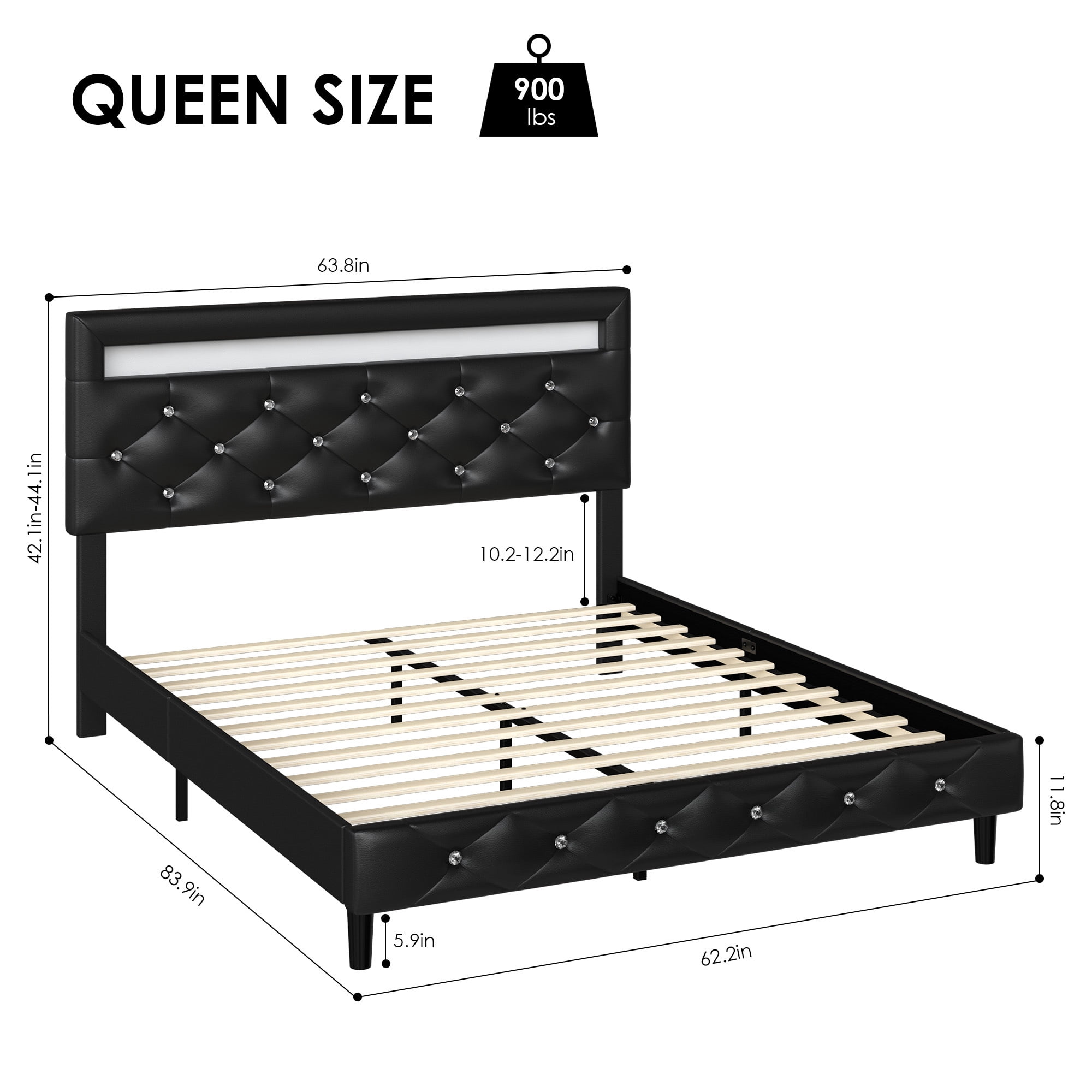 Features 【16 Colors LED Bed Frame】The LED lights come in 16 colors, 20 different lighting effects, and you can change the light color via wireless remote control or APP. You can choose any of the following modes: strobe, flash, fade or smooth to create the perfect environment to suit your mood. 【Adjustable Headboard & Waterproof】The headboard with LED lights has 2 height adjustments for different size mattresses, and PU leather material is waterproof and easy to clean. 【Sturdy and Durable & No Noise】This LED bed is supported by a steel frame structure and sturdy wooden slats, which are very stable and do not slip, and the sponge filled with the bed frame ensures no noise and enjoy a quiet sleep. 【No Box Spring Required】This LED bed frame is supported with durable wooden slats that extend the life of the mattress, ensuring durability and support without the need for a box spring, and can easily support 800 lbs. 【Easy to Assemble】 With the help of all mounting hardware and detailed instructions, 2 people can complete it easily in 1 hours. Quality customer service saves you from the worry of lost and damaged parts. 【24/7 Customer Service】 We provide quality customer support, if you have any questions, please email us and we will reply within 24 hours. Specifications Frame&Slat Material: Manufactured Wood Upholstery Material: PU Leather Color: Black Size: Queen Dimensions: 63.8″L x 83.9″W x 42.1-44.1″H Capacity: 800 lbs Package Contents 1 x LED Light Bed 1 x Accessory Kit 1 x Instructions Manual Note: 1. Mattress sold separately. 2. Everything you need for assembly comes zipped up in a compartment behind the headboard for convenience.