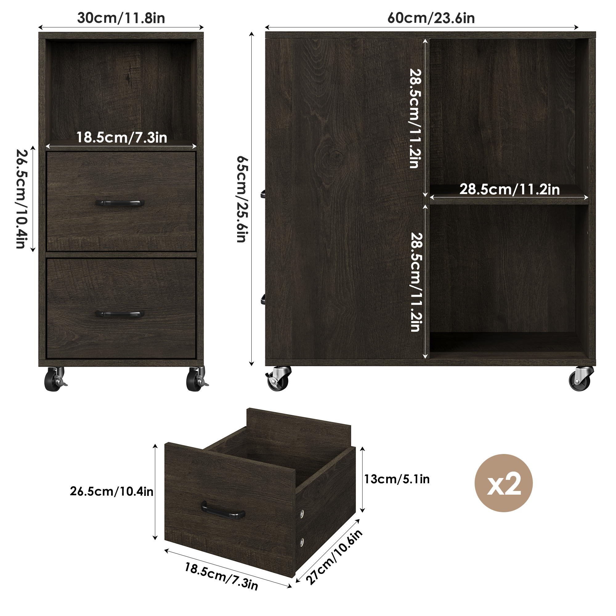 Features: 【Side Table with 2 Drawers】The top surface of the end table is ideal for potted plants, books and tea cups. The 2 wooden drawers can perfectly store small daily items such as remote controls, car keys, and cables. The side storage space is designed with adjustable shelves for different items. 【Ideal for Small Spaces】This sofa side table with drawer is modern in appearance and compact in size, suitable for every corner and gap in your home, especially for people with tight space. The sofa side is very suitable to be placed in the bedroom as a practical bedside table,or used as a side table or a charming home decoration in the living room/living room. 【Easy to Move】The nightstand table with drawers is located on 4 silent and wear-resistant universal wheels, which can be easily removed from the corner to meet your purpose, and then put back to the original place to keep the room tidy. 2 casters with brakes to prevent slipping when you need to stop 【Durable Structure】Our bedside table on wheels are composed of high-quality engineering boards and hardware to ensure long-term durability and not easy to deform or shake. In addition, the scratch-resistant surface protects the table from daily wear and tear 【Easy Assembly】All parts are numbered and detailed assembly instruction is provided, you can finish the assembly within 1 hour. 【24/7 Customer Service】We provide quality customer support, if you have any questions, please email us and we will reply within 24 hours. Specifications: Material: Artificial wood Color : Dark brown Drawer Interior: 10.4” H x 7.3” W x 11.8” D Overall: 25.6” H x 23.6” W x 11.8” D Overall Product Weight: 35 lb. Table Top Thickness:2.6” Package Contents: 1 x End side table 1 x Accessory 1 x Instruction