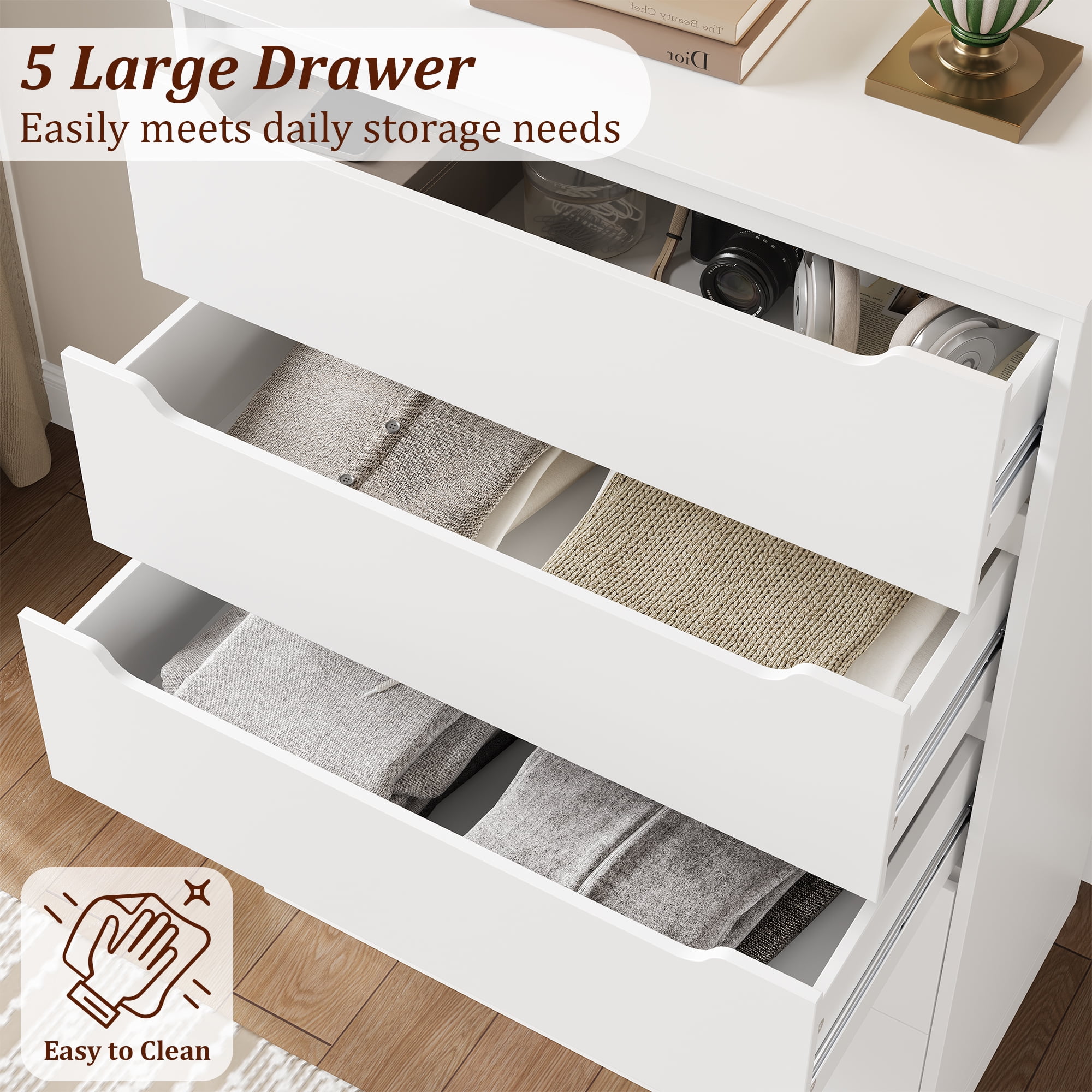Homfa Vertical 5 Drawer Dresser, Wood Storage Cabinet with Upgraded Stable Base for Bedroom Living Room, White