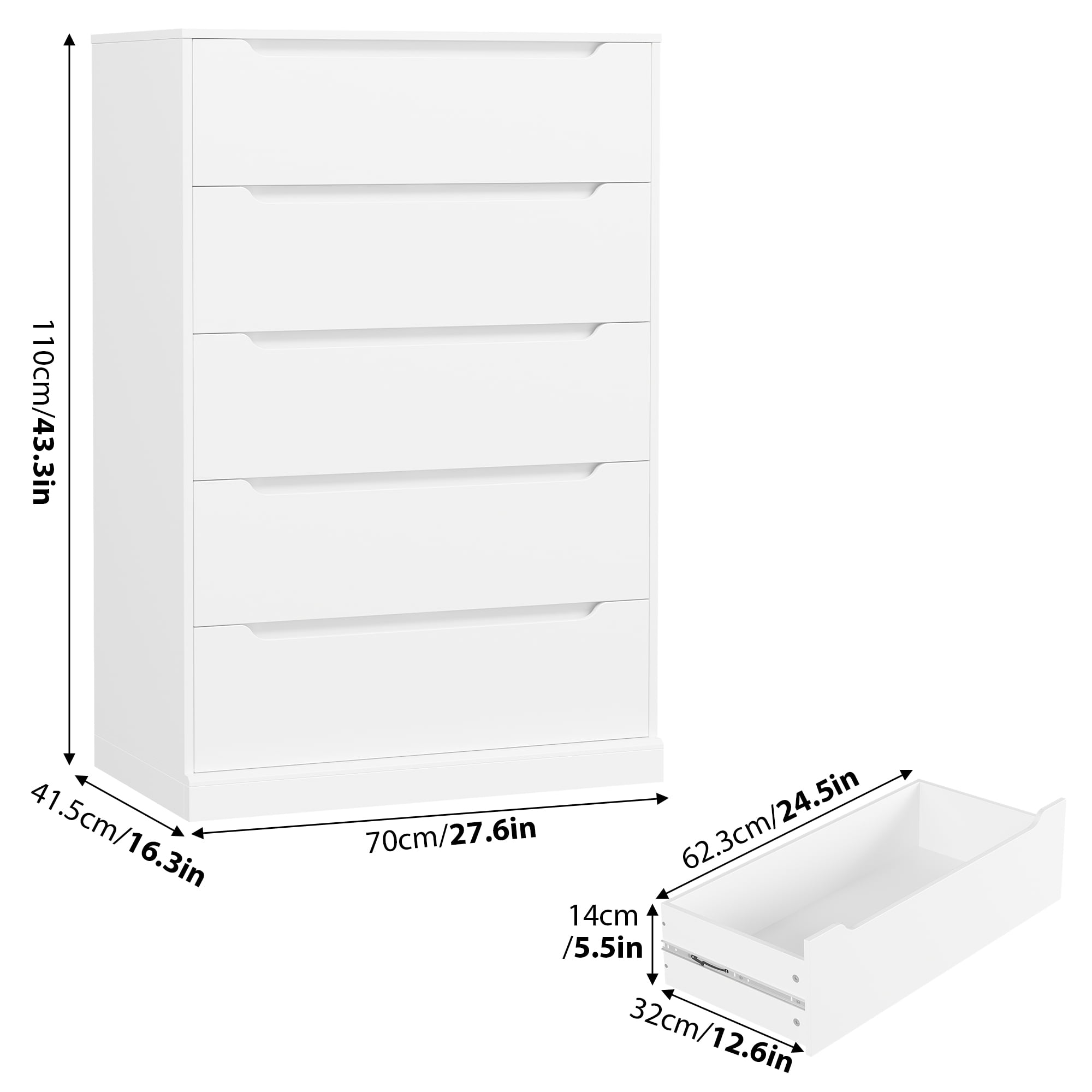 Features: 【5 Drawers Dresser】The chest of 5 drawers comes with spacious large drawers, which can provide extra storage for clothing, books, or other daily essentials. 【Upgraded Base】Wooden storage cabinet is made of high-quality engineered board with smooth finish, scratch-resistant, and durable. We have upgraded the base of the dresser to make it more stable in use. 【Compact Dresser】 Size: 27.6”W*16.3”D*43.3”H, this bedroom dresser is practical and can easily fit in small spaces and embellish any room of your home or apartments. 【Easy Assembly】All parts are numbered and detailed assembly instruction is provided; you can finish the assembly within 45 minutes by 2 adults. 【24/7 Customer Service】 We provide quality customer support; if you have any questions, please email us, and we will reply within 24 hours. Specifications: Type: Vertical Dresser Material: manufactured wood, metal Color: White Overall Size: 27.6”W*16.3”D*43.3”H Drawer Inner Size: 12.6”D*24.5”W*5.5”H Overall Product Weight: 110 lb Number of Drawers: 5 Assembly requirements: yes Package Contents: 1 x 5 drawer dresser 1 x Assembly Kit 1 x Instructions