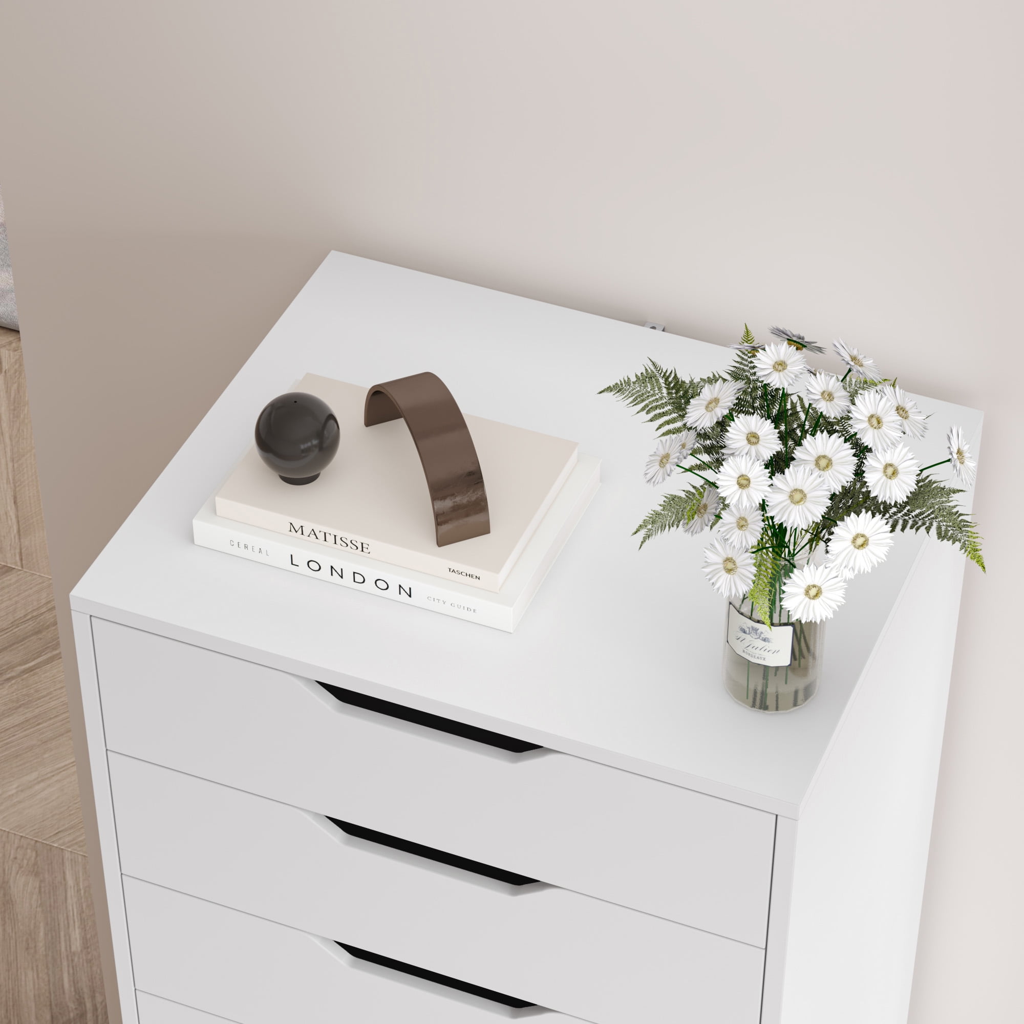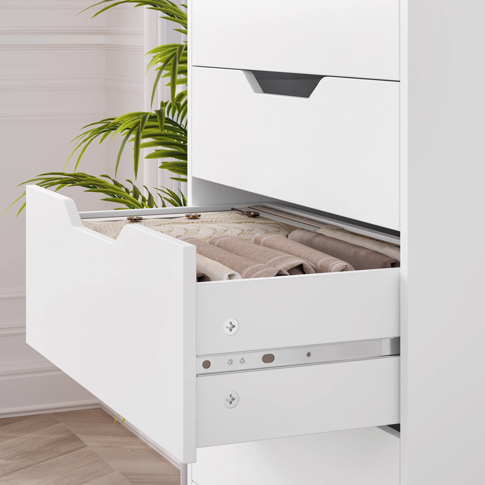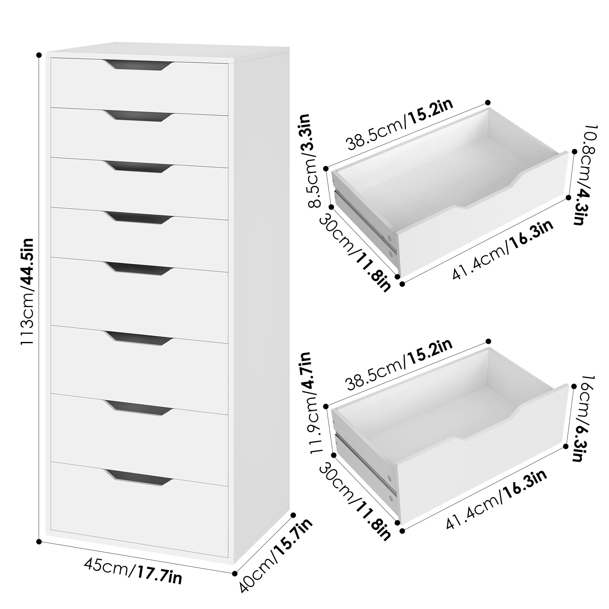 Features 【High Quality Material】The bedroom dresser is made of E1-grade density board, which lasts longer than ordinary wood. The wood is smooth and flat with a high quality coating that makes it easy to clean. 【8 Drawers】This filing cabinet is equipped with 8 drawers for easy pull-out, including four large drawers and 4 small drawers, using finely finished fluted handles to avoid scratches, as much as possible. With its large storage space and filing capacity, it is great for storing books, cosmetics and jewelry, toys and other miscellaneous items. 【Good Stability】The storage cabinet is very stable, the bottom of the cabinet can fit perfectly on the floor, it won’t shake and it won’t easily topple over. The back of the 8-drawer locker is also equipped with an anti-fall device to protect the safety of your family. 【Simple Design】The white appearance makes the 8-drawer chest look simple and stylish without too much decoration, bringing you a comfortable and elegant feeling. 【Versatility】The cabinet has a wide range of uses. It is suitable for placing in bedroom, living room, study, kitchen and other places with high practicality and classification storage capacity. 【Easy Assembly】 All parts are numbered and detailed assembly instruction is provided, 2 adults can easily finish the assembly within 1hours. 【24/7 Customer Service】 We provide quality customer support, if you have any questions of this 8 drawer tall dresser, please email us and we will reply within 24 hours. Specifications: Material: Manufactured Wood Drawer Glide Material: Metal Color: White Number of Drawers: 8 Overall: 44.5” H x 17.7” W x 15.7” D Main Drawer Interior: 4.7” H x 15.2” W x 11.8” D Smallest Drawer Interior: 3.3” H x 15.2” W x 11.8” D Smallest Drawer Weight Capacity: 11 lbs Main Drawer Weight Capacity: 22 lbs Overall Product Weight: 71.7 lbs Package Contents: 1 x Chest of Drawer 1 x Accessory Kit 1 x Instructions Manual