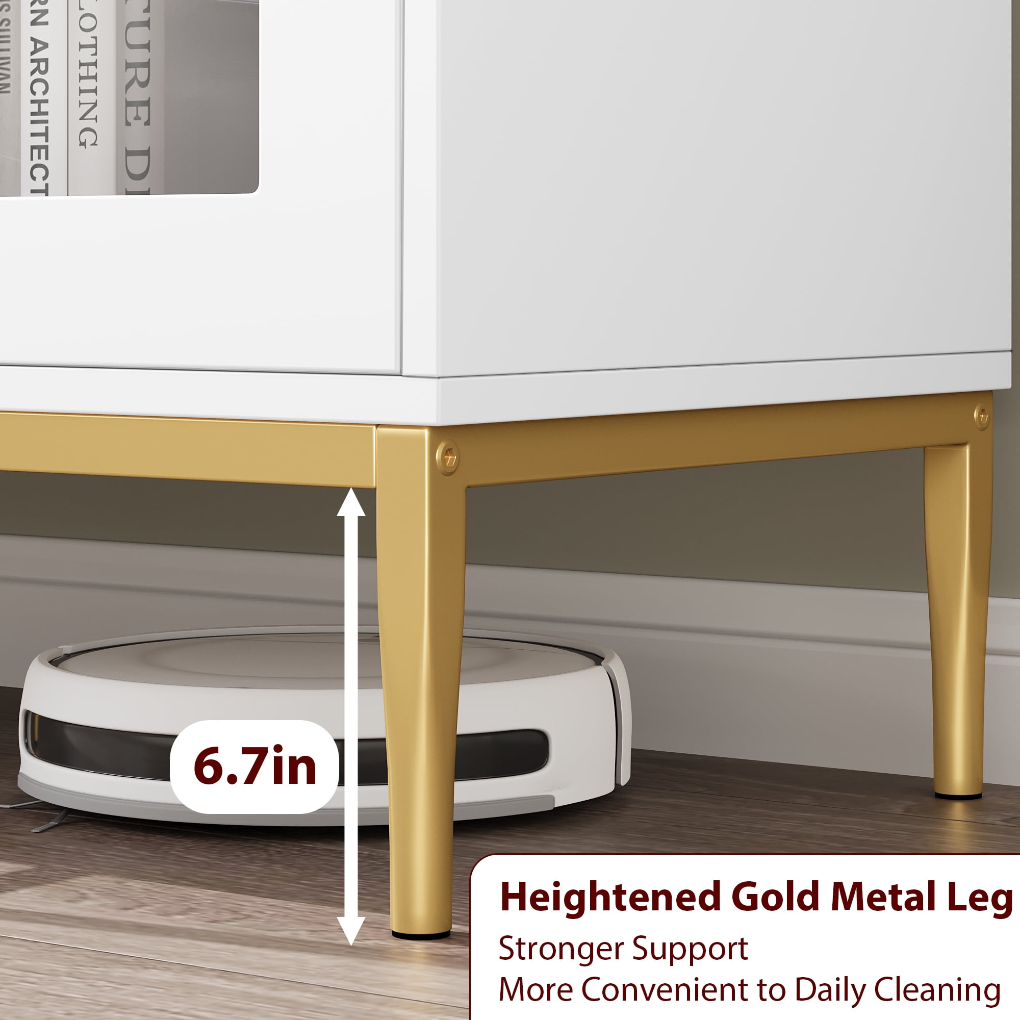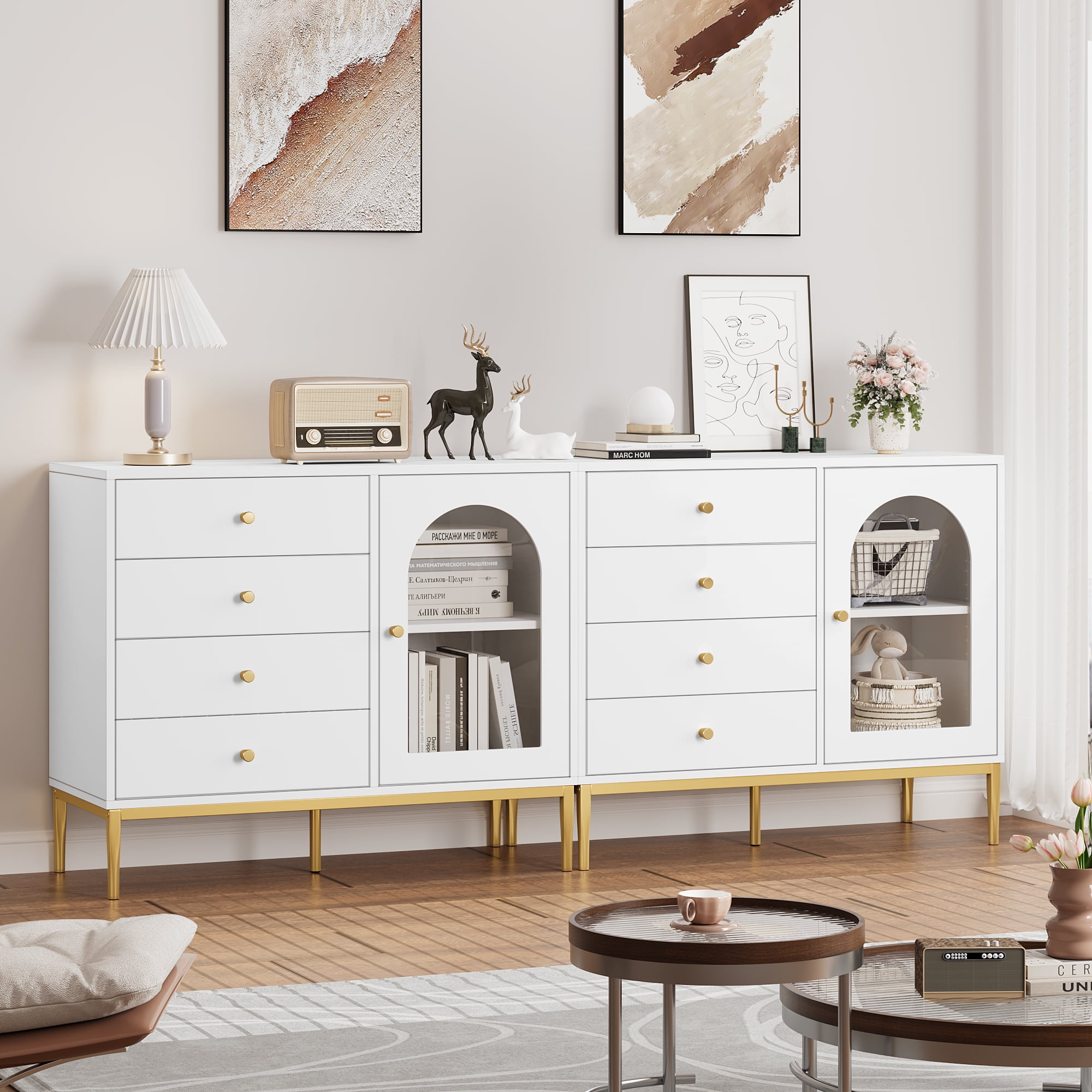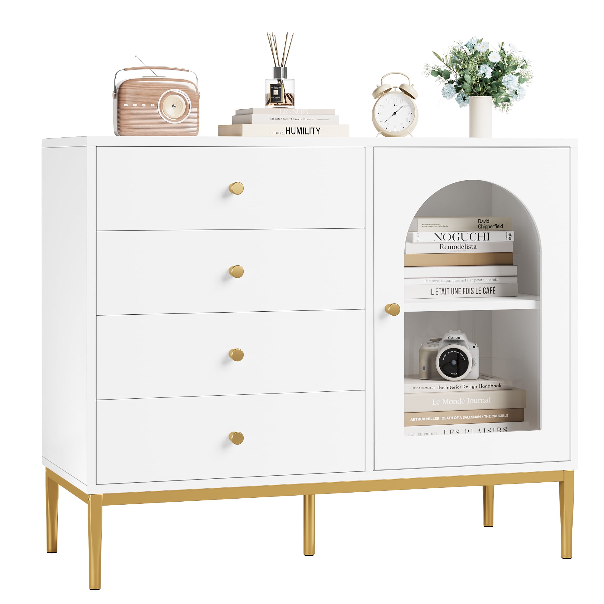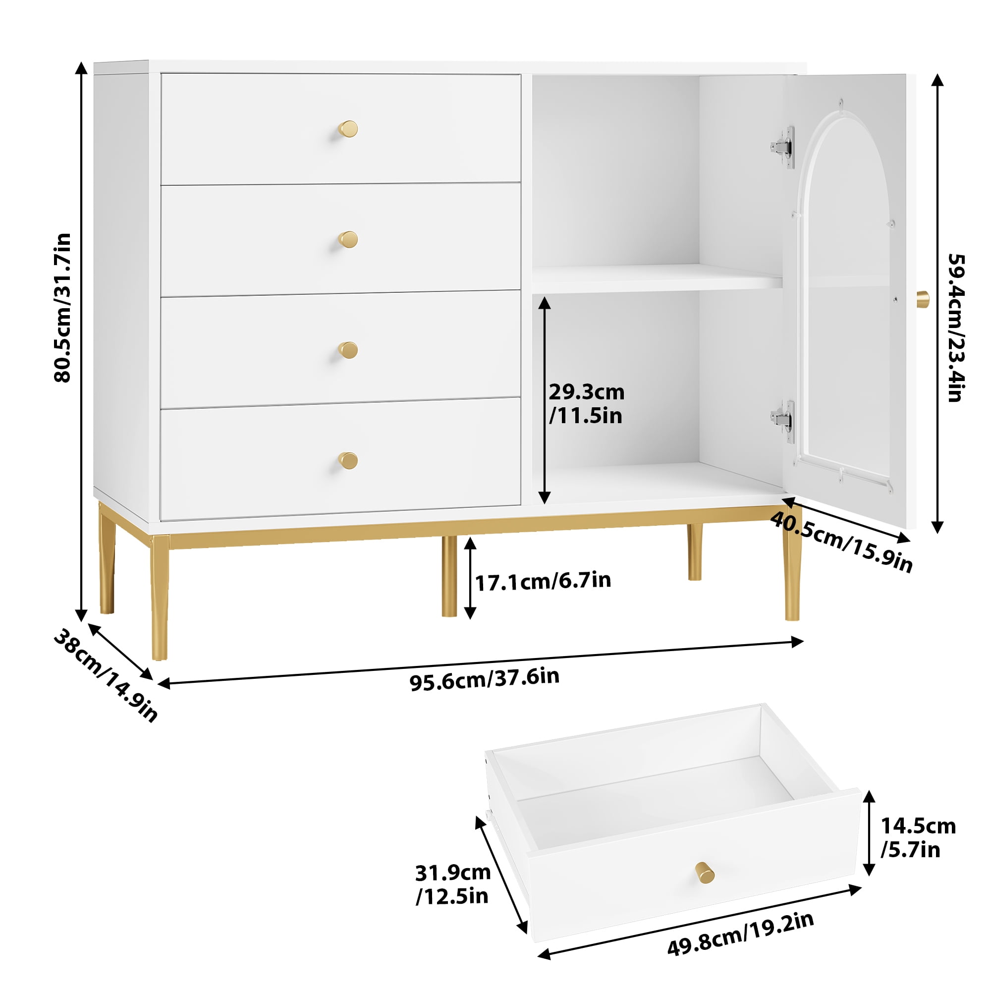 Features 【Sturdy Tempered Glass】The glass door of the accent cabinet is made of tempered glass, explosion-proof, strong and safe. Doors with glass are not only dust-proof, but also provide a beautiful visual impression. 【Sturdy and Stable】The white accent cabinet is made of high quality wood and tempered glass, the overall structure is not easy to shake and the 4 metal feet are more stable. The feet’s height is enough to accommodate a floor sweeper. 【4 Drawers and 1 Cabinet】This storage cabinet has 4 drawers and 1 cabinet with door, which can help you collect many daily items in different categories, it is a perfect way to get extra storage space. The fixed shelves can sturdily support heavier weights. 【White Modern Style】The clean, straight lines of white make the cabinets more elegant and beautiful, and they can easily fit into a variety of decor styles. A great addition to any living room, entrance or living space, it can be used as a storage cabinet, buffet sideboard and more. 【Anti-tippling Device】Equipped with anti-tippling device to protect the safety of the family. 【Easy to Assemble & 24/7 Customer Service】The wooden storage cabinet comes with the help of all mounting hardware and detailed instructions, 2 people can complete it easily in 1 hour. 24/7 quality customer service so you don’t have to worry about lost and damaged parts. Specifications Material: High quality wood, Metal, Tempered glass Color: White Size: 37.6″L x 14.9″W x 31.7″H Drawer Size: 19.2″L x 12.5″W x 5.7″H Number of Drawers: 4 Number of Shelves: 2 Number of Doors: 1 Shelf Weight Capacity: 33 lbs Drawer Weight Capacity: 22 lbs Soft Close/Self Close: Yes Package Contents 1 x Storage Cabinet with Door 1 x Accessory Kit 1 x Instructions Manual Note: This white gold storage cabinet is an upgraded version with a transparent HD glass door, providing visual convenience.