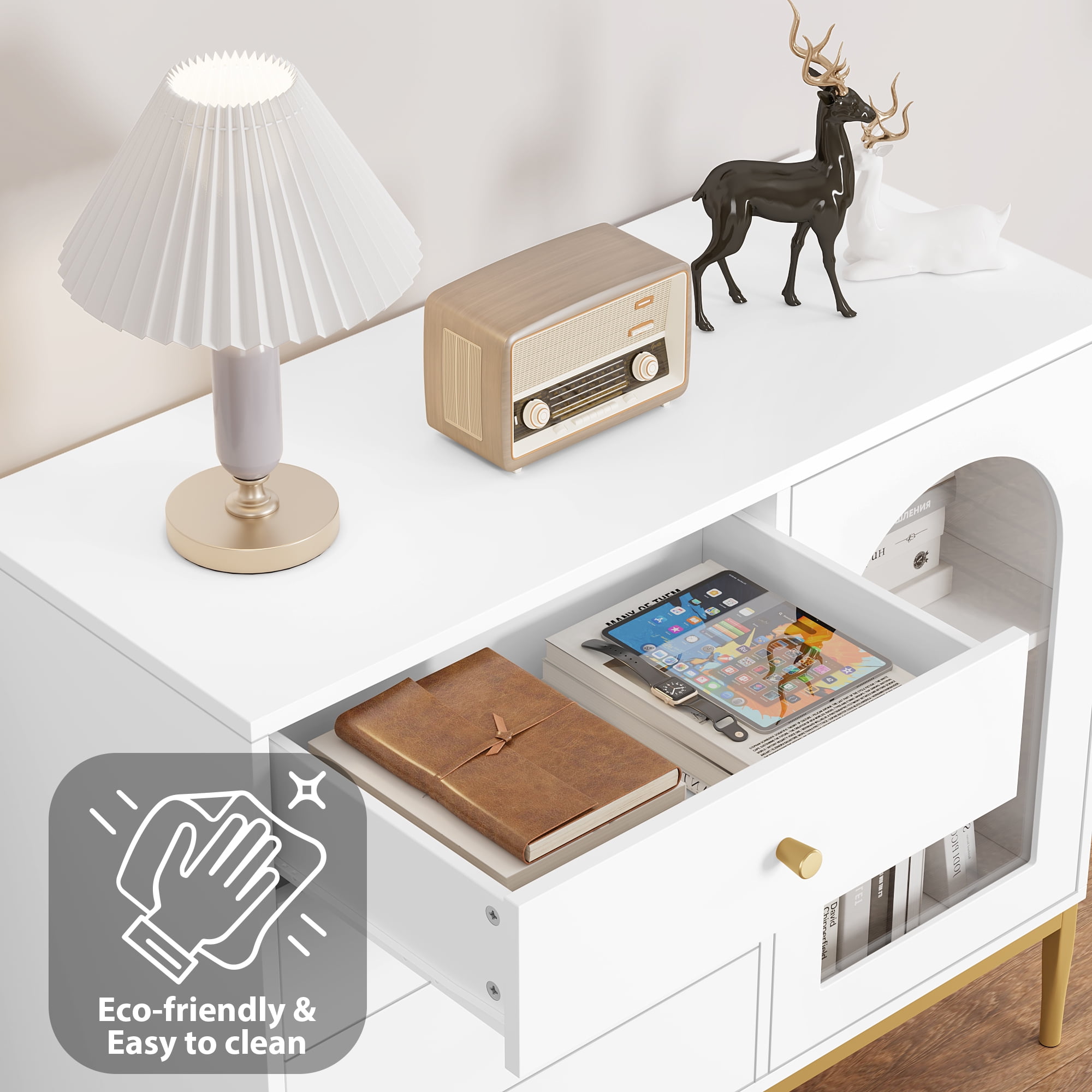 Homfa White Accent Cabinet with 4 Drawer, 37.6” Wide Storage Cabinet with Glass Door for Living Room