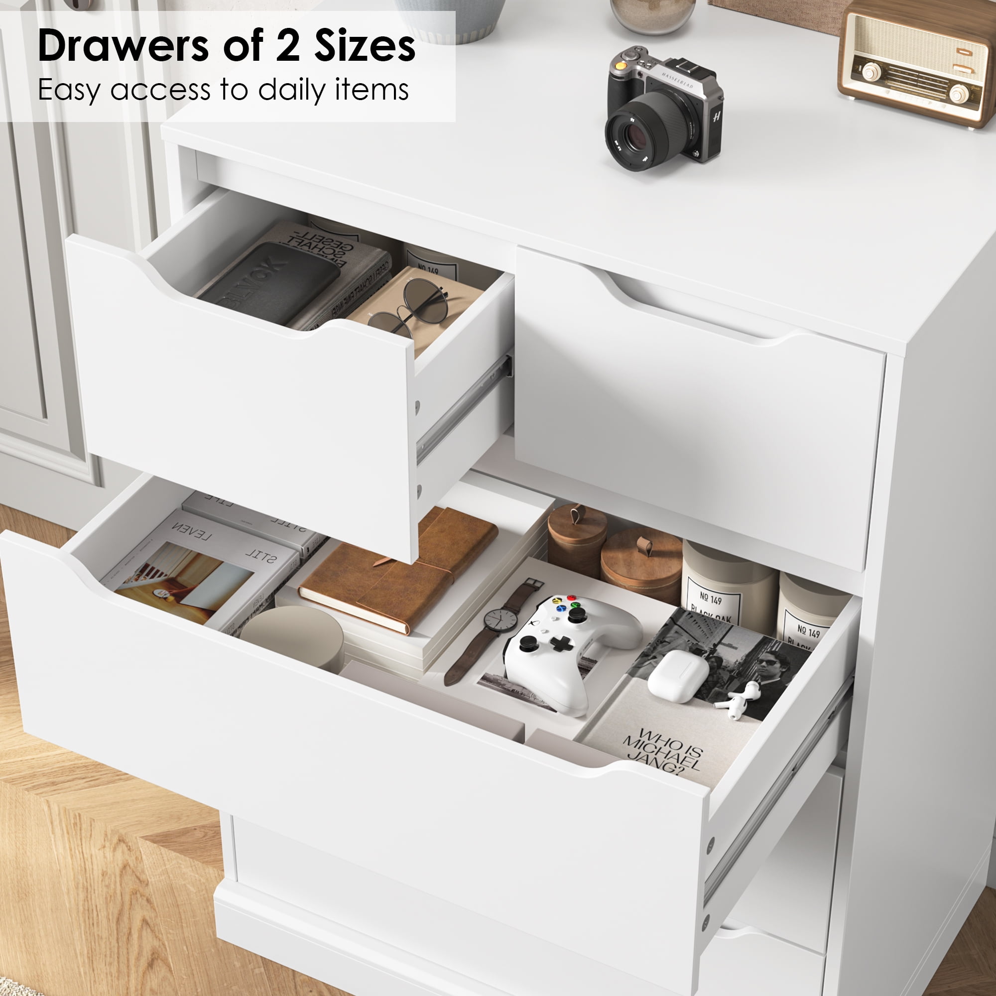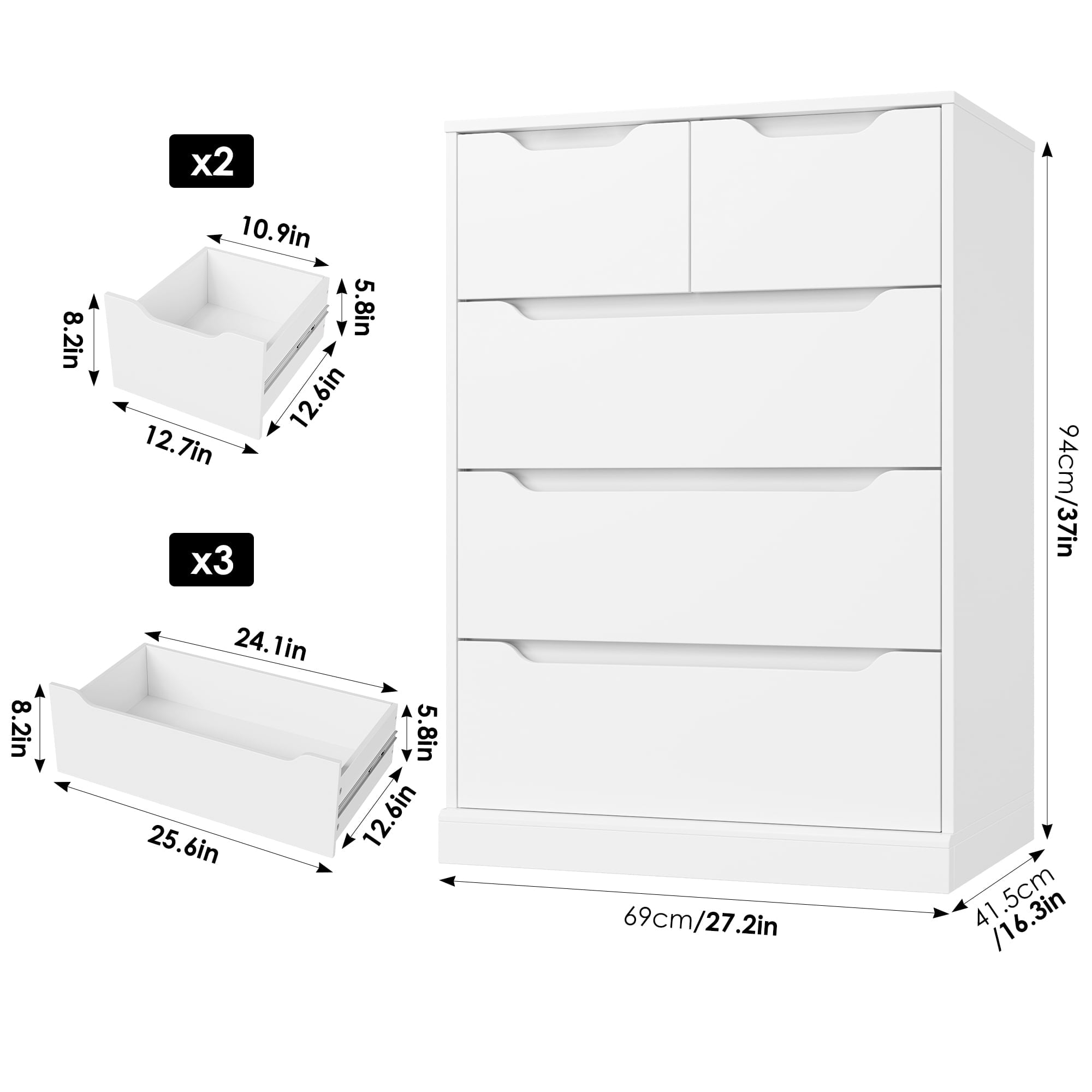 Features: 【Stable & Durable】The white dresser with 5 drawers is made of high-quality engineering boards, and the upgraded heightened base brings more durability. White tall dresser’s drawers feature high-quality metal rails that will open and close smoothly for years. 【Spacious Space】The bedroom dresser’s 3 spacious drawers of this wood chest of drawers offer plenty of space to organize your room, and 2 smaller drawers up top keep small items and delicate organized. The spacious desktop is suitable for placing various items and reflects your taste! 【Modern Appearance】The 5-drawer dresser for bedroom adopts warm and modern white tones and unique hollow handles, this is a modern and stylish vertical dresser that perfectly decorates your home. 【Compact Dresser】27.2*16.3*37in, this stylish and practical compact tall dresser can easily fit into small spaces and accentuate any unused corner of your home. 【Easy Assembly】All parts are numbered and detailed assembly instruction is provided, you can finish the homfa dresser assembly within 1 hour by 2 adults. 【24/7 Customer Service】We provide quality customer support, if you have any questions, please email us and we will reply within 24 hours. Specification: Color: White Material: Manufactured wood Overall Size: 27.2”W*16.3”D*37”H Smaller Drawer Size: 12.6”D*10.9”W*5.8”H Main Drawer Size: 12.6”D*24.1”W*5.8”H Overall Product Weight: 99.91lb. Package Contents: 1 x 5 Drawer Dresser 1 x Assembly Kit 1 x Instruction