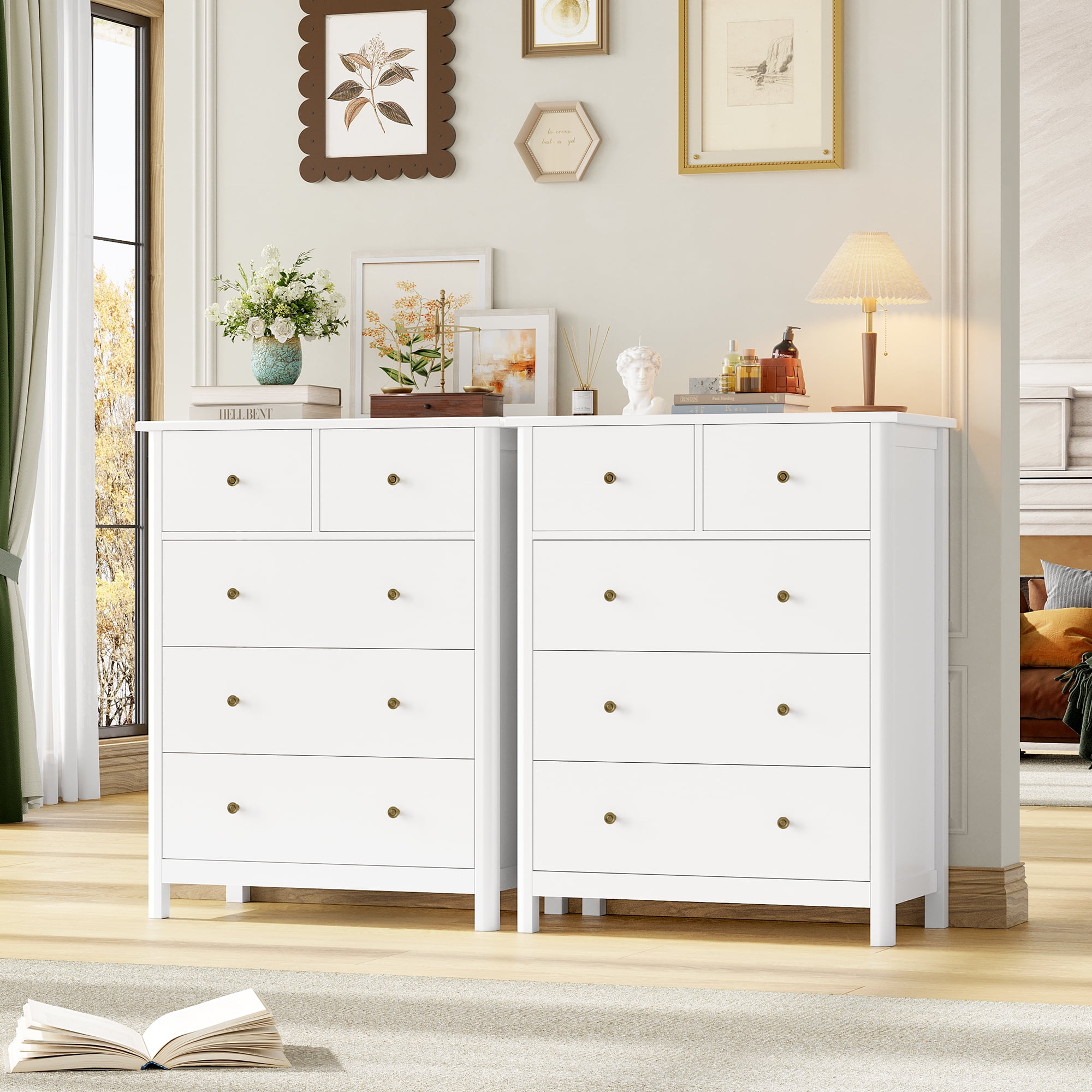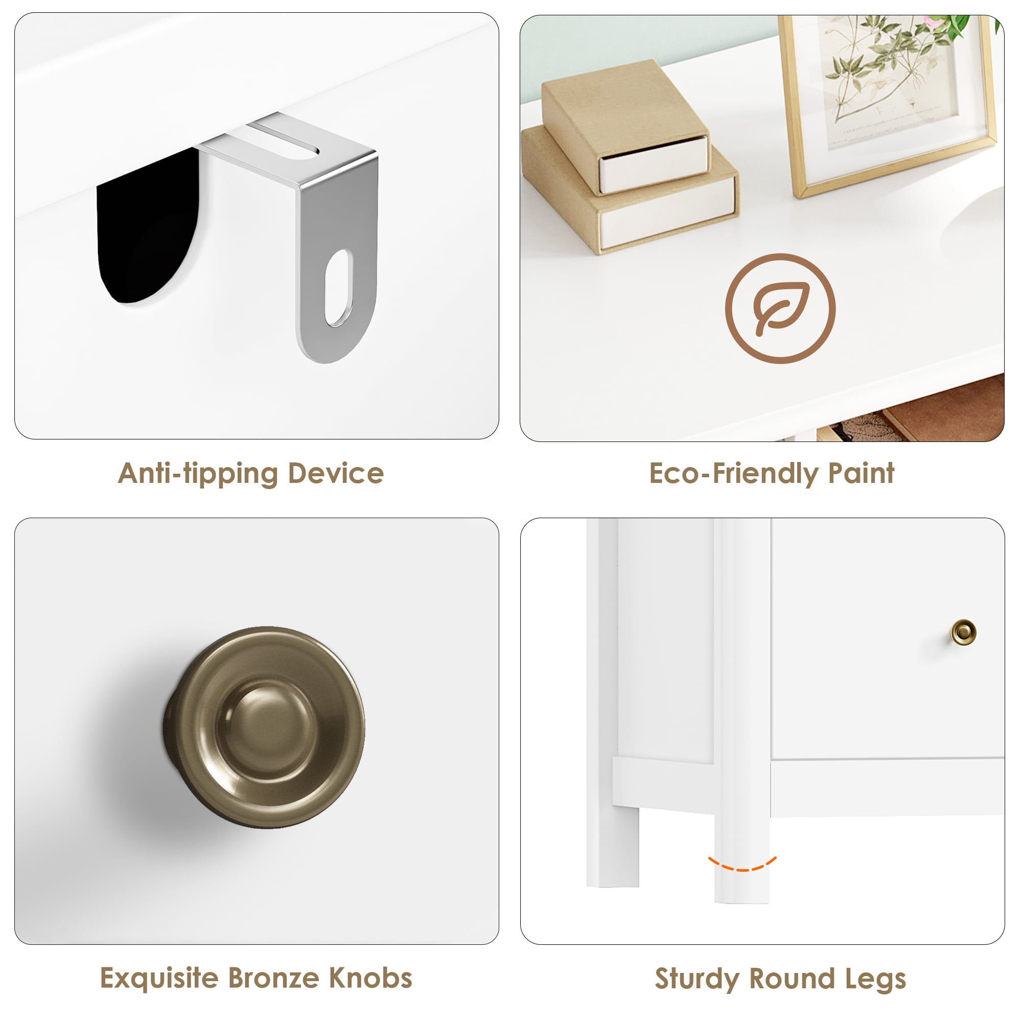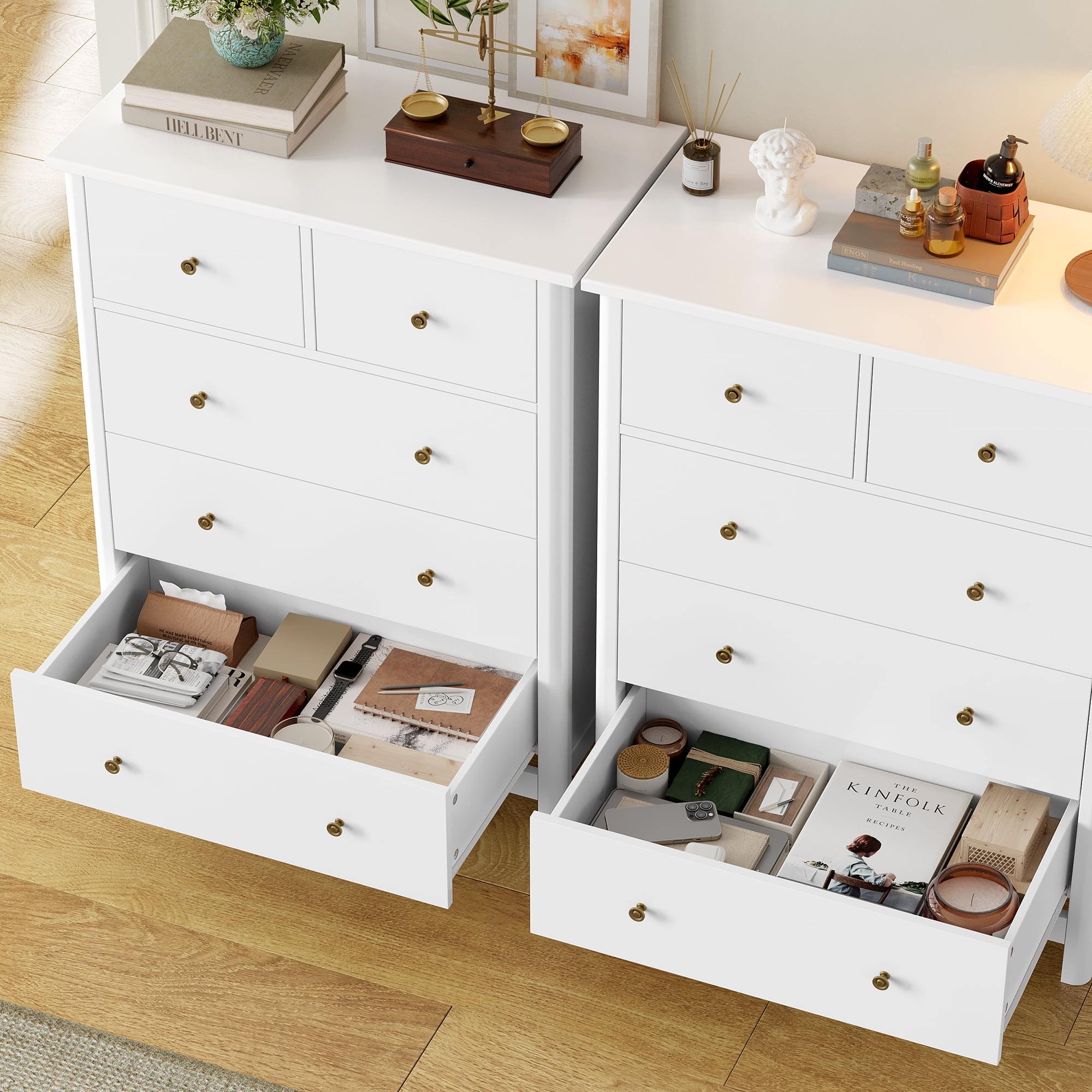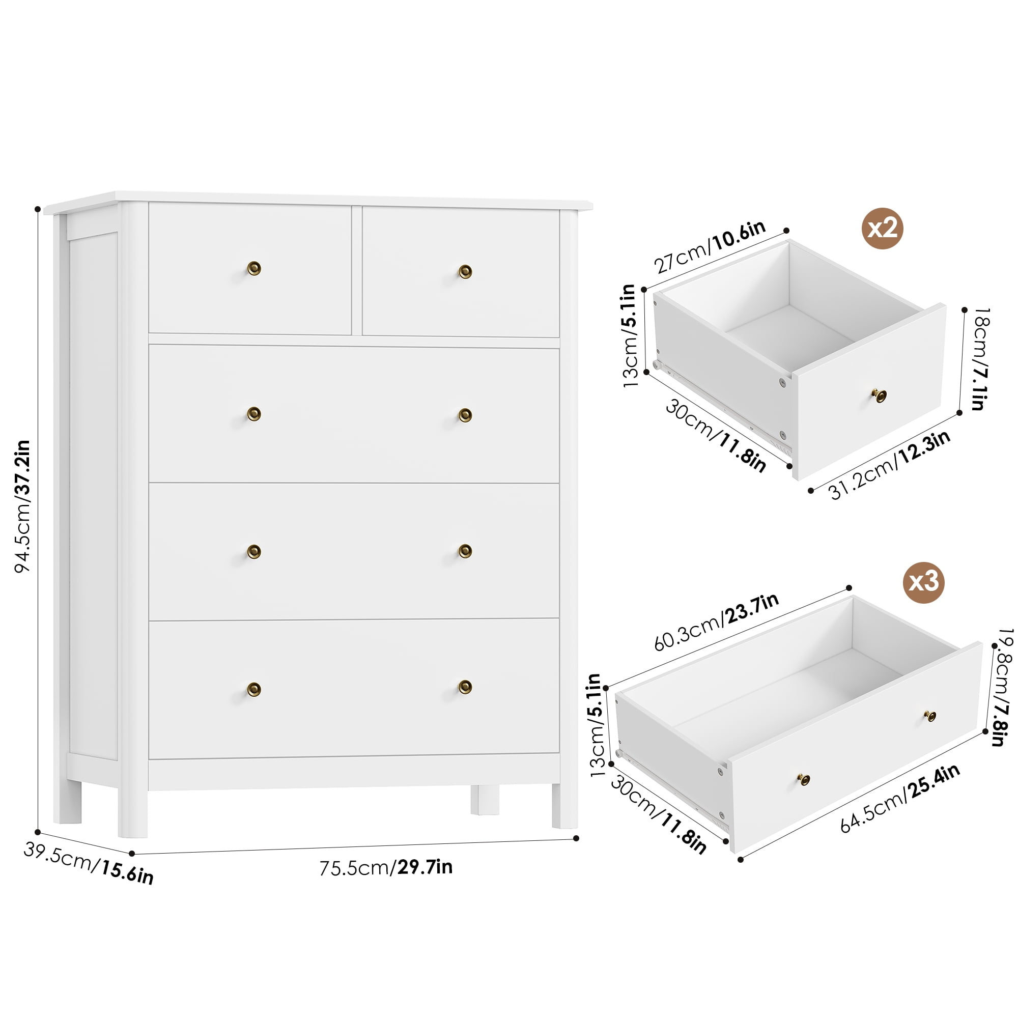 Features 【Great for Smaller Space】 Size: 29.5“ L x 15.7“ W x 37“ H. The white dresser for the bedroom is compact and does not take up much space, ideal for a space that belongs to yourselves. 【5 Drawer Dresser—Smart Storage】 The white dresser contains 2 small drawers and 3 large drawers, which provides huge space to accommodate belongings. 【Sturdy & Safety】Our 5 drawer dresser is made of high-quality MDF material with environmentally friendly paint for long-term use and is equipped with an anti-tipping device to protect your safety. 【Dresser Chest for Bedroom】Nice stylish white dresser, delicate and practical, preferable for placing in your bedrooms; highly recommended to buy two together to match the nightstand. 【Easy to Assemble & 24/7 Customer Service】 The white vertical dresser comes with the help of all mounting hardware and detailed instructions; 1 adult can complete it easily in 40 minutes. 24/7 quality customer service so you don’t have to worry about lost and damaged parts Specifications Material: MDF Drawer Handle Material: Metal Color: Ivory White Handle Color: Gold Overall Size: 29.5″ L x 15.7″ W x 37″ H Main Drawer Interior: 23.7” L x 11.2” W x 4.3” H Smallest Drawer Interior: 10.4” L x 11.2” W x 4.3” H Main Drawer Weight Capacity: 44 lbs Smallest Drawer Weight Capacity: 25 lbs Overall Product Weight: 62.17 lbs Number of Drawers: 5 Package Contents 1 x White Dresser 1 x Assembly Kit 1 x Instructions