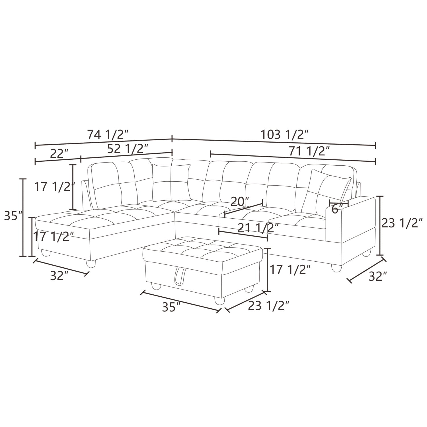 This Modern L-Shaped Couches and Sofas Set is filled with sponge and is made of soft, durable, and very comfortable synthetic leather. The seat cushion, backrest, and square armrests are designed with tufts. This 4 Seat Living Room Furniture Set is an excellent choice for your home decor. The Faux Leather Section Sofa not only provides you with a comfortable sitting posture, but also features a classic and versatile color design that perfectly complements other furniture, creating a warm and comfortable home. Our Modern L-Shaped Couches and Sofas Set have two different positioning options, allowing you to freely choose and buy according to the living room space, meeting the various living needs of different families. We have more colors and styles to choose from. The frame of this modern Section Sofa Model is made of high-quality solid wood. Solid wood frames can provide more support for sofas, making modular sofas more stable and durable. The cushion is made of high resilience foam material, which has good resilience and softness. The surface is soft and comfortable, without pilling or wrinkling. The overall size of the L Shaped Couches and Sofas is 103.5 inches (W) x 74.5 inches (D) x 35 inches (H). Space saving, durable. If you have any questions, please feel free to contact us. We are happy to serve you.