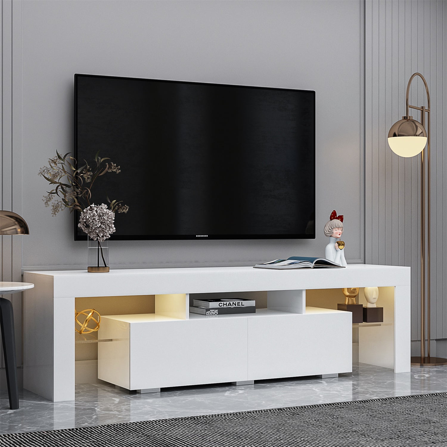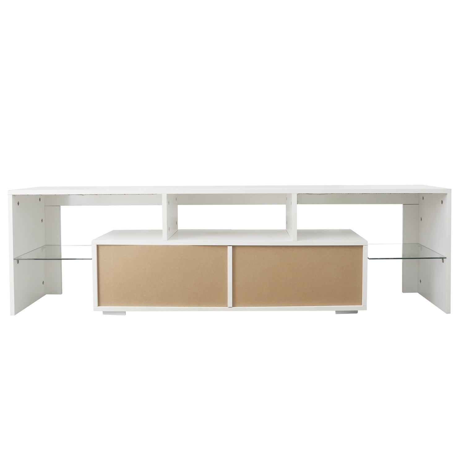 Description The entertainment center TV stand features 16 Colors LED lights system with remote ON/OFF and color control, for up to 70-inch TV screens. Suitable for decorating your living room or bedroom, small apartment.Great minimalist and central entertainment feature 2 glass shelves and the LED lights system with ON/OFF switch control, for up to 70-inch TV screen. The TV Cabinet is sturdy and durable and the edge band finishes design takes extra energy and time in the manufacturing process, ensure modern tv stands are super elegant and contemporary.Our Television Stand is suitable for your lounge room, living room, bedroom and more places. This TV Stand for flat screens fits in well with most home decors, it is ideal for use in living rooms to hold the TV and some decorations such as vases and photos at the tops. It is also a housewarming gift for friends and family. Specifications Main Material:Particle Board Product Dimensions Assembled Length (in.):63.00 Assembled Width (in.):13.80 Assembled Height (in.):17.70 Weight (lbs):72.70 Load-bearing: 55KG/121.3lbs