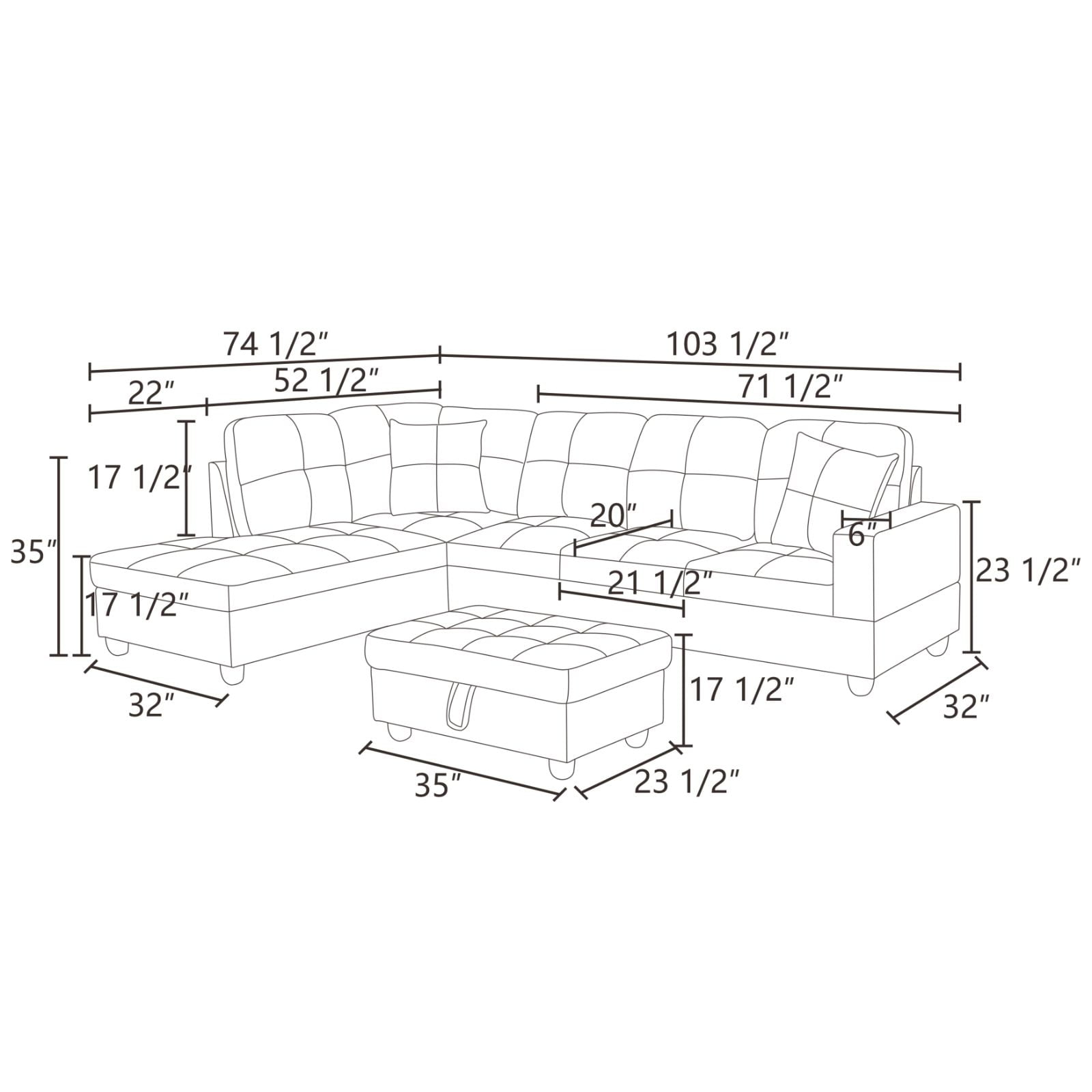 The Modern Faux Leather Sectional Couch and Sofa Set comes with a sofa and lounge chair, and our sofa design comes with a left and right chain. You can choose different designs based on the needs of your house. The combination sofa is very easy to assemble. This L Shaped Sectional Sofa is a great choice for your home decoration. The brown PU leather sofa not only provides you with a comfortable sitting feeling, but also perfectly matches with other furniture to create a warm and comfortable home. The frame of this L Shaped Section Sofa is made of high-quality solid wood. Solid wood frames can add more support to the sofa, making the modular sofa more stable, durable, and comfortable. The length of the lounge chair is enough for you to lie down for a while in your free time. The cushion is made of high resilience foam material, which has better resilience and softness. The Modern Faux Leather Sectional Couch and Sofa is filled with high-quality cotton, which is fluffy and soft. The surface of PU leather is soft and waterproof. The overall size of the Living room Furniture Sets is 103.5 inches (W) x 74.5 inches (D) x 35 inches (H), the back height is 17.5 inches. If you have any questions, please feel free to contact us. We are happy to serve you.