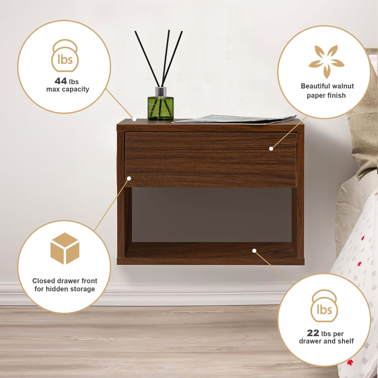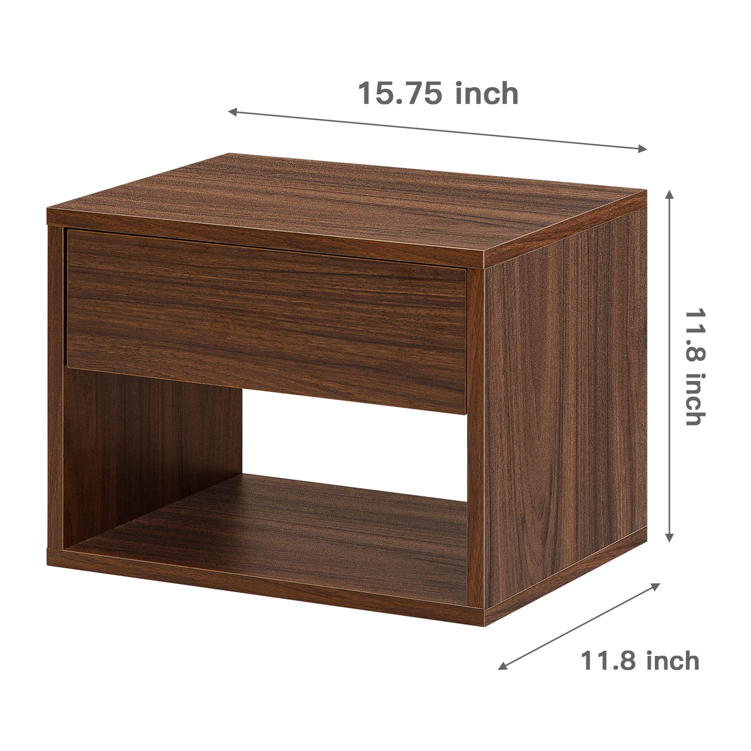 Description This is the perfect side table to showcase all your decor with a modern look, organize a comfortable functional area and bring clean lines to your room. With closed and open storage. Perfect for bedrooms, small spaces, apartments, and a perfect gift for students living in dorms. This shelf is also highly versatile and can be used as a nightstand, floating dresser or end table. Floating nightstand provides you more space to storage in your bathroom and it’s easier to vacuum the floors underneath. Spacious Yet Compact: Measuring at 15.74″*11.81″*11.81″ – This durable wooden floating bedside table can fit all of your bedroom essentials like lamps, cell phone chargers, books, diffusers, and more. Multi-Purpose: Not only is our handmade rustic décor wall anchored stand great for the bedroom, but its also a fantastic storage option for other areas of the house as well including as a side table, wall shelf or floating shelf night stand. Multifunctional Storage and Display Wall Shelf:Simple and functional, book shelf and more at anywhere you want, bedroom, living room, entryway, kitchen, bathroom, office, laundry and more. Ideal Gift for Choice:This stunning and cute floating nightstand could be a great gift for friends, family and colleague on birthday, Christmas, Thanksgiving or New Year. Space Saving: Modern nightstand with both closed and open storage. The light and simple lines of the nightstand with its neutral and natural tones makes it a perfect element to blend well with any furniture. Specification Size: 15.74″*11.81″*11.81″ Drawer internal size: 12.4″*9.25″*2.55″ Bottom storage layer space: 14.56″*11.81″*6.06″ Color: Walnut Material: PB board Table top load-bearing weight: 45 lbs Drawer load capacity: 22 lbs Base plate load-bearing: 22 lbs