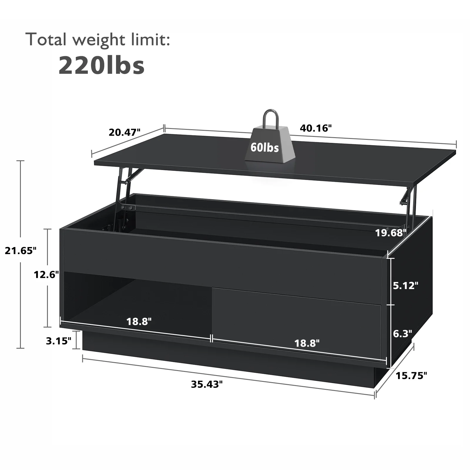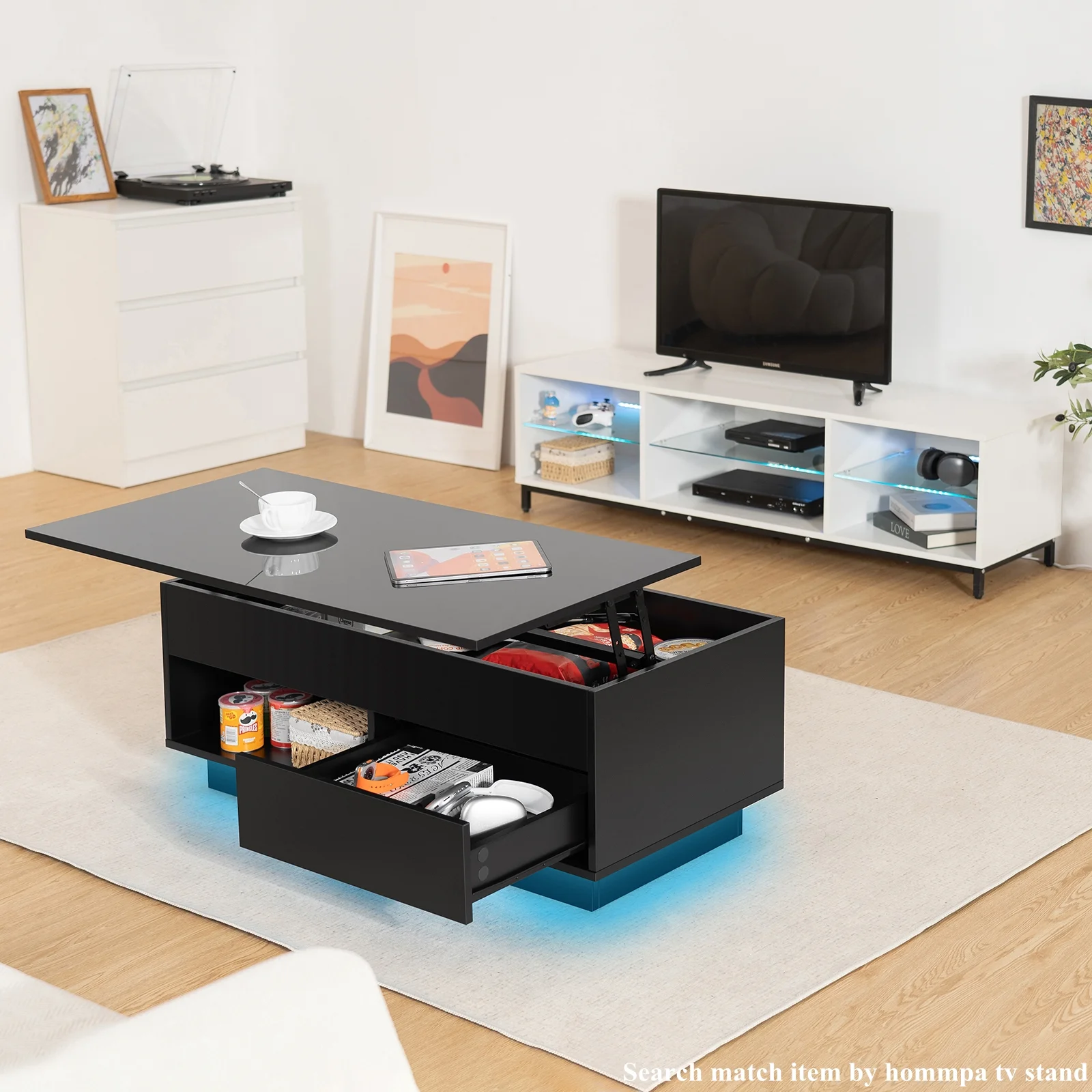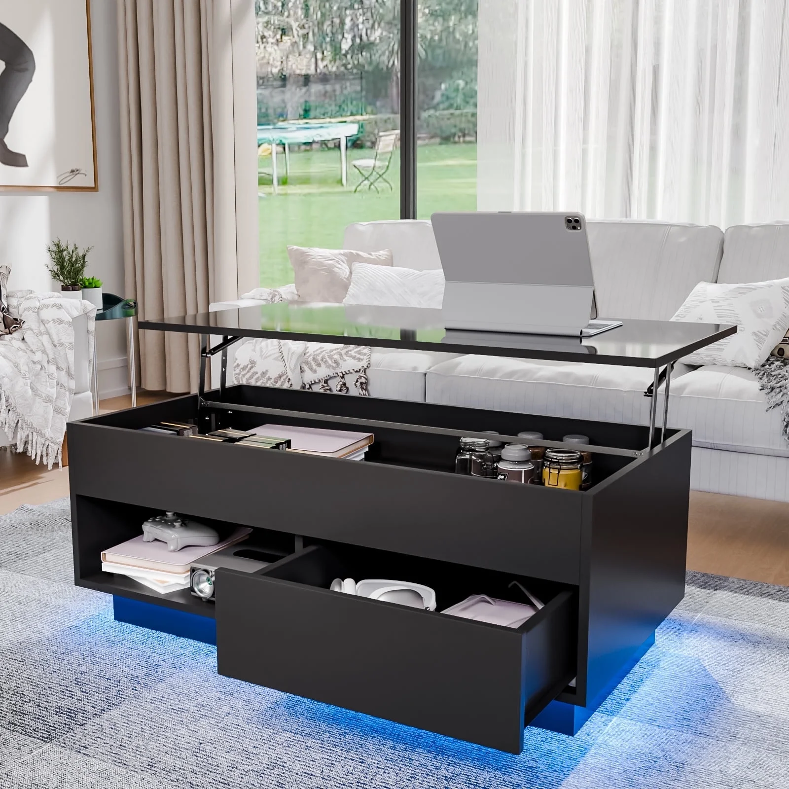 Key Features: Lift Top Design: Our coffee table boasts a convenient pneumatic lifting mechanism that enables you to effortlessly adjust the desktop height from 15.74″ to 21.65″. With this lift top table, you won’t need to lean forward too much to comfortably use your laptop, write, or dine while relaxing on the couch. Durable Build & High Gloss Desktop: The rectangle coffee table features a robust, quiet pneumatic lift mechanism that effortlessly raises the desktop for added height. Constructed from P2 grade particle board, it includes four transparent corner protectors to prevent collisions, and its high-gloss waterproof desktop ensures easy maintenance. Storage Coffee Table: Featuring three storage compartments, including a hidden one beneath the lift table for books, an open shelf, and a drawer, our center table provides ample space to keep your essentials organized and out of sight. Bid farewell to clutter and welcome a tidy living space. Coffee Table with RGB LED Lights: Use the remote or smart app to easily adjust colors, brightness, and speed. Create a captivating atmosphere with features like music sync, microphone options, timers, and more, all controllable via the app within a 15-meter range. Two-way Lifting Direction Installation: The desktop can be assembled on either the left or right to suit different sofas with ease. It includes all the necessary hardware and an instruction manual to assist you in the straightforward assembly process. ◆Specifications: Material: P2 grade particle board with metal hardware Assembled Size (L x W x H): 39.37″ L x 19.68″ W x (15.74-21.65)” H Storage Included: Hidden Storage Compartment & 1 Open Shelf & 1 Drawer Height Adjustment Mechanism: Lift Top Desktop Shape: Rectangular Overall(lower down): 220lbs Assembly Required: Yes Color: Black, White ◆Package Included: 1 x Lift Top Coffee Table 1 x Fittings Set 1 x Assemble Manual 1 x LED Light Set