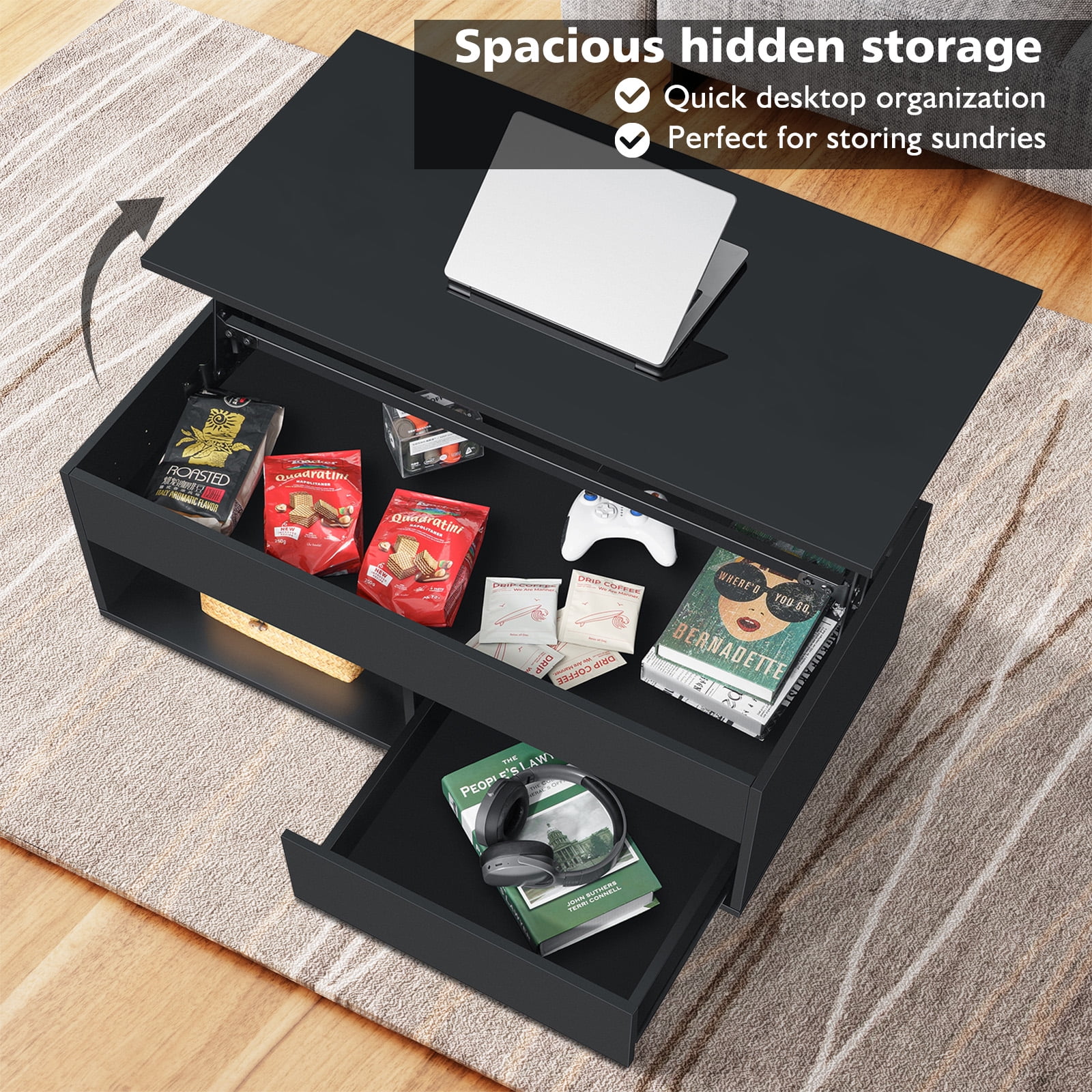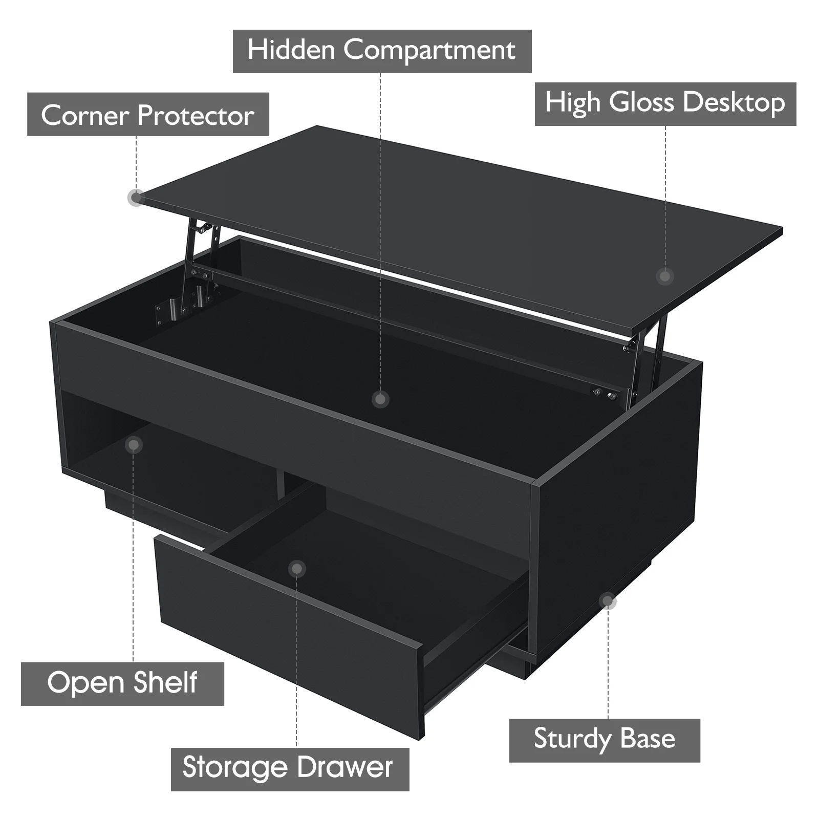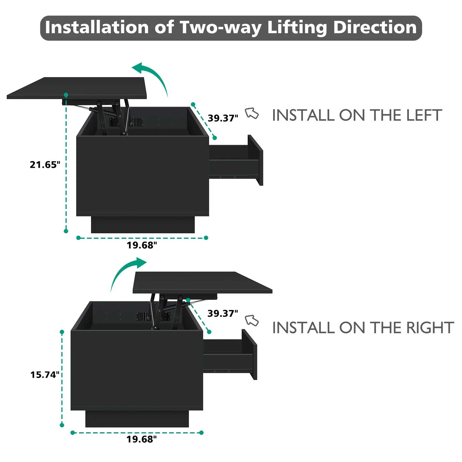 Key Features: Lift Top Design: Our coffee table boasts a convenient pneumatic lifting mechanism that enables you to effortlessly adjust the desktop height from 15.74″ to 21.65″. With this lift top table, you won’t need to lean forward too much to comfortably use your laptop, write, or dine while relaxing on the couch. Durable Build & High Gloss Desktop: The rectangle coffee table features a robust, quiet pneumatic lift mechanism that effortlessly raises the desktop for added height. Constructed from P2 grade particle board, it includes four transparent corner protectors to prevent collisions, and its high-gloss waterproof desktop ensures easy maintenance. Storage Coffee Table: Featuring three storage compartments, including a hidden one beneath the lift table for books, an open shelf, and a drawer, our center table provides ample space to keep your essentials organized and out of sight. Bid farewell to clutter and welcome a tidy living space. Coffee Table with RGB LED Lights: Use the remote or smart app to easily adjust colors, brightness, and speed. Create a captivating atmosphere with features like music sync, microphone options, timers, and more, all controllable via the app within a 15-meter range. Two-way Lifting Direction Installation: The desktop can be assembled on either the left or right to suit different sofas with ease. It includes all the necessary hardware and an instruction manual to assist you in the straightforward assembly process. ◆Specifications: Material: P2 grade particle board with metal hardware Assembled Size (L x W x H): 39.37″ L x 19.68″ W x (15.74-21.65)” H Storage Included: Hidden Storage Compartment & 1 Open Shelf & 1 Drawer Height Adjustment Mechanism: Lift Top Desktop Shape: Rectangular Overall(lower down): 220lbs Assembly Required: Yes Color: Black, White ◆Package Included: 1 x Lift Top Coffee Table 1 x Fittings Set 1 x Assemble Manual 1 x LED Light Set