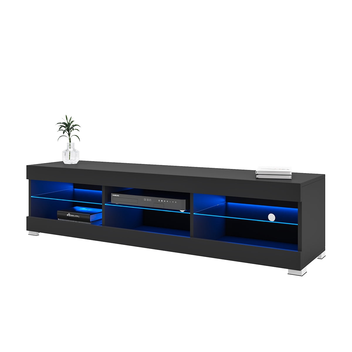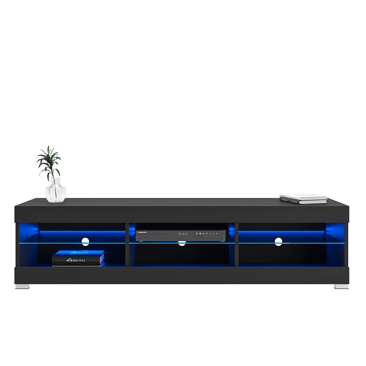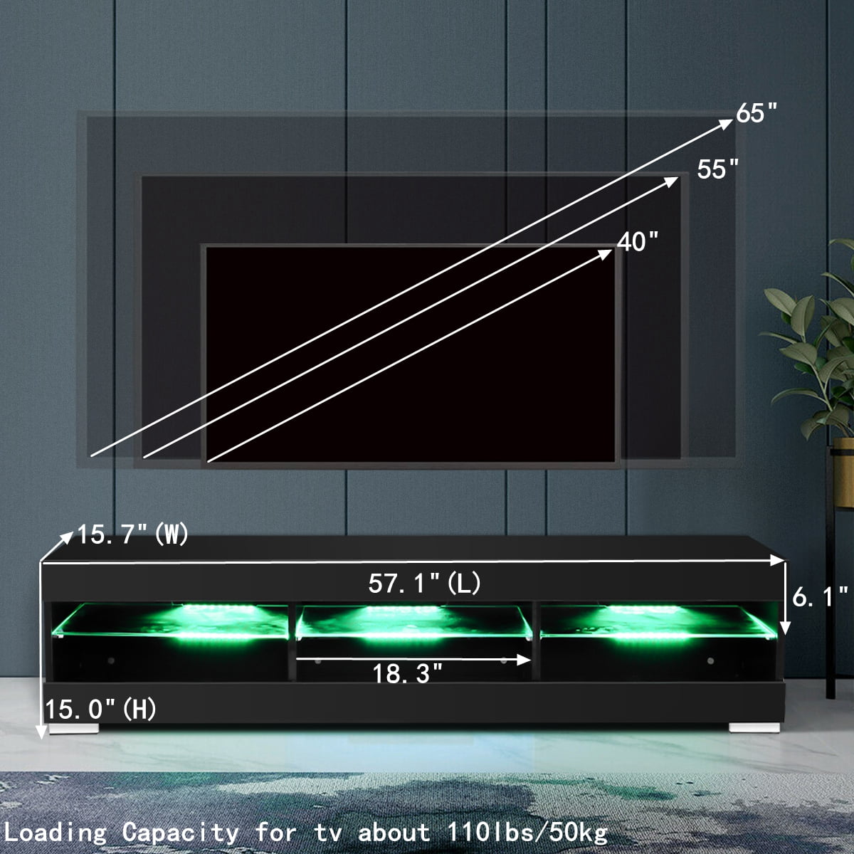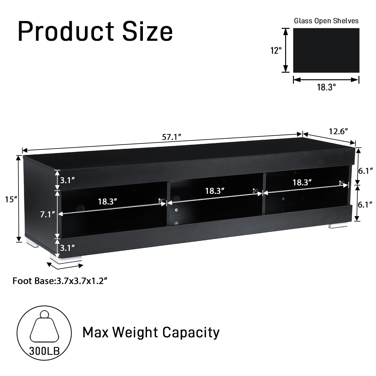 RGB LED Lighting: Enhance your viewing experience with the RGB LED lights, offering multiple color options that can be easily adjusted using the remote control or an app, creating a vibrant and personalized atmosphere in your room and living room. Ample Storage Space: With six open compartments, this TV cabinet offers generous storage capacity for your gaming consoles, CDs, magazines, and more. Its versatility makes it an ideal choice for various rooms, including the living room, bedroom, and study room. Suitable for TV screen sizes ranging from 40 to 65 inches. Versatile TV Unit: This multi-functional TV stand serves as a television stand, television console, and media cabinet, providing a convenient and stylish solution for your entertainment needs. Sturdy and Eco-Friendly Construction: Crafted from high-quality, eco-friendly particle board, this TV table ensures both durability and sustainability. Its excellent structural design enhances stability, providing a secure platform for your television and other accessories. Perfect Fit for Up to 65-inch TVs: Designed to accommodate TVs up to 65 inches, this media cabinet offers a suitable size for your large-screen television. It comes with easy assembly instructions, allowing for a quick and hassle-free setup. Specification: Material: E1 15mm particle board + Glass + LED Lights With Multi-Colour RGB LED Backlights 3 Glass Shelves – diversified storage space Color: White / Black / Black & Gray Overall Size:57 x 15 x 13 Inches