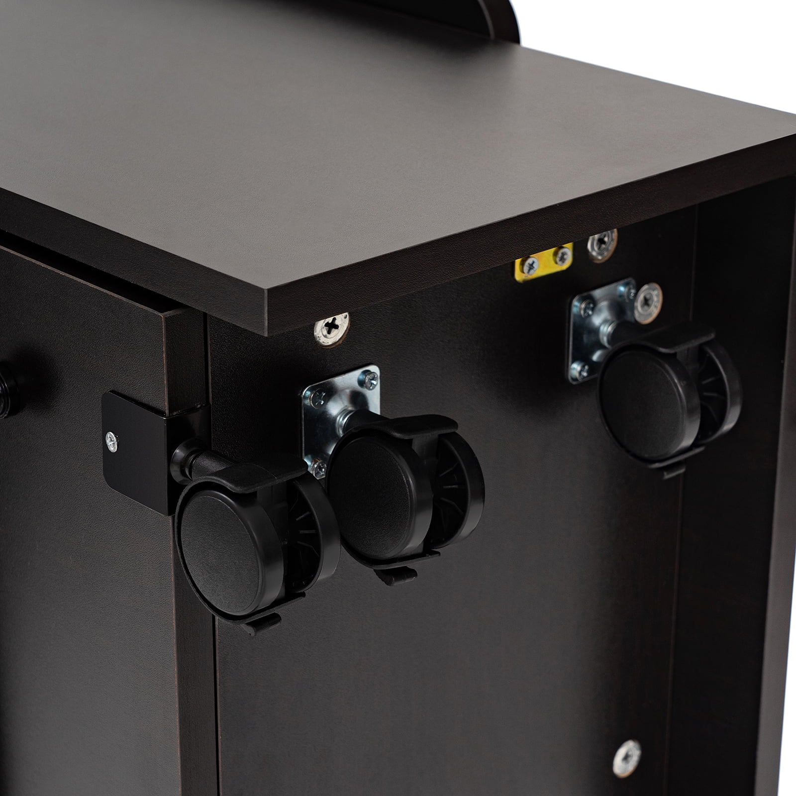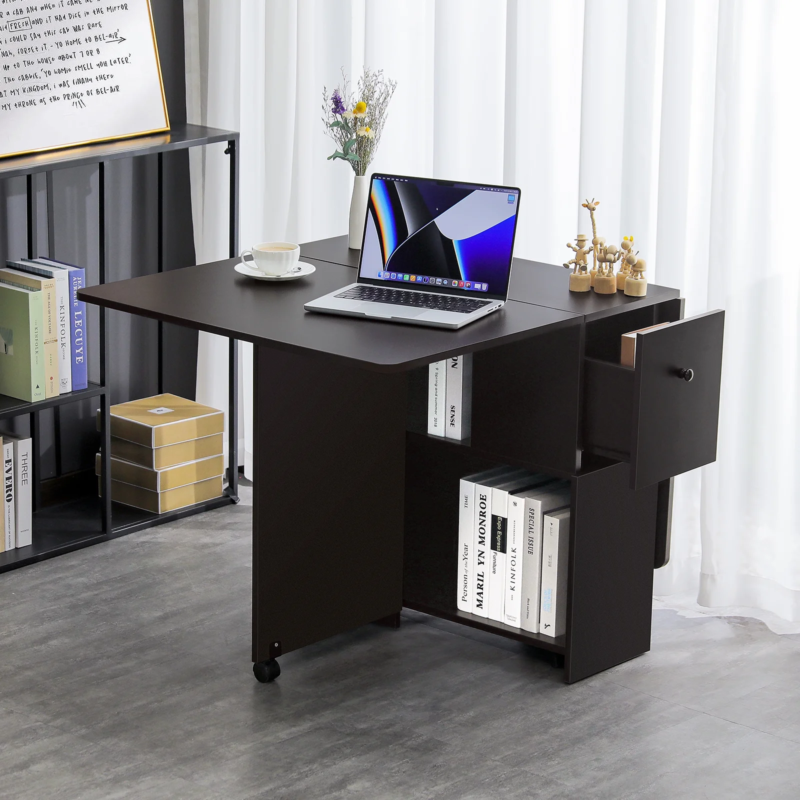 Specification: Material: Particle Board Finish/Color: Black Walnut Veneer Overall Table Dimensions: 55.12″L x 31.5″W x 29.53″H Seating Capacity: Seats 2-6 People Assembly Required: Yes Care & Clean: Wipe clean with a damp cloth, and wipe dry with a clean cloth. Product Description -With a foldable design, the table can be folded into three forms. Foldable table can be used as dining table, office desk, console table, ect. -When the dining room table is unfolded, the table is spacious and suitable for 4-6 people for dinner. -2 large drawers and 2 extra storage racks can store cutlery, kitchen supplies, office supplies and others, perfect for small apartments or small spaces. -The bottom of the folding kitchen table is equipped with 6 swivel caster wheels with a brake, which is very flexible and sturdy, and is easy to move. -Space saving dining table features a black walnut finish for understated appeal which never goes out of style. -The smooth surface is easy to clean, and if there is any dirt, you can easily clean it with a damp cloth. Feature: 【Space Saving 3 Folding Modes】: Folding dinning table can be easily adjusted be fully open, half open and fully fold. The folded size is 13.3″x31.5″x11.4″, which is easy to store and ideal for small spaces. 【2 Drawers and 2 Storage Racks】: The 2 drawers and 2-tier storage racks provide extra storage space. It is great for storing napkins, snacks, and tableware, cutting the clutter in your kitchen or living room. 【Upgraded 6 Swivel Casters】: Equipped with 6 lockable swivel wheels, it can be easily transported and fixed anywhere, very flexible and sturdy. Comes with a lockable red stopper for stability while you use it. 【Versatile Dining Table】: Foldable dining table can be used as a side table against the wall when not in use. When you open it, you can convert it to either a 2 to 6 seater as a dining table, kitchen table, writing desk, console table, computer table, or study desk. 【Premium Material Quality】: Made of 15mm premium grade E1 particle board with an understated black walnut finish. Waterproof, stain-proof, scratch-resistant, heat-resistant, easy to clean and has a strong and firm structure. Package included: 1 x Foldable Dining Table 1 x Screws Accessories Parts
