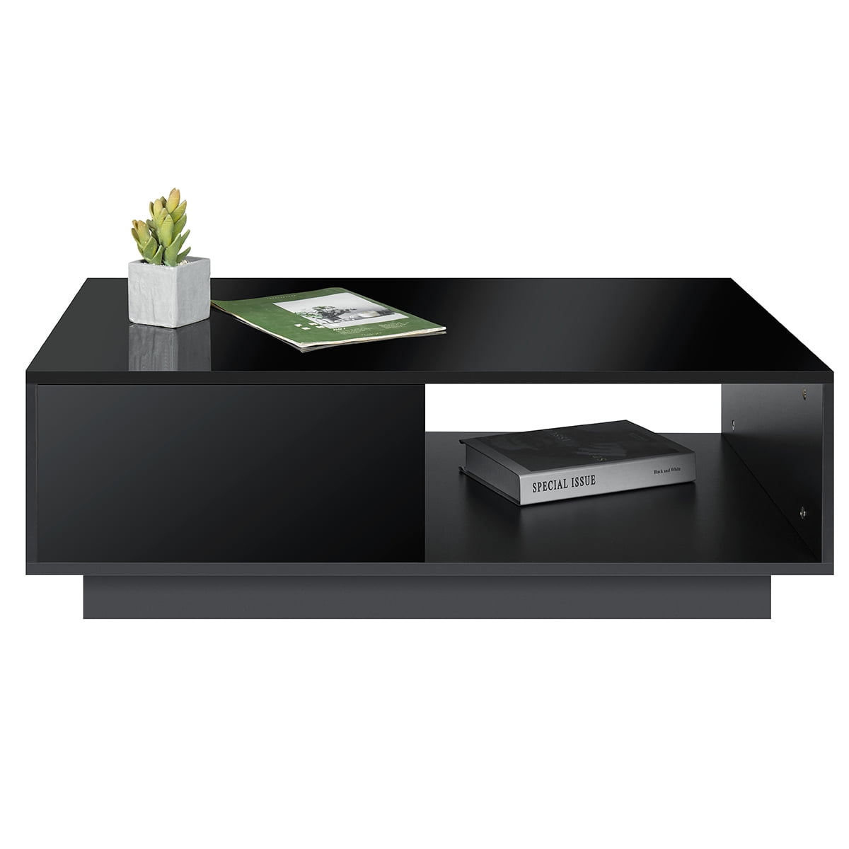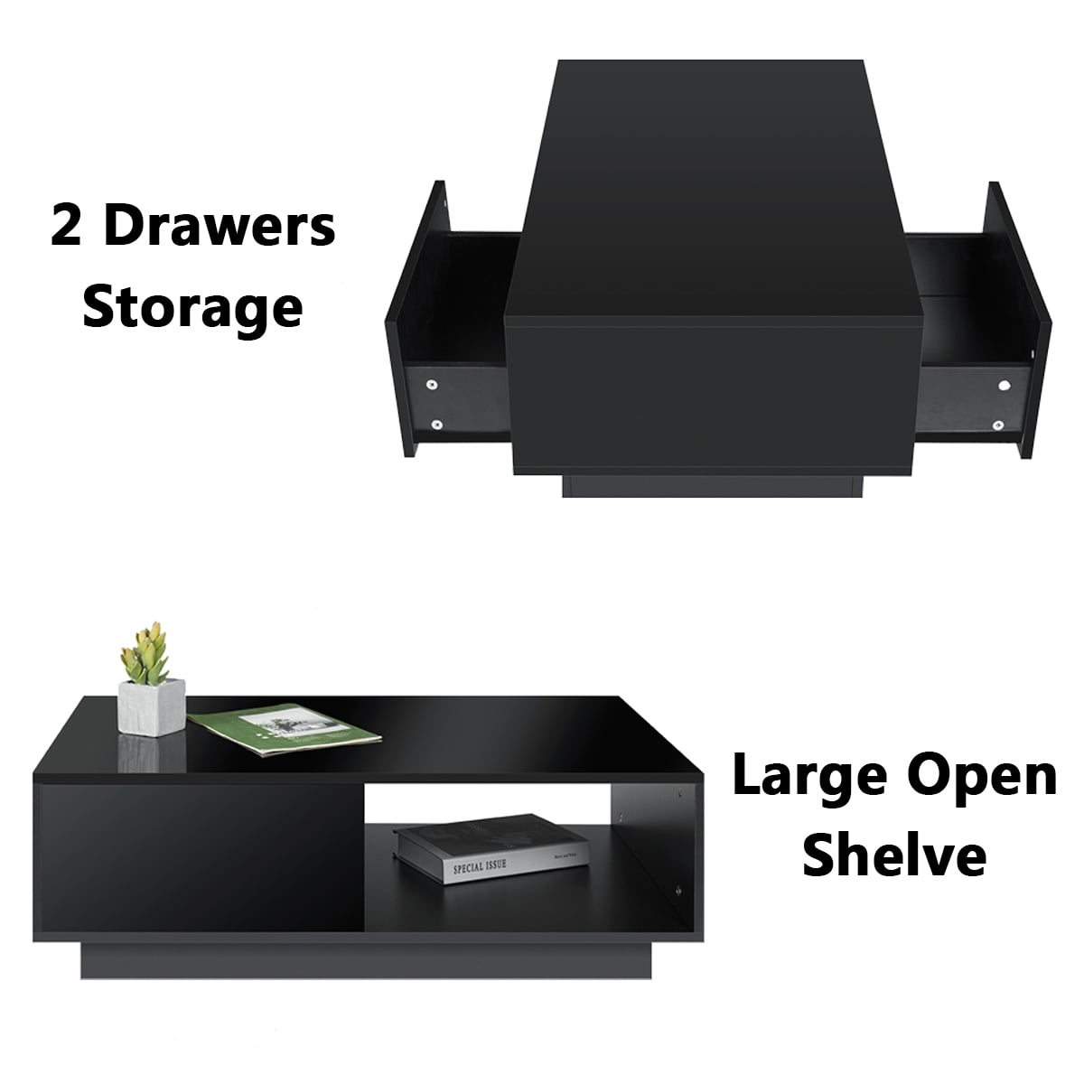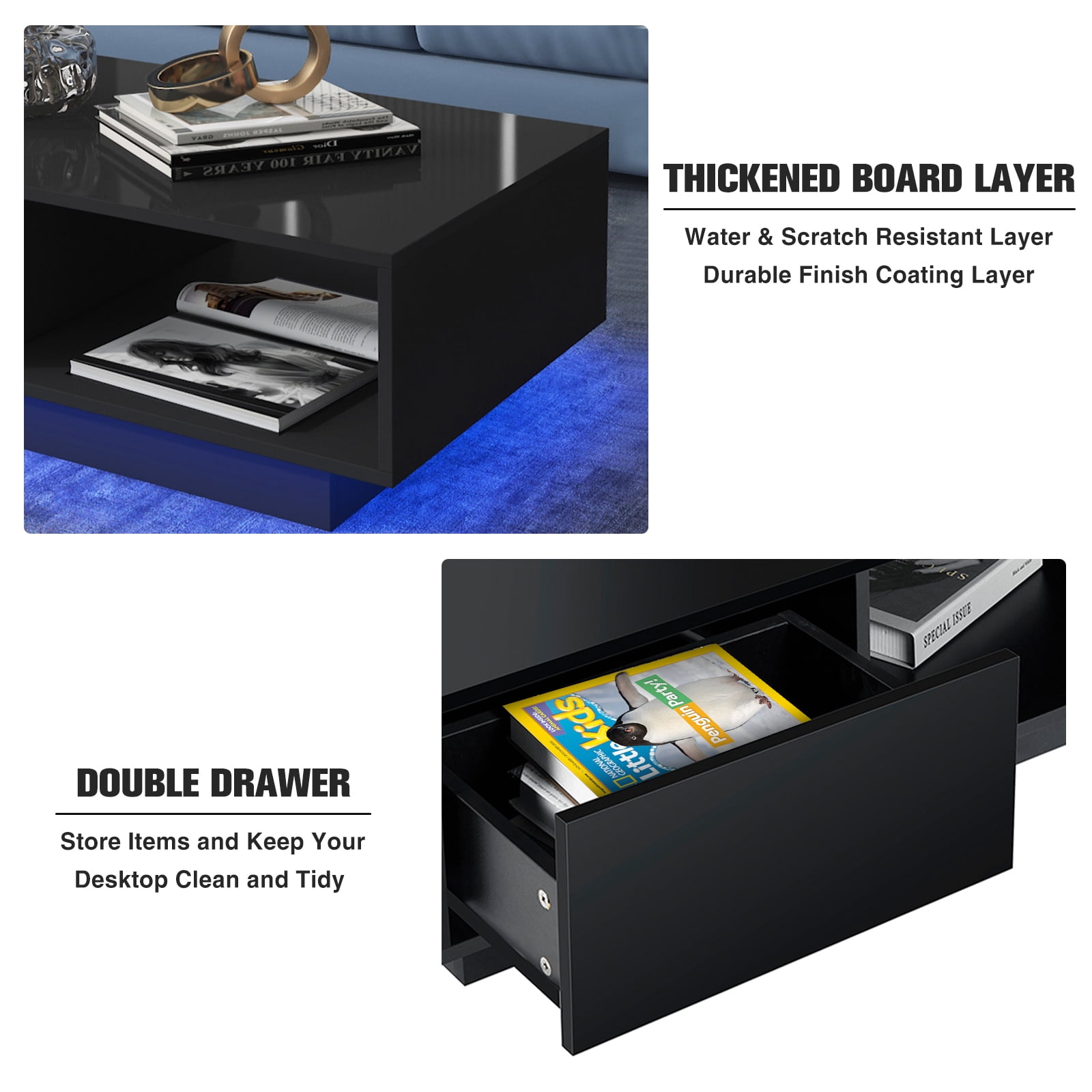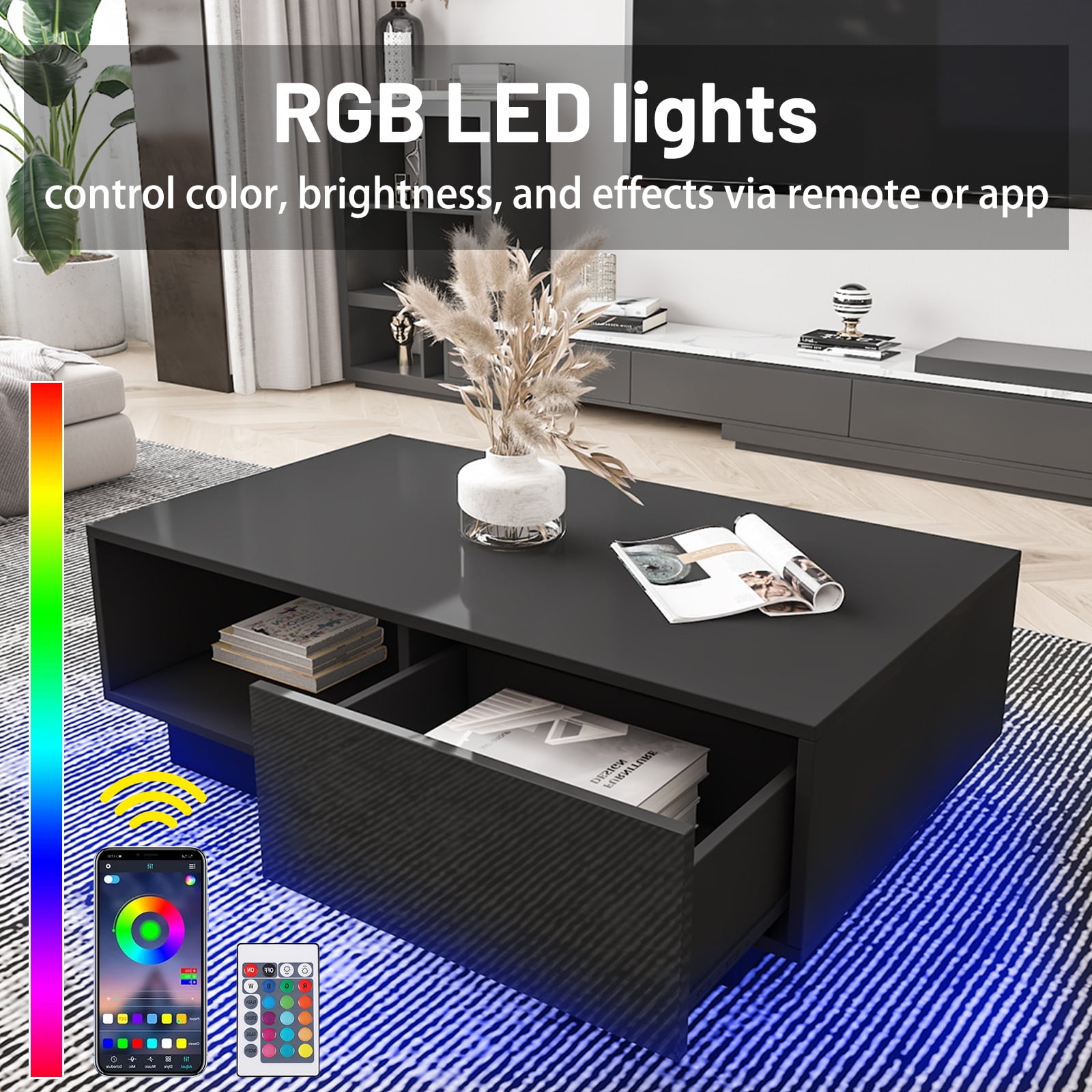 RGB LED Light: Our RGB LED coffee table with a convenient remote control sets the ideal atmosphere for any occasion, from cozy nights to lively gatherings. Control the color and brightness effortlessly through our dedicated mobile app for ultimate convenience. Easy Access and Ample Storage: Enjoy the convenience of double-sided drawers, providing easy access to your belongings from both sides. With four drawers and two grids included, you’ll have ample storage space to keep your items organized and within reach. High Glossy and Easy to Maintain: The high gloss finish adds an elegant touch to your room while being easy to clean. Simply wipe it with a damp cloth to keep it looking pristine. Quality and Versatile Design: Crafted from particle board material, our coffee table is built to last. Its sturdy construction ensures durability, while its versatile design allows it to serve as a coffee table, center table, side table. It seamlessly fits into any room decor. Convenient Assembly: With pre-installed drawer rails, our coffee table is easy to assemble, saving you time and effort. The product size of 37.4″L x 21.7″W x 13″H ensures it fits perfectly in your space. ◆Specifications: Shape: Rectangular Table design: Coffee Table Special Feature: LED Light (Plug in Wired LED Light) Storage Included: 2 Drawers and open shelf Product Dimensions: 37.4L x 21.7W x 13H inch Size of Drawers: 16.3 x 10.2 inch Weight Capacity: 200 lbs Assembly Required: Yes Color: Black / White / Gray & Black Finish: High Gloss (Only desk top & drawer surface is high gloss ) Included Components: Fitting Set & Assembly Instruction