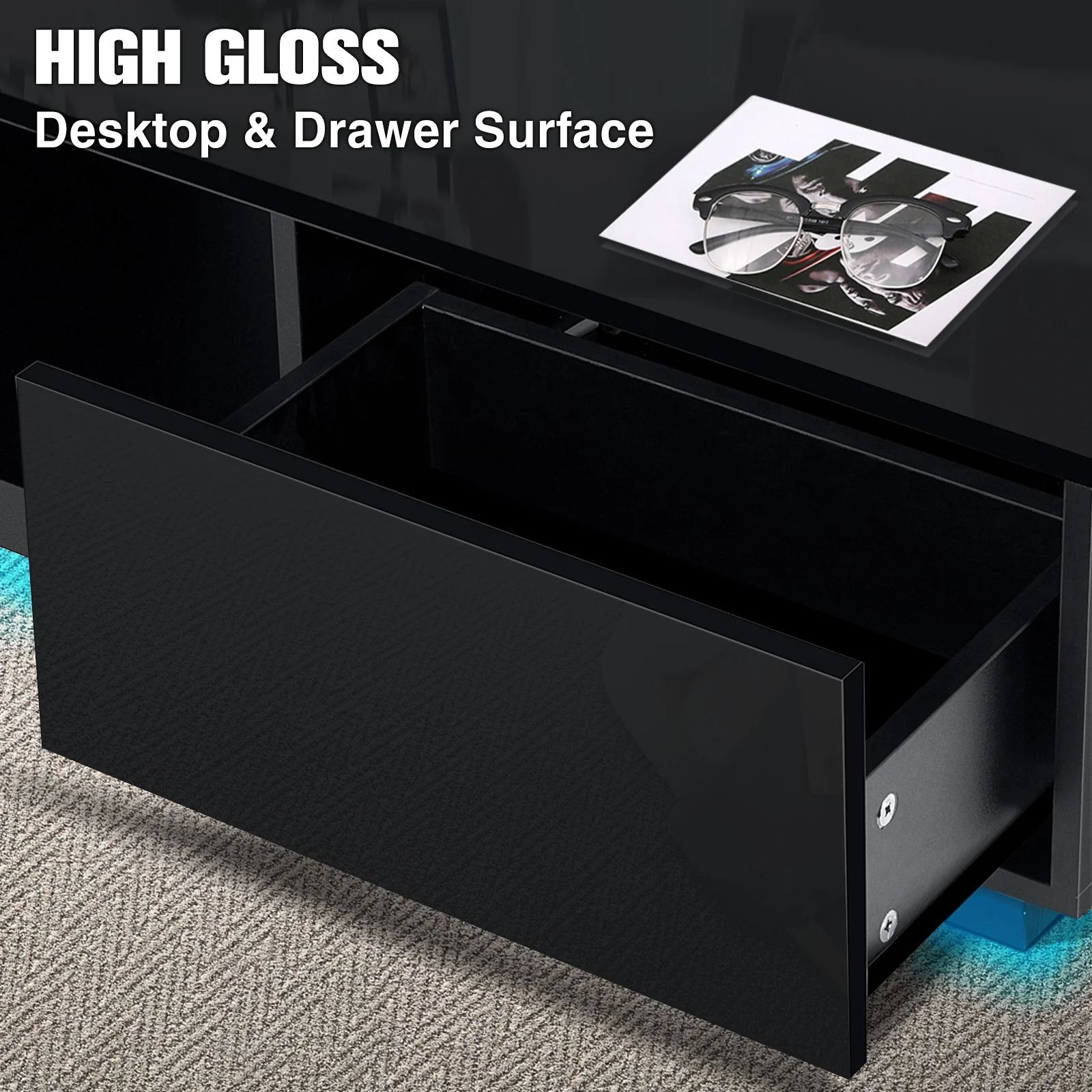 Hommpa Furniture | Experience style, convenience, and versatility in one Upgrade your space with our High Gloss Coffee Table with LED Light. It adds elegance and style with easy maintenance. The glossy finish on the desktop and drawer surfaces enhances its visual appeal. With multi-color LED lighting controlled by remote or app, you can set the perfect ambiance effortlessly. Stay organized with double-sided drawers for easy storage. Crafted from durable materials, this table ensures stability. Easy setup with included manual and accessories.