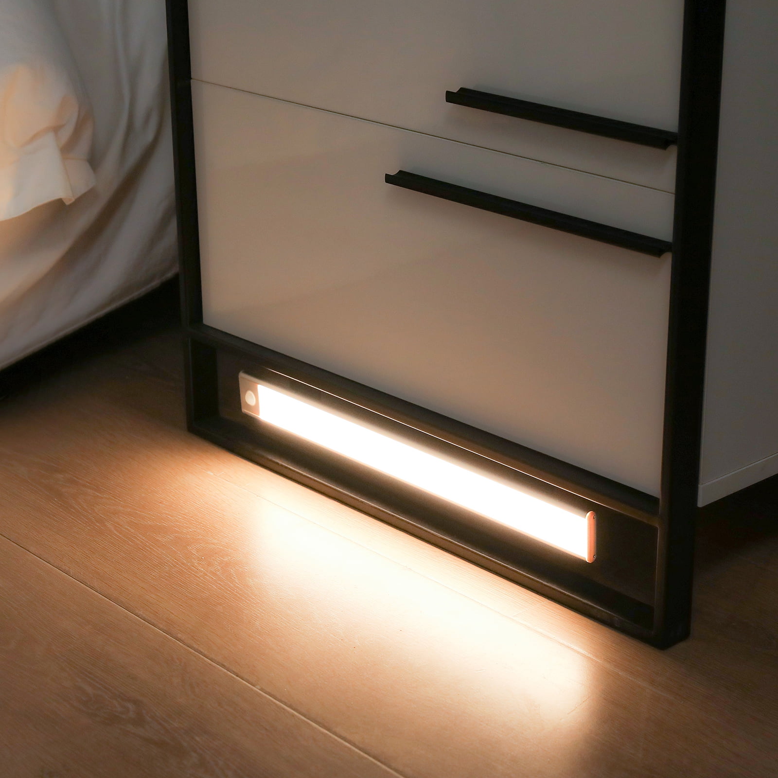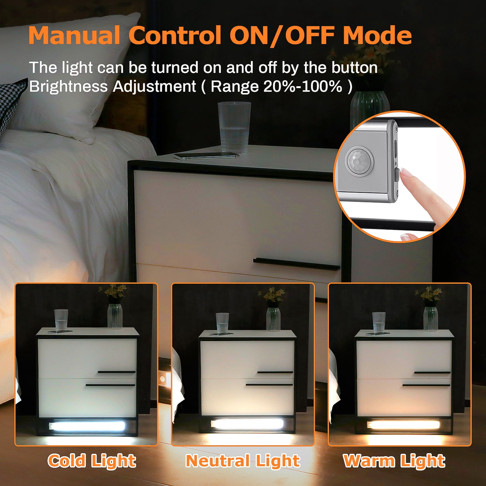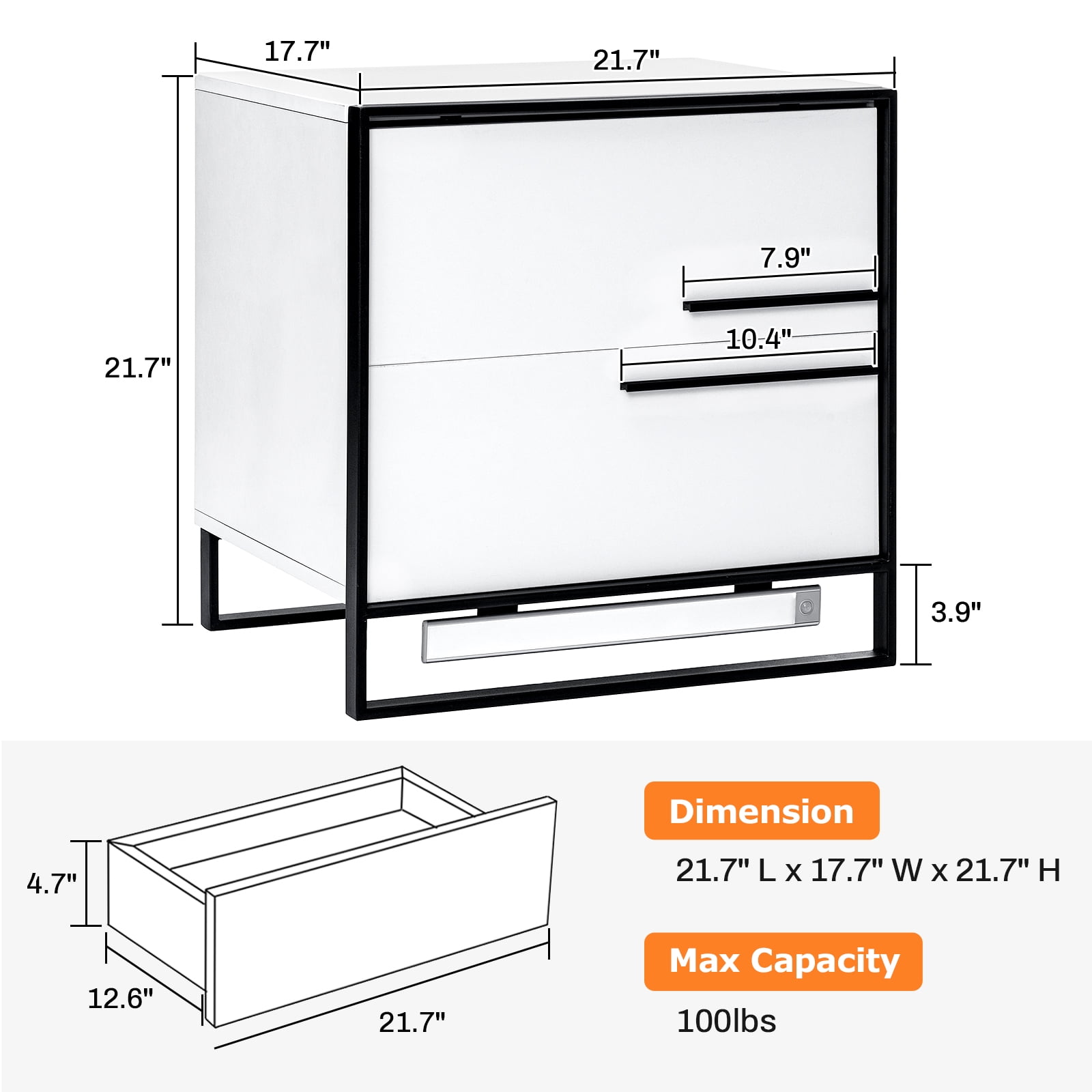 KEY FEATURES: ✤Durable and Sturdy Material Hommpa white nightstand is the made of high quality 15mm E1 Particleboard. The board waterproof, easy to clean and wipe.Overall Size:21.65”Lx17.72”Wx21.65”H ✤3 Color Automatic Sensor Light 2 lighting modes: Auto-sensing /manually controlled mode.Nightstand with 3 color LED backlight (white/neutral/warm light). Wireless auto sensor light built in 1100mAh large capacity battery and support USB Charging. In a dark environment, sensor light will automatically sense human movement within the range of 0-3m/120° and automatically turn off after 20 seconds without moving. When fully charged, lamp can last about 3 hours in ON mode ✤Metal Frame & 3 section Slide Rails Modern led nightstand table adopts metal frames as the base. The increases the firm stability of the led night stand, allowing it to hold up to 100 lbs.2 drawers with smooth and silent 3 section metal rails, which can enhance the bearing capacity of the drawers ✤Enough Storage Space 2 drawers with metal handle storage design keep your bedroom organized.The desk top allow for your phone,alarm clock and offer plenty of space for organizing small items ✤Easy Assembly Bedroom furniture led night stand comes with complete and detailed instructions and clearly numbered parts, which can be quickly completed according to the instructions SPECIFICATIONS: SPECIFICATIONS Brand Hommpa Features 3 Color LED Lamp, Automatic Sensor Light Material Particleboard; Metal Frame Pack 1 Pack Drawer Front Finish High Gloss Side Finish Melamine Handle Metal Handle Lighting Included Yes Is Assembly Required Yes Assembled Product Weight 46.3 lbs Assembled Product Dimensions 21.65”Lx17.72”Wx21.65”H Overall Load Bearing 100 lbs Single Drawer Load Bearing 30 lbs Light Automatic Sensing Range 0-3M /120° Sensing Angle Motion Sensor Light Color White Light/ Neutral Light/ Warm Light LED Light Features Wireless, USB Charging, Rechargeable Package Includes 1 x Nightstand (Board with Number) , 1 x Hardware Accessories with Number, 1 x Installation Manual, 1 x Screwdriver