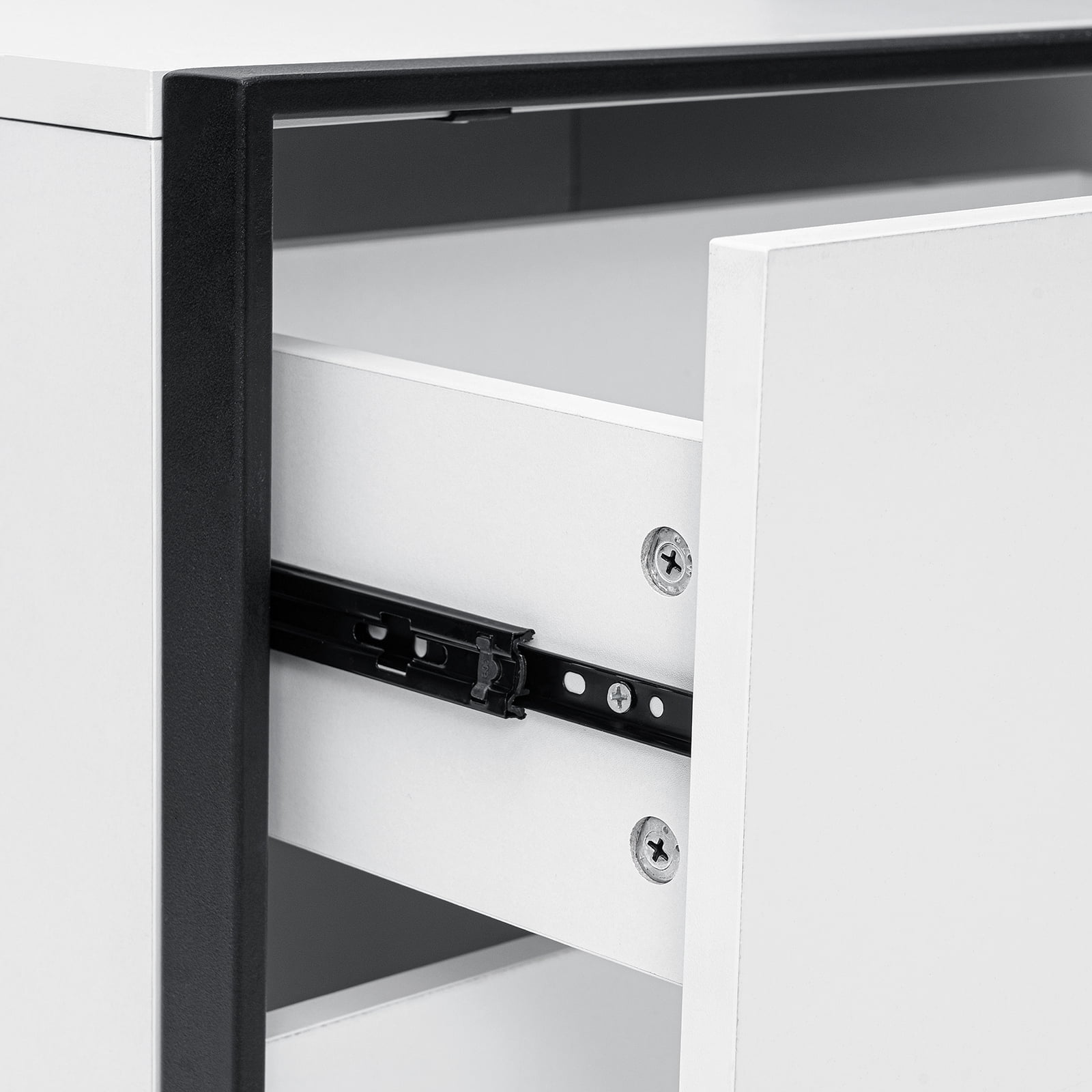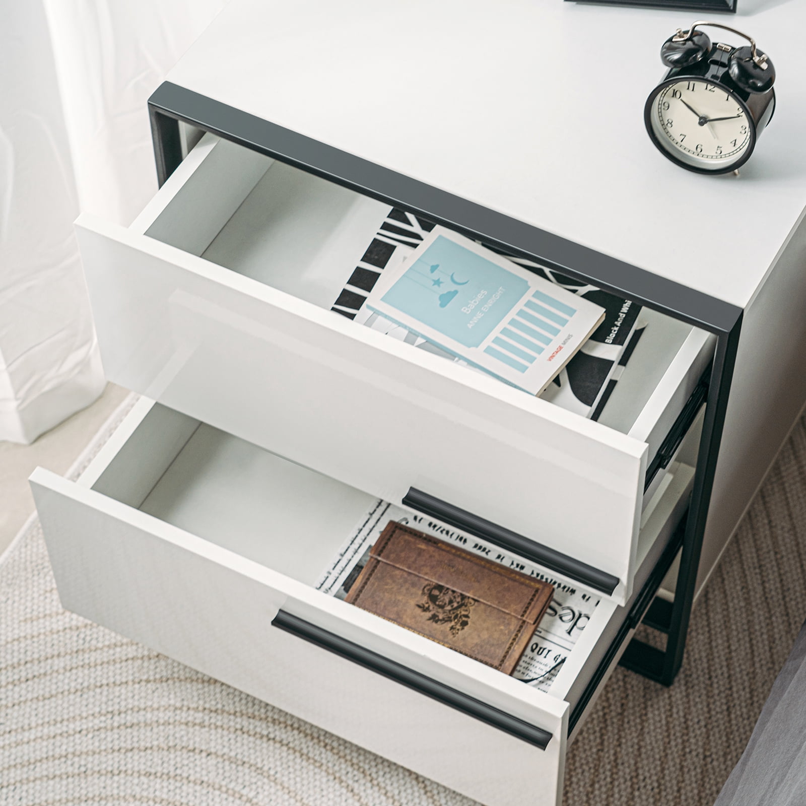 Hommpa LED nightstand made of 15mm E1 particleboard with surface melamine veneer, 2 drawers with high gloss drawer fronts, high quality waterproof finish easy to clean and maintain. The desk top holds your cell phone, desk lamp and other bedroom items. White bedside table comes with 3 color adjustable LED built in motion sensor lights that can be used as night light lighting. The drawers of the modern night stand are equipped with 3 section slide rails for stronger support and smoother drawer movement. Smart bedside table is suitable for bedroom, living room, dining room, office.