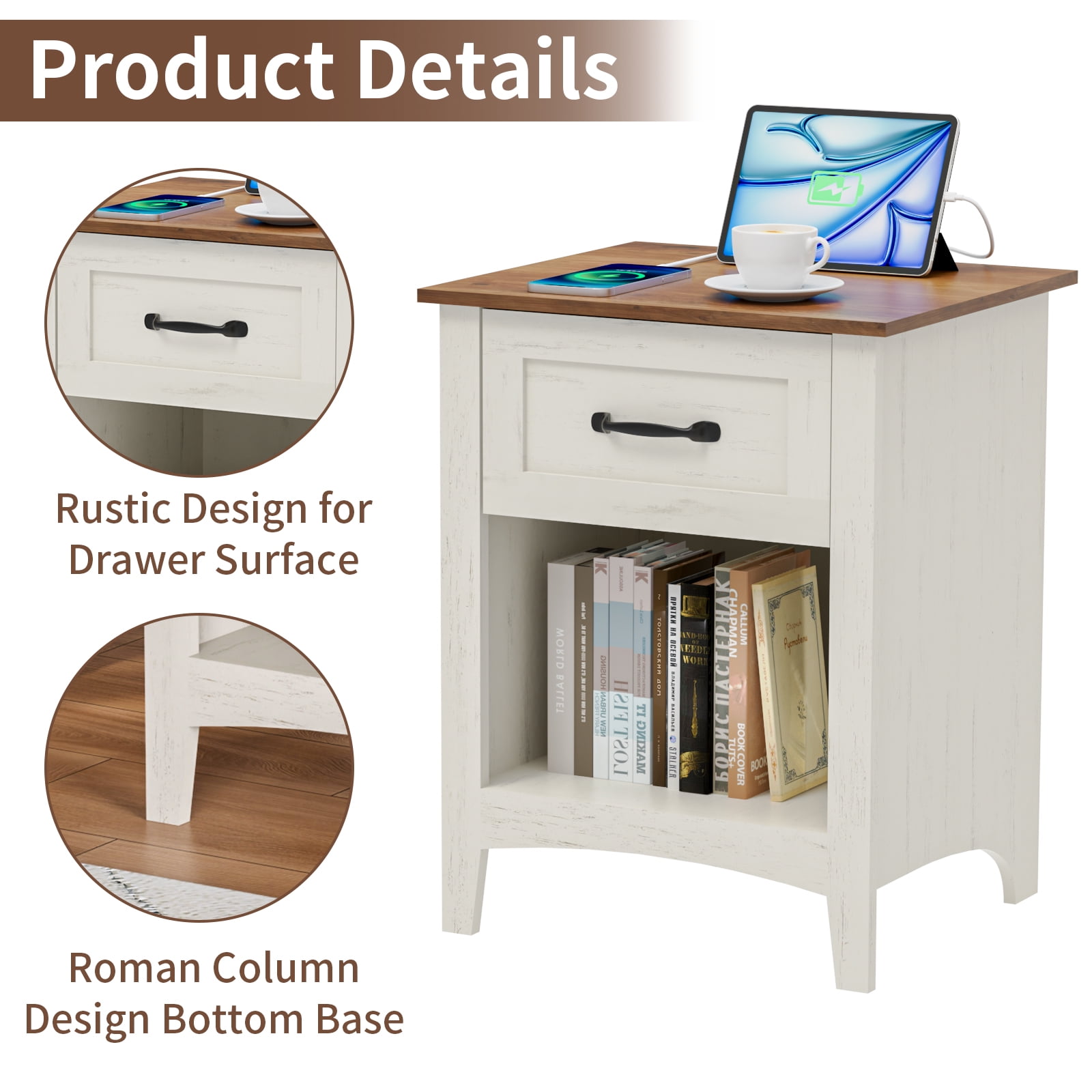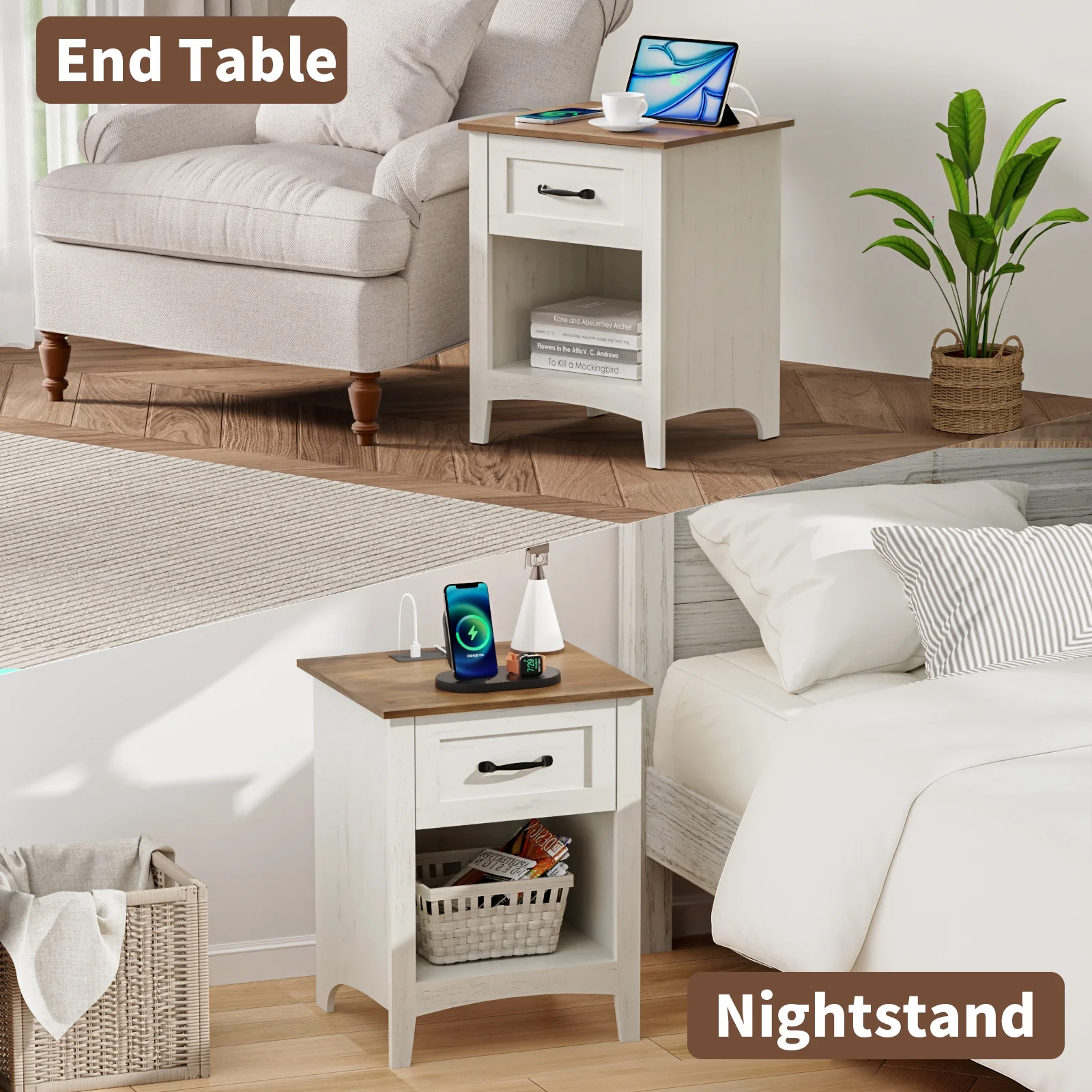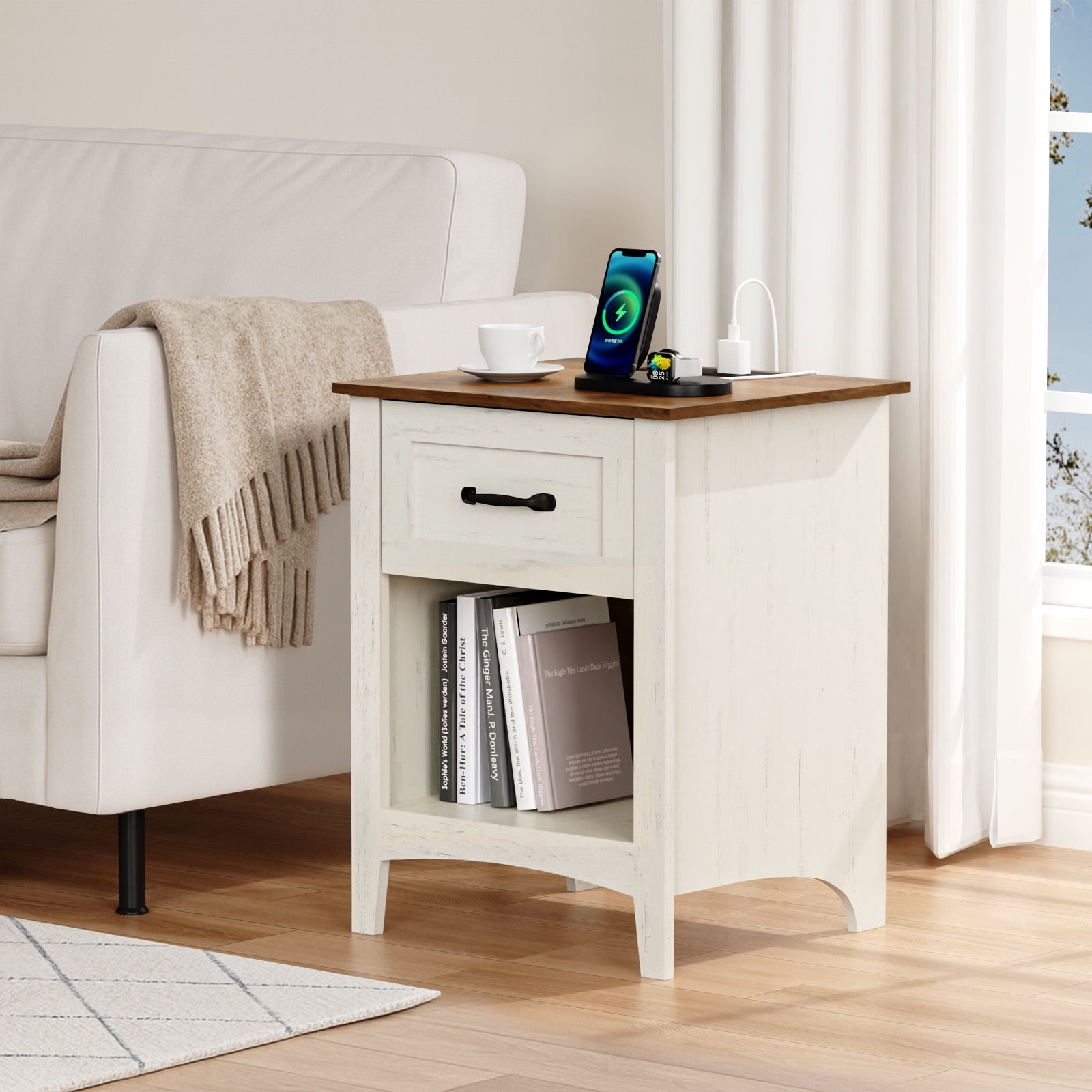 Hommpa 2 Drawers End Tables With Charging Station For Living Room, Farmhouse Narrow Sofa Side Table For Small Spaces
