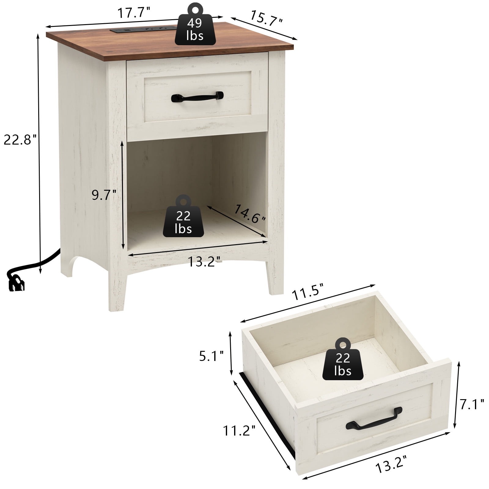 KEY FEATURES: ?? Sturdy and Stable Night Table White bedside table is made of 15 mm thick melamine particleboard with high gloss finish on the drawer fronts. Modern nightstand can hold up to 100lbs.4 metal table feet raise the height of night stand. Overall Size:26.37″L x17.71″W x 27.16″H ?? LED Table with Charging Station Smart nightstand is arranged 2 AC power outlets(120V/12A) and 2 USB ports(5V/2A) on the right side which is convenient for charging your electric devices.The cable length of the power plug strip is 4.9 feet ?? Nightstand with RGB LED Lights The LED light strip of the smart nightstand can meet the two control methods of APP bluetooth and 24 key remote control, and can easily realize the switching of LED light effects and modes (Music /MIC Mode/Timing/Dynamic Style), which can create a beautiful atmosphere and can also be used as a night light for getting up at night ?? Multifunction Storage Space High gloss bedside table with 2 drawers and 1 open shelf offering ample storage space. White nightstand drawer fronts feature a high gloss reflective effect that enhances the sense of space on the front of the bedside table. 2 metal round handles for easy opening and closing of the drawer ?? Easy to Assemble Modern bedside table comes in a flat pack with numbered panels, numbered accessory packs and pre-cut holes for the panels. Please read the installation instructions provide before installation and check whether all accessories are included in the package, if some accessories are missing and please contact us SPECIFICATIONS: Features: RGB LED Lights, Charging Station, APP/Remote Control Material: Particleboard Pack: 1 Pack Shape: Rectangular Drawer Front Finish: High Gloss Number of Drawers: 2 Drawers Handle: Metal Handles Shelving Included: One Open Shelf Charging Station: 2 USB Charging Ports+2 US Plug Ports Assembled Product Weight: 43.65 lbs Assembled Product Dimensions: 26.37″L x17.71″W x 27.16″H Overall Load Bearing: 100 lbs Single Drawer Load Bearing: 30 lbs Open Shelf Load Bearing: 20 lbs Package Includes: 1 x Nightstand (Board with Number) , 1 x Hardware Accessories with Number, 1 x Installation Manual, 1 x Screwdriver Note: 1. Because there was a manual measuring ,the size may has 0.5-1 inch difference. 2. The color may be slight different due to the condition or light or different monitor.