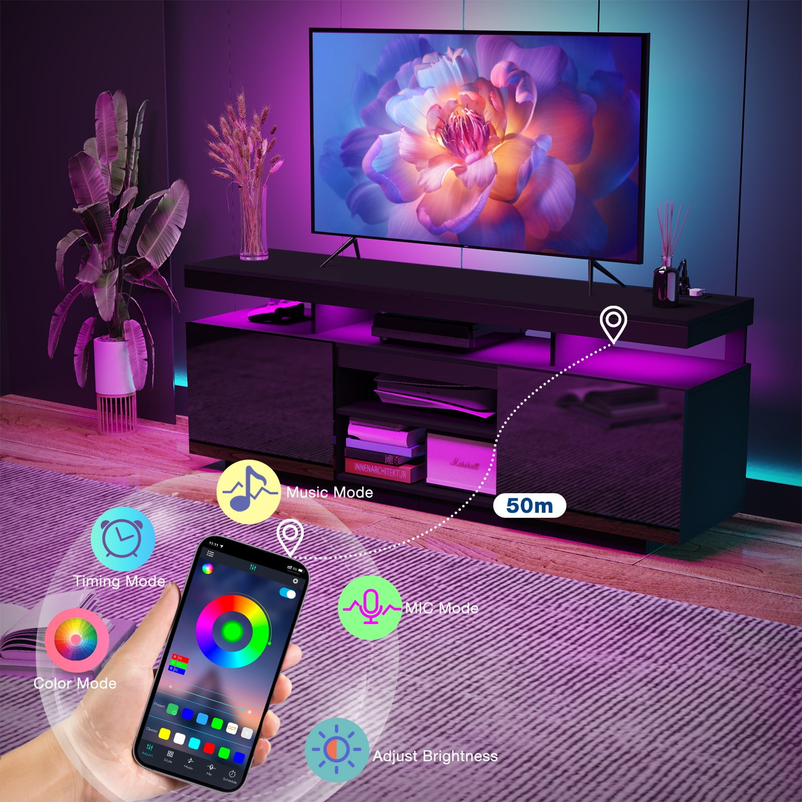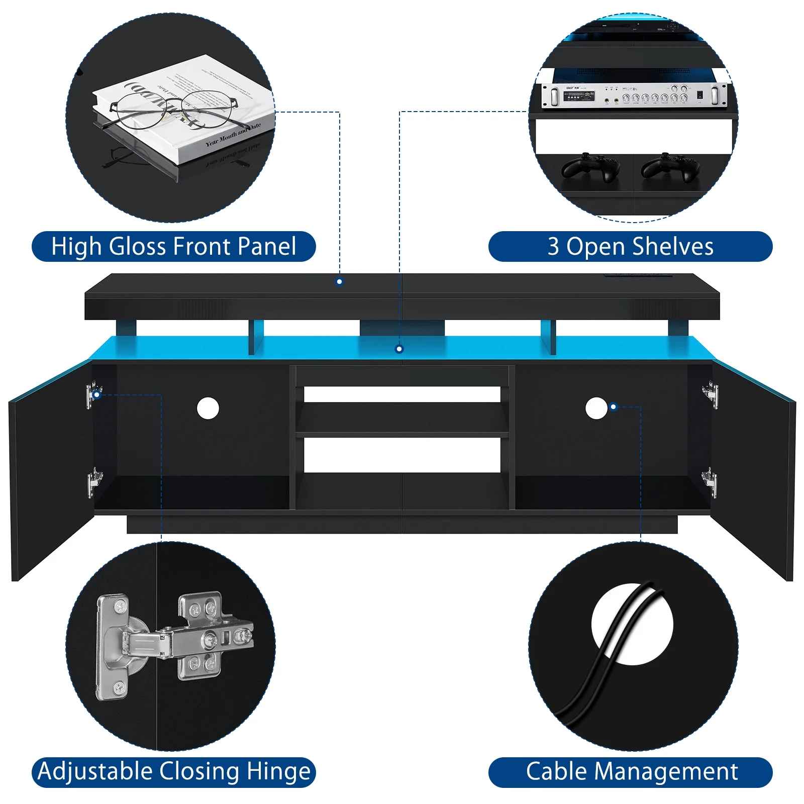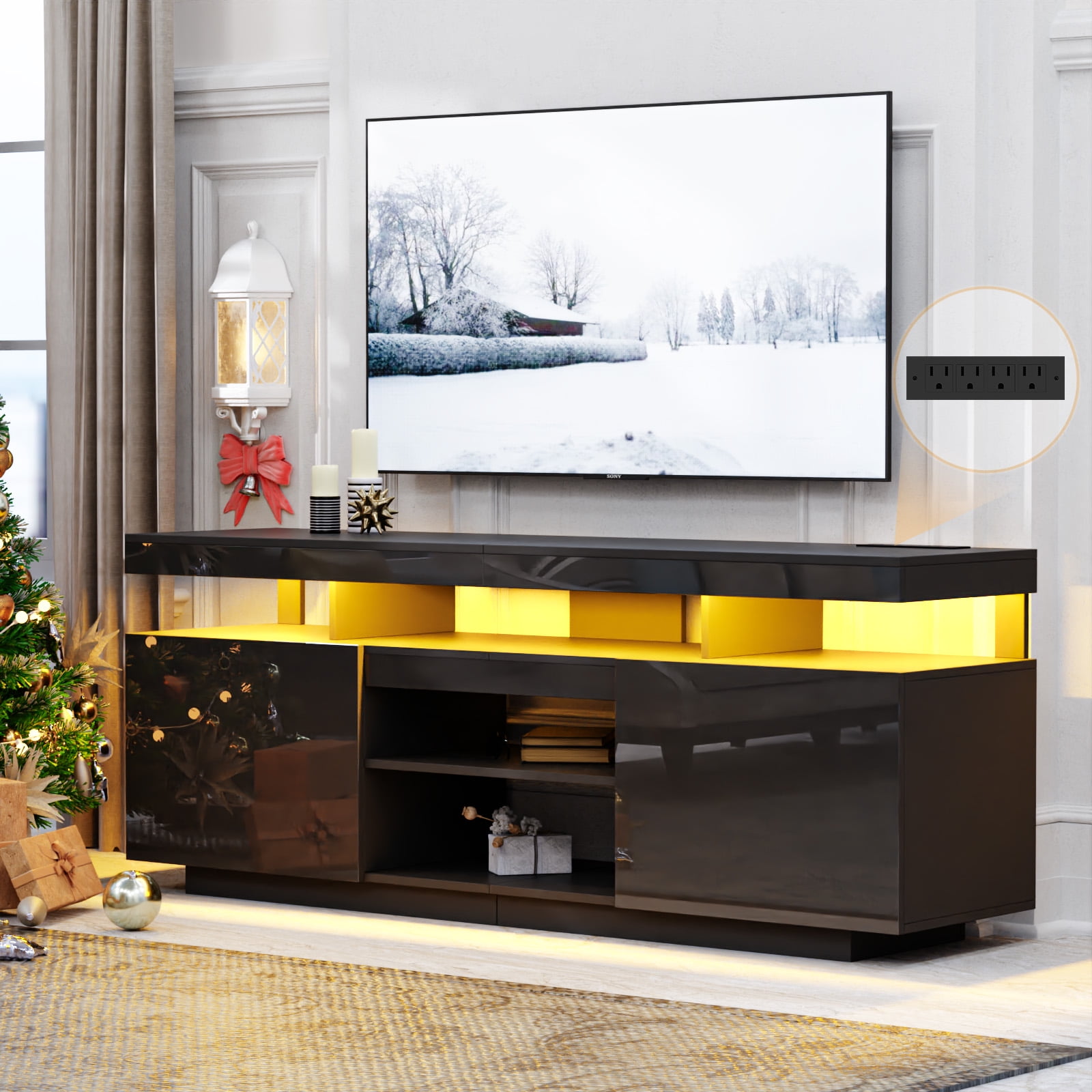 ◆TV Stand with Charging Station: Inside features 4 standard plug outlets and a 6.5ft power cord, allowing you to charge your TV, DVD player, WiFi router, and more. ◆Adjustable LED Lights: Cool LED lights complement any decor, creating a vibrant atmosphere. Conveniently adjust the lights using the included remote or app to match your mood and preferences, whether it’s spring festivities or relaxed summer nights. ◆Stable Construction: Crafted from P2 15mm particle board, our television stand is designed for long-lasting durability. With a total load capacity of 300 pounds, it can easily support your living room TV and daily necessities. Additionally, it comes equipped with anti-tip kits. ◆Large Capacity TV Cabinet with Soundbar Shelf: Offers 5 open shelves and 2 large cabinets. Store DVDs, CDs, gaming devices, remotes, books, magazines, and more effortlessly. The middle shelf offer the flexibility to be placed or disassembled based on your needs, making it an ideal solution for organizing your PS5 and gaming gear. ◆Efficient Cable Management: Moreover, the back cord hole helps you organize your wires and cables, keeping your entertainment setup neat and organized. ◆High Gloss TV Stand for 70″ TV: Fits 40″ to 70″ TVs with a black design that combines glossy and matte finishes, featuring a high gloss front for an elegant touch in your living room, bedroom, or gaming room. ◆Easy Assembly: The modern black LED tv stand is designed for effortless assembly, with clear instructions included. Prior to assembly, please ensure all accessories are included. If any are missing, contact us for a prompt, cost-free replacement kit. For any issues, feel free to reach out. Specifications: Material: P2 particle board Finish: High Gloss & Matte Finishes combination Design: Multi Storage, Top Row Socket, LED light system Max Screen Size: 70 inches Weight Capacity: 300 lbs Assembled Product Dimensions: 63.78″ x 15.75″ x 23.62″ (L x W x H) Number of Shelves: 5 Cable Management: Yes Adjustable Shelf: Yes Package Include 1 x LED TV stand 1 x User Manual Click to view Assembly Video