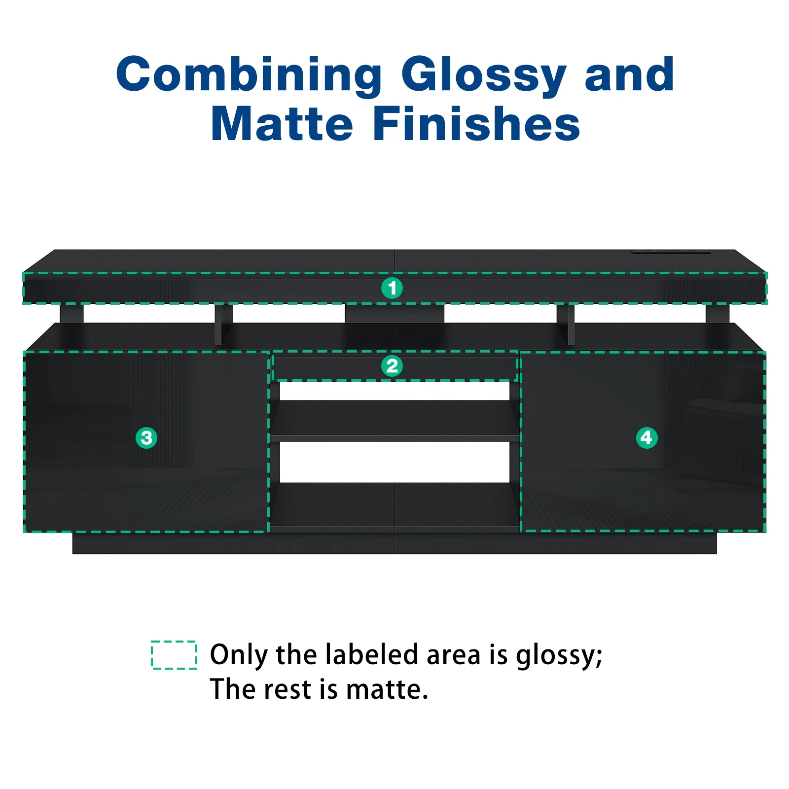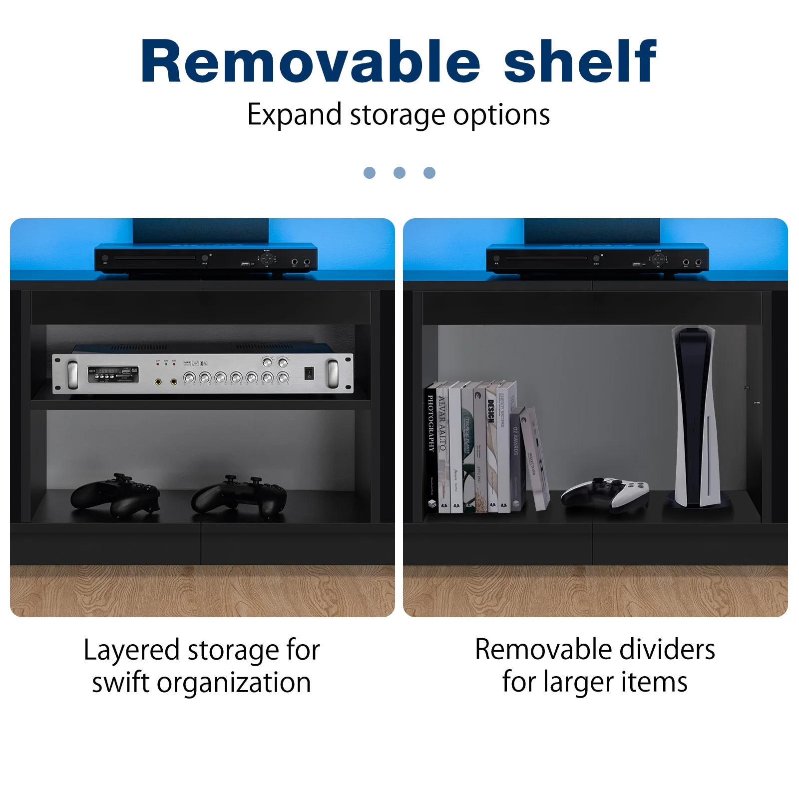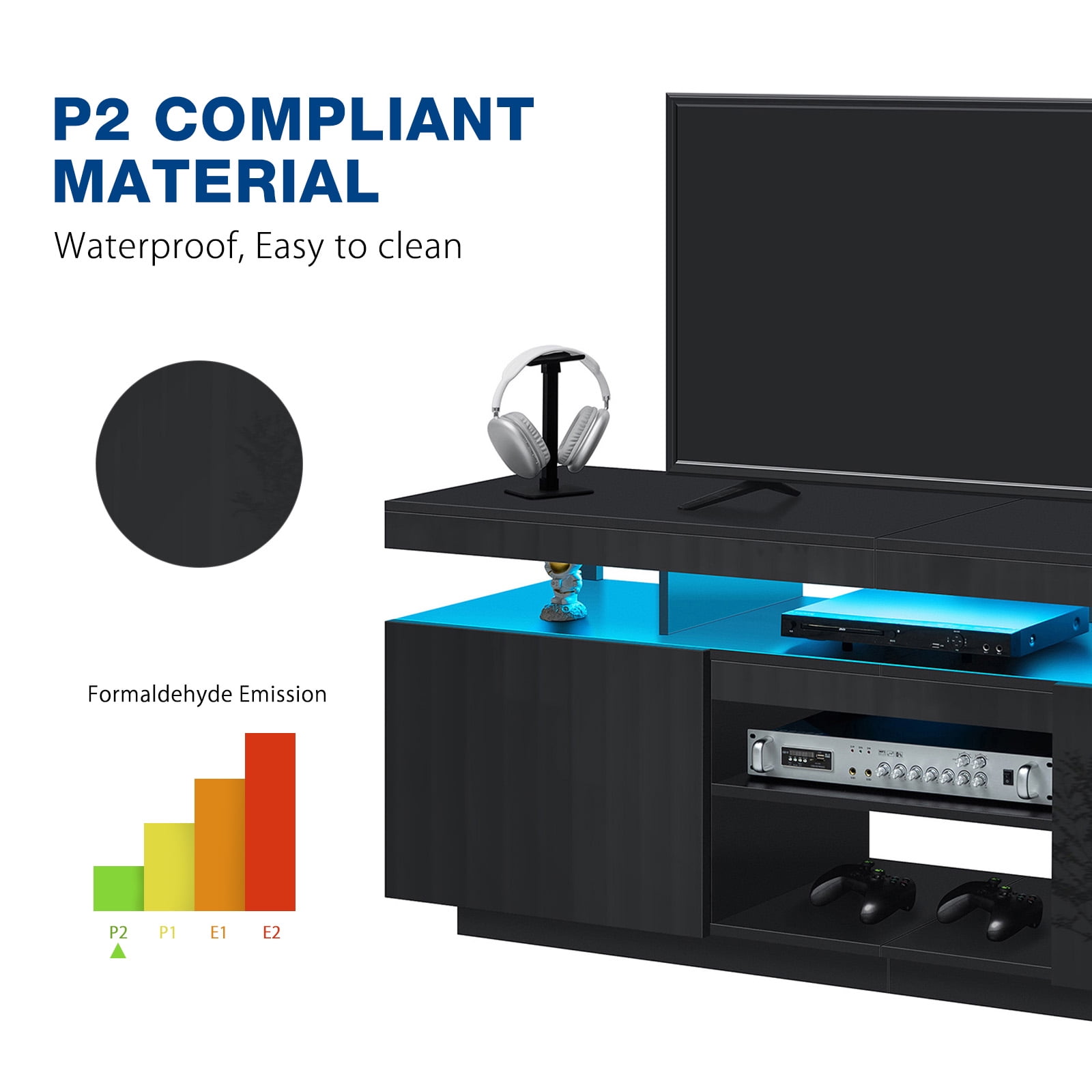 ◆TV Stand with Charging Station: Inside features 4 standard plug outlets and a 6.5ft power cord, allowing you to charge your TV, DVD player, WiFi router, and more. ◆Adjustable LED Lights: Cool LED lights complement any decor, creating a vibrant atmosphere. Conveniently adjust the lights using the included remote or app to match your mood and preferences, whether it’s spring festivities or relaxed summer nights. ◆Stable Construction: Crafted from P2 15mm particle board, our television stand is designed for long-lasting durability. With a total load capacity of 300 pounds, it can easily support your living room TV and daily necessities. Additionally, it comes equipped with anti-tip kits. ◆Large Capacity TV Cabinet with Soundbar Shelf: Offers 5 open shelves and 2 large cabinets. Store DVDs, CDs, gaming devices, remotes, books, magazines, and more effortlessly. The middle shelf offer the flexibility to be placed or disassembled based on your needs, making it an ideal solution for organizing your PS5 and gaming gear. ◆Efficient Cable Management: Moreover, the back cord hole helps you organize your wires and cables, keeping your entertainment setup neat and organized. ◆High Gloss TV Stand for 70″ TV: Fits 40″ to 70″ TVs with a black design that combines glossy and matte finishes, featuring a high gloss front for an elegant touch in your living room, bedroom, or gaming room. ◆Easy Assembly: The modern black LED tv stand is designed for effortless assembly, with clear instructions included. Prior to assembly, please ensure all accessories are included. If any are missing, contact us for a prompt, cost-free replacement kit. For any issues, feel free to reach out. Specifications: Material: P2 particle board Finish: High Gloss & Matte Finishes combination Design: Multi Storage, Top Row Socket, LED light system Max Screen Size: 70 inches Weight Capacity: 300 lbs Assembled Product Dimensions: 63.78″ x 15.75″ x 23.62″ (L x W x H) Number of Shelves: 5 Cable Management: Yes Adjustable Shelf: Yes Package Include 1 x LED TV stand 1 x User Manual Click to view Assembly Video