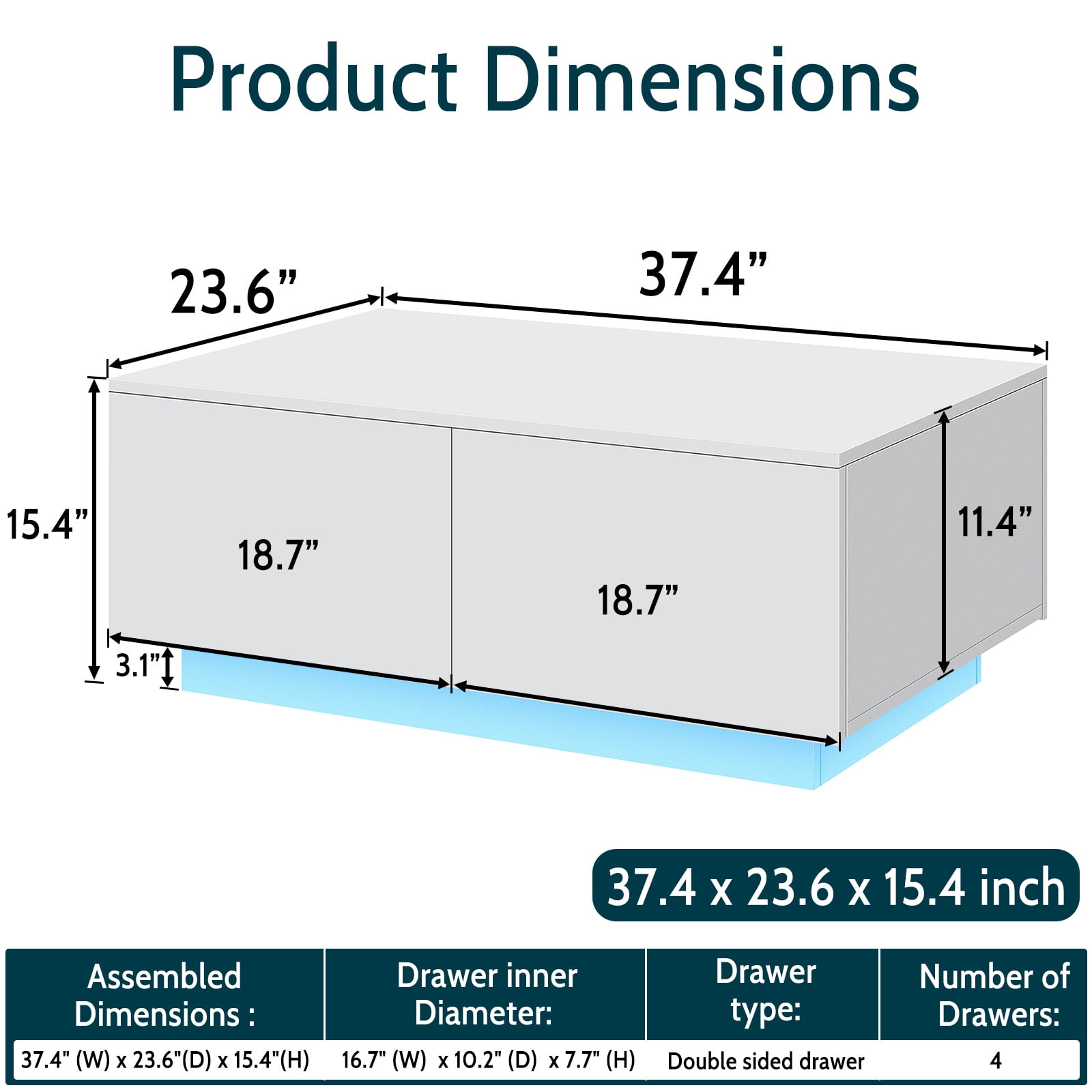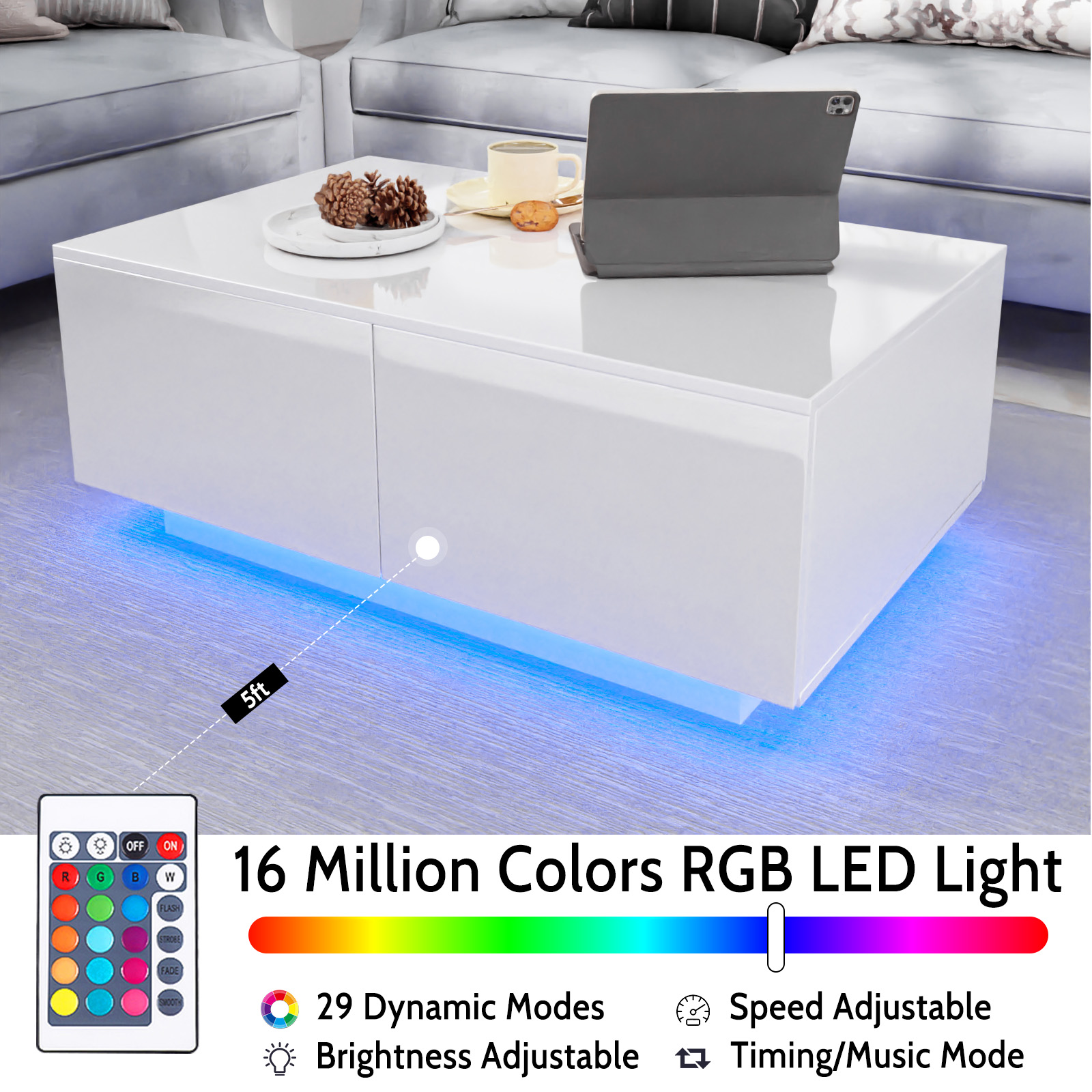 Key Features Dynamic LED Ambiance: Illuminate your space with a 16 million color LED system and 29 dynamic effects. Easily adjust colors and effects via remote or app, turning your coffee table into a vibrant focal point for any occasion. Sleek High Gloss Surface: The high gloss finish on the desktop and drawer surfaces exudes elegance and sophistication, making it easy to clean and maintain. Dual-Sided Drawers for Easy Access: The inclusion of double drawers in the tea table enables effortless access to your belongings from both ends. Ample Storage Capacity: Four spacious storage drawers provide ample space to put your books or keep your smaller items organized and within reach, minimizing clutter and enhancing tidiness. Durable and Stylish: Constructed from E1 15mm particle board, this coffee table ensures durability while adding a touch of modern style to your home decor. Revitalize your living room or office space with the High Gloss Coffee Table Side Sofa Table featuring mesmerizing LED lights, sleek high gloss surfaces, dual-sided drawers for easy access, generous storage capacity, and a durable and stylish design. We strive for excellent after-sales service, offering an enhanced manual, complimentary LED light replacements, support for spare parts and damaged goods, and size clarification. Please don’t hesitate to reach out to us with any concerns or inquiries. Your satisfaction is our utmost priority. Specifications: Material: E1 15mm Particle board Assembled Size (L x W x H): 37.4 x 23.6 x 15.4 Inches LED Type: Adapter Bearing Capacity: 280 lbs Assembly Required: Yes Package Included: 1 x Coffee Table 1 x Fittings Set 1 x Assemble Manual 1 x LED Light Set