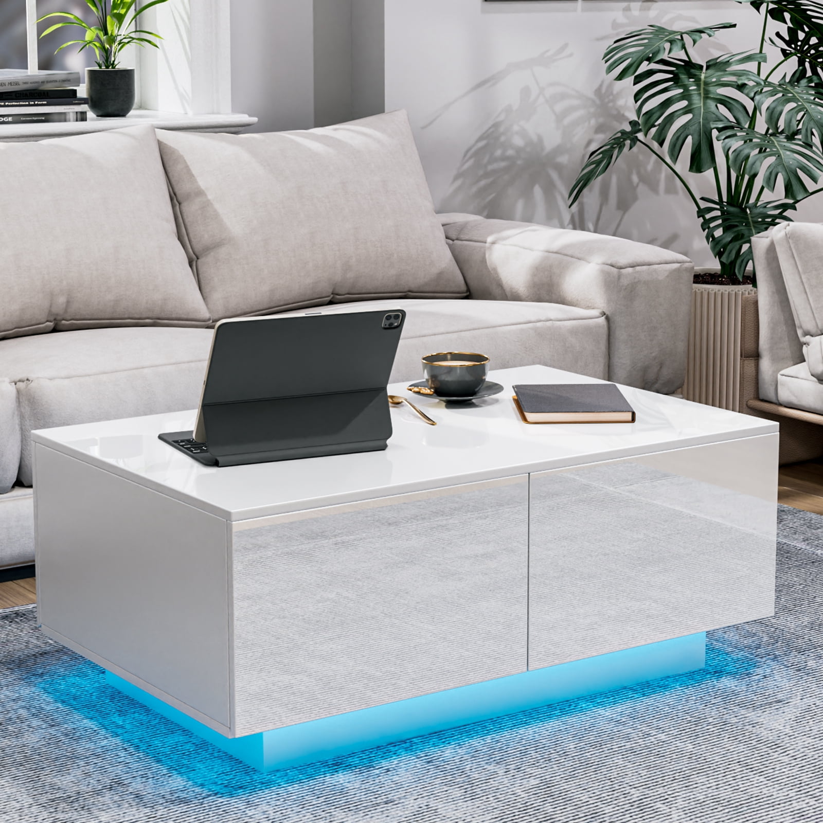 Hommpa Rectangular LED Coffee Table with 4 Drawers High Gloss White Finish Modern Living Room Furniture Sofa Side Cocktail Table 37.4 x 23.6 x 15.4 inches