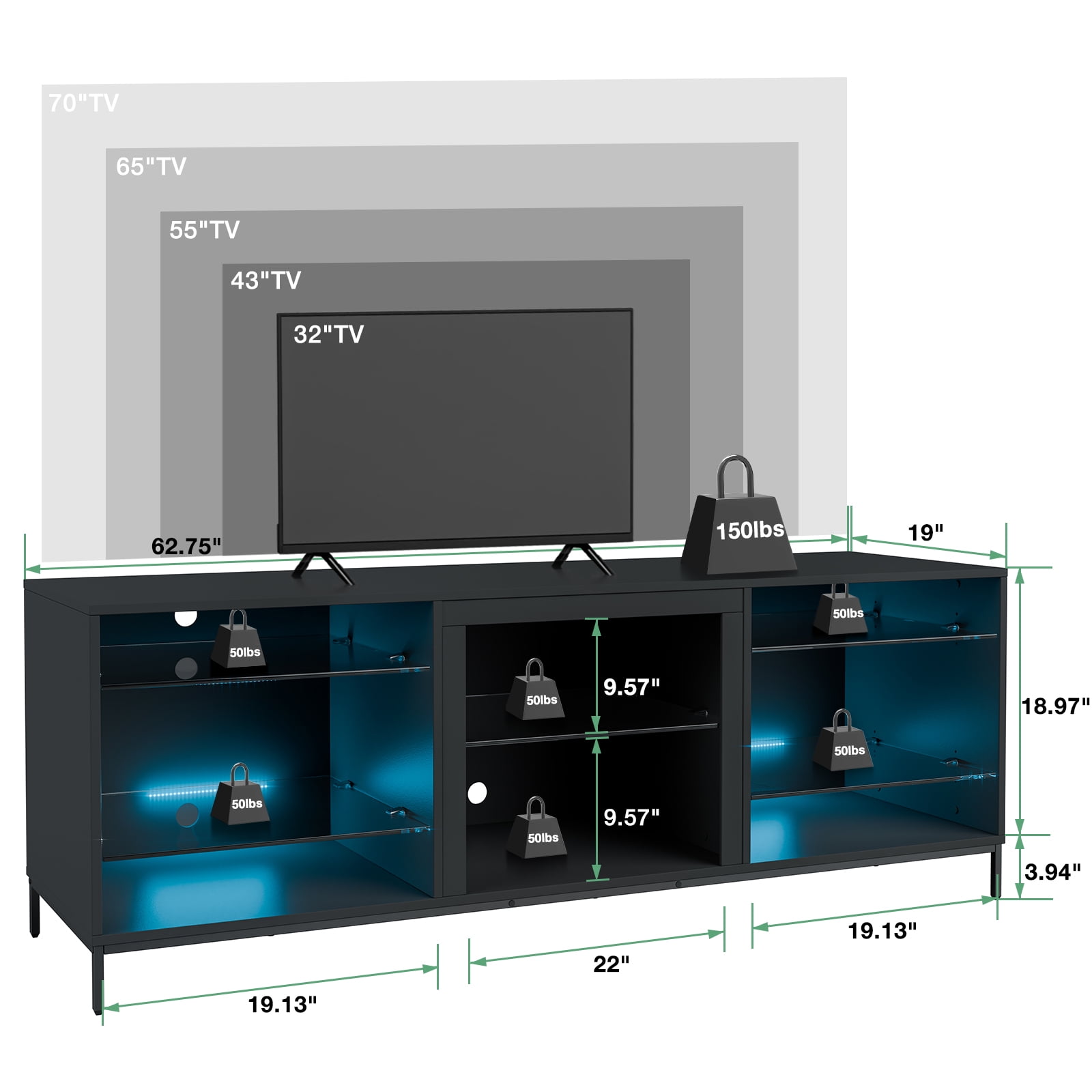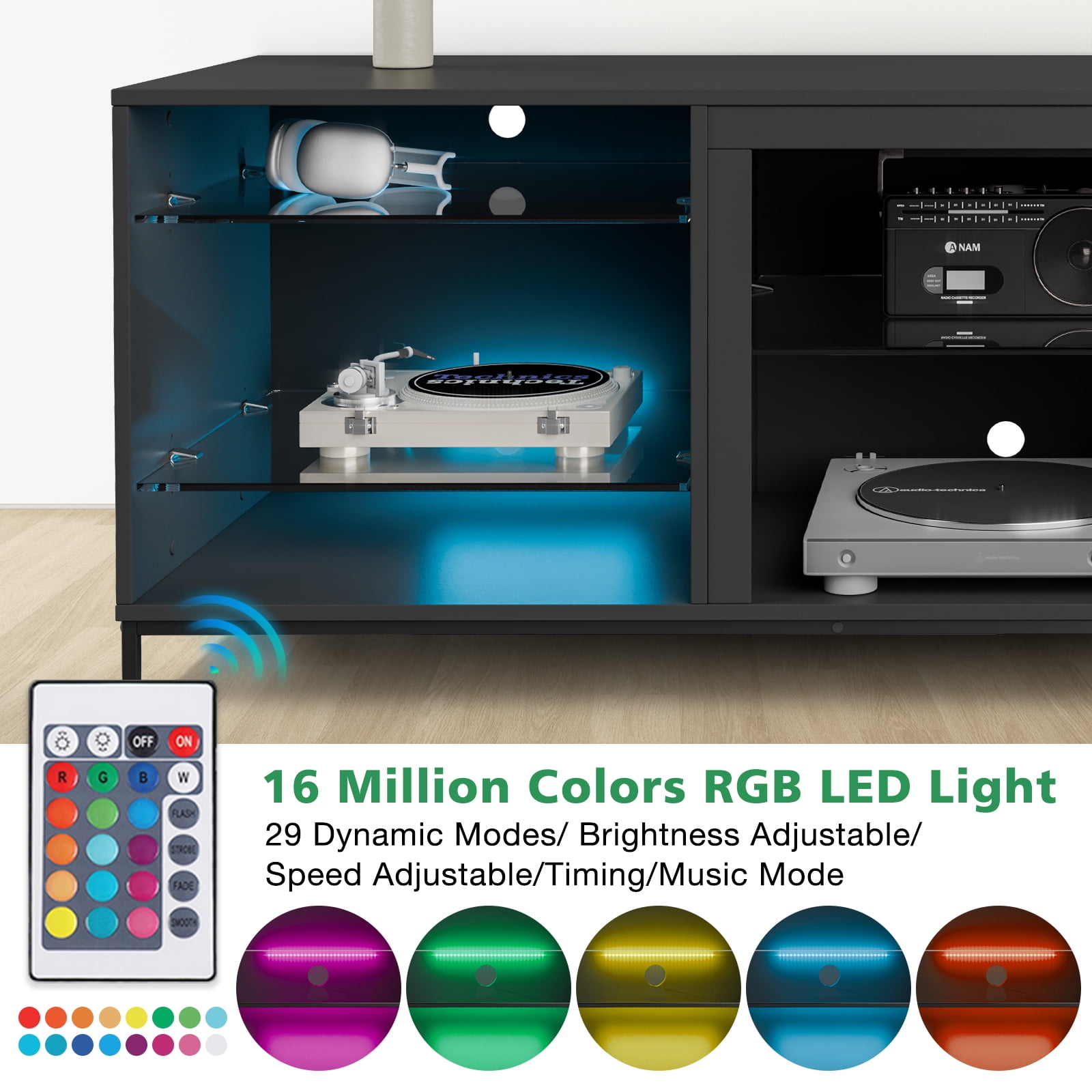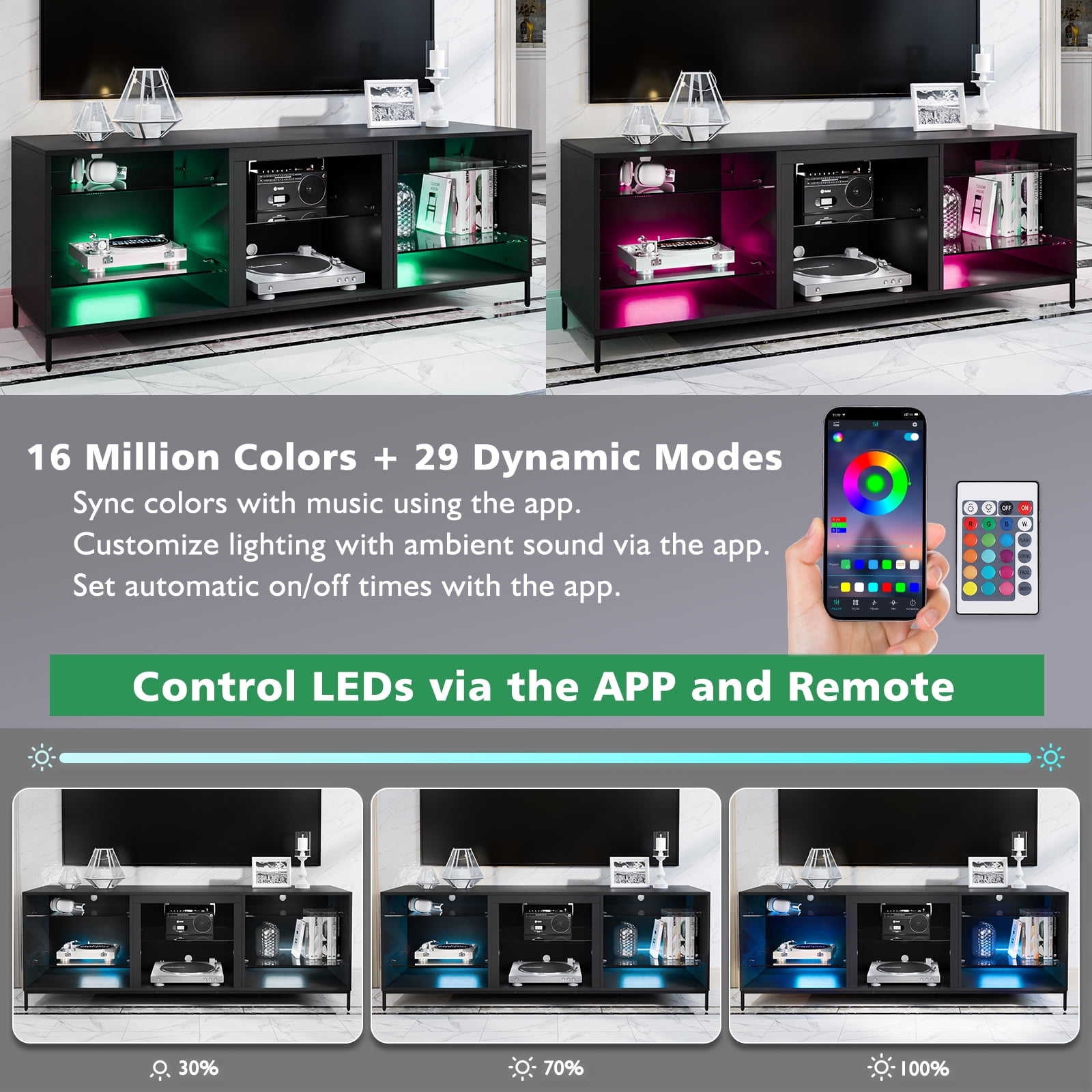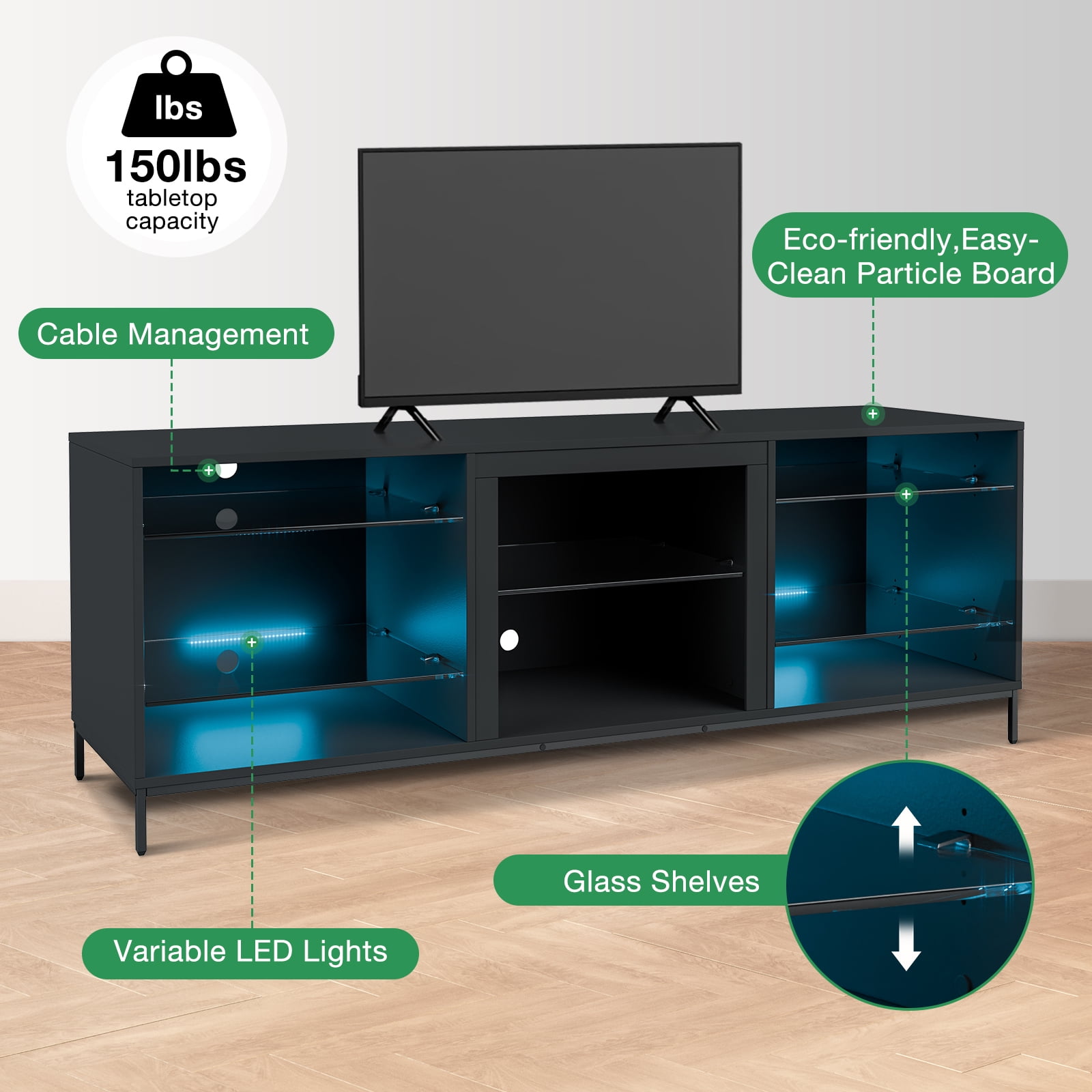 Hommpa TV Stand for 70″ TV Black Modern Entertainment Center with LED Lights Media Console Cabinet Open Glass Storage Shelves for Gaming Living Room