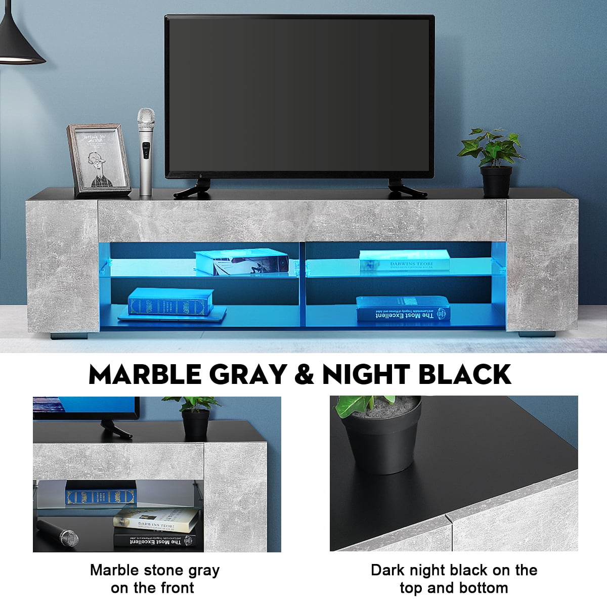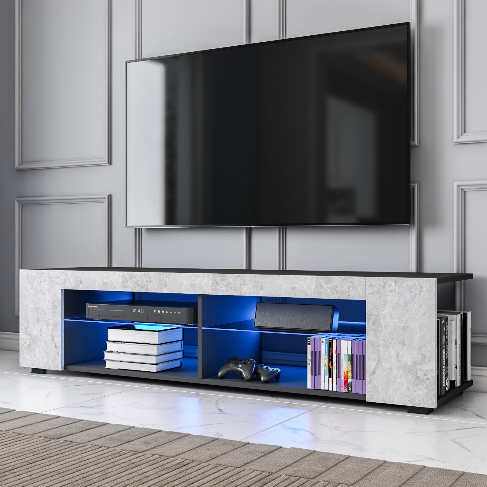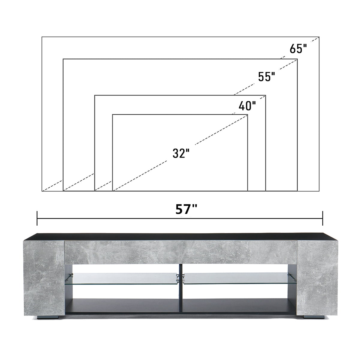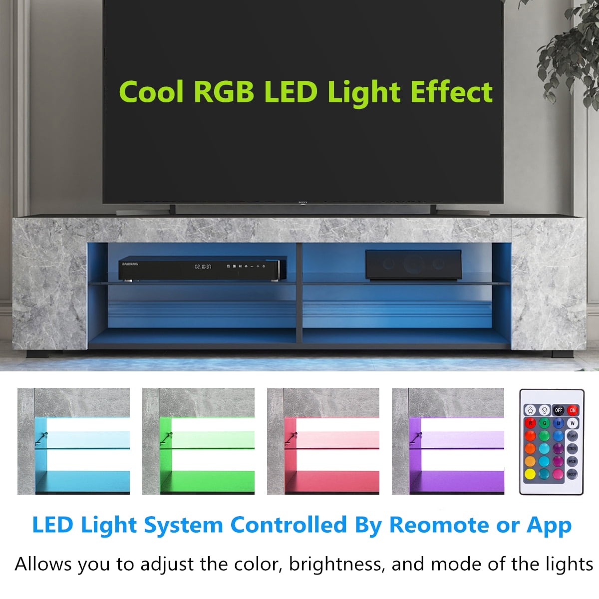RGB LED Lights: Experience a mesmerizing ambiance with the color-changing LED lights. Control the lighting effects and colors via a remote control or bluetooth app. Sync the lights with your favorite music, allowing them to change and pulsate with the beat for an immersive experience. Storage TV Stand: With dimensions of 57″W×15.7″D×13.7″H, this cabinet accommodates up to 65in TVs and provides ample storage. It includes 1 bookshelf and 4 open layers with a glass partition, allowing you to store items like cable boxes, magazines, game consoles, and stereos. Versatile and Expandable: The modern design and open layout of the cabinet expand your storage options. It can be used as a bookshelf, and the transparent glass shelves offer display capabilities and enhance the overall layout of your space. Sturdy Construction: Made of E1 15mm particleboard, this TV stand is built to last. Its stable construction supports various flat screens, such as LCD, Flat, 3D, and LED TVs. Easy Installation: With detailed instructions, assembly takes only about 30 minutes, making it convenient for any user. This TV stand is suitable for various settings, including the study, bedroom, living room, or office. Features: LED Design and Glass Shelf With 1 bookshelf and 4 open layers, plenty of ample storage space Modern Entertainment TV Cabinet with high-gloss LED light Durable and stable construction, high gloss, modern, fashion Made of great quality and eco-friendly particleboard, easy to clean Light Color: Base colours (red, green, blue and white)+mixed colours Light Mode: 3 color gradient, 7 color gradient, 3 color jump, 7 color jump Overall Size: 57 X 15.7 X13.7 Inches