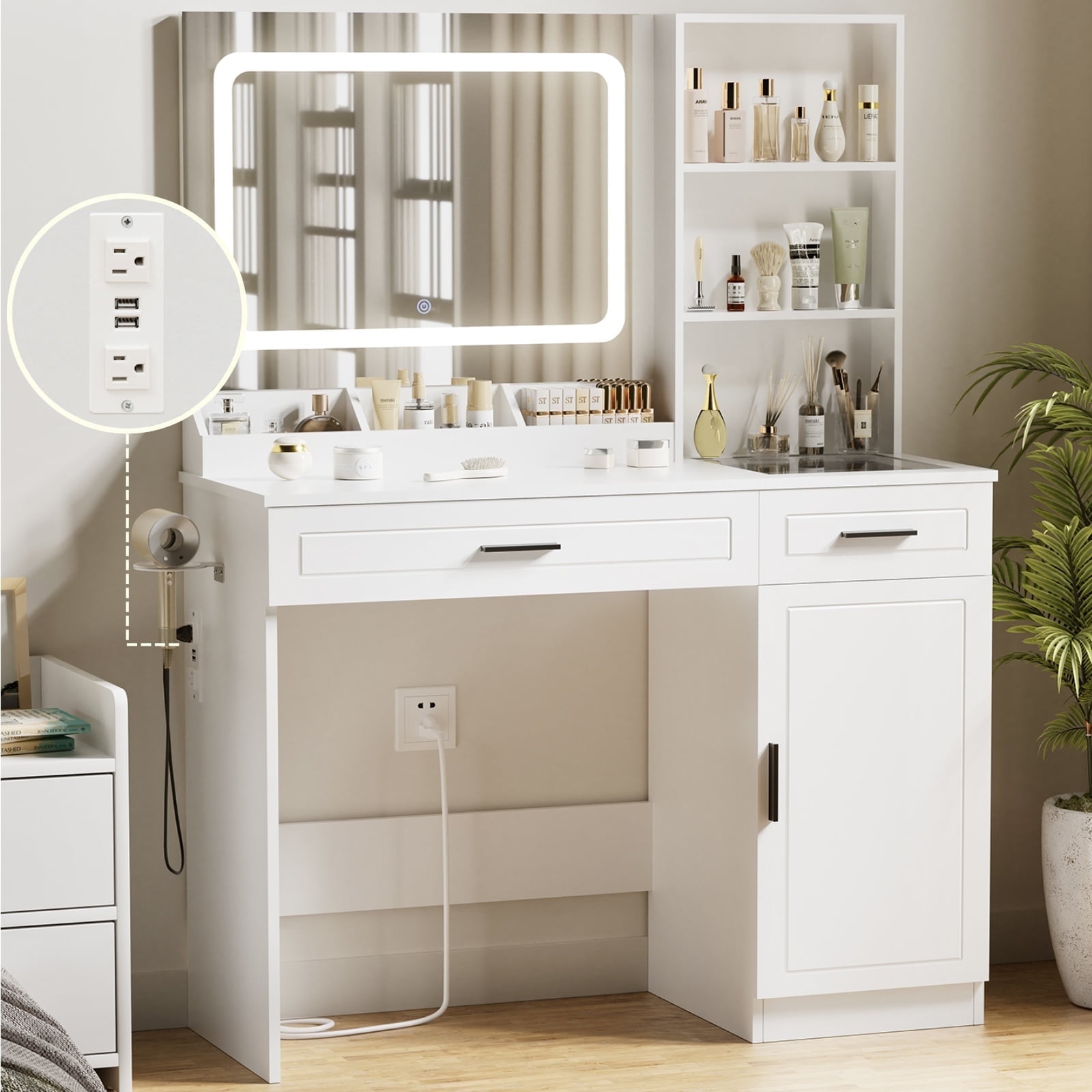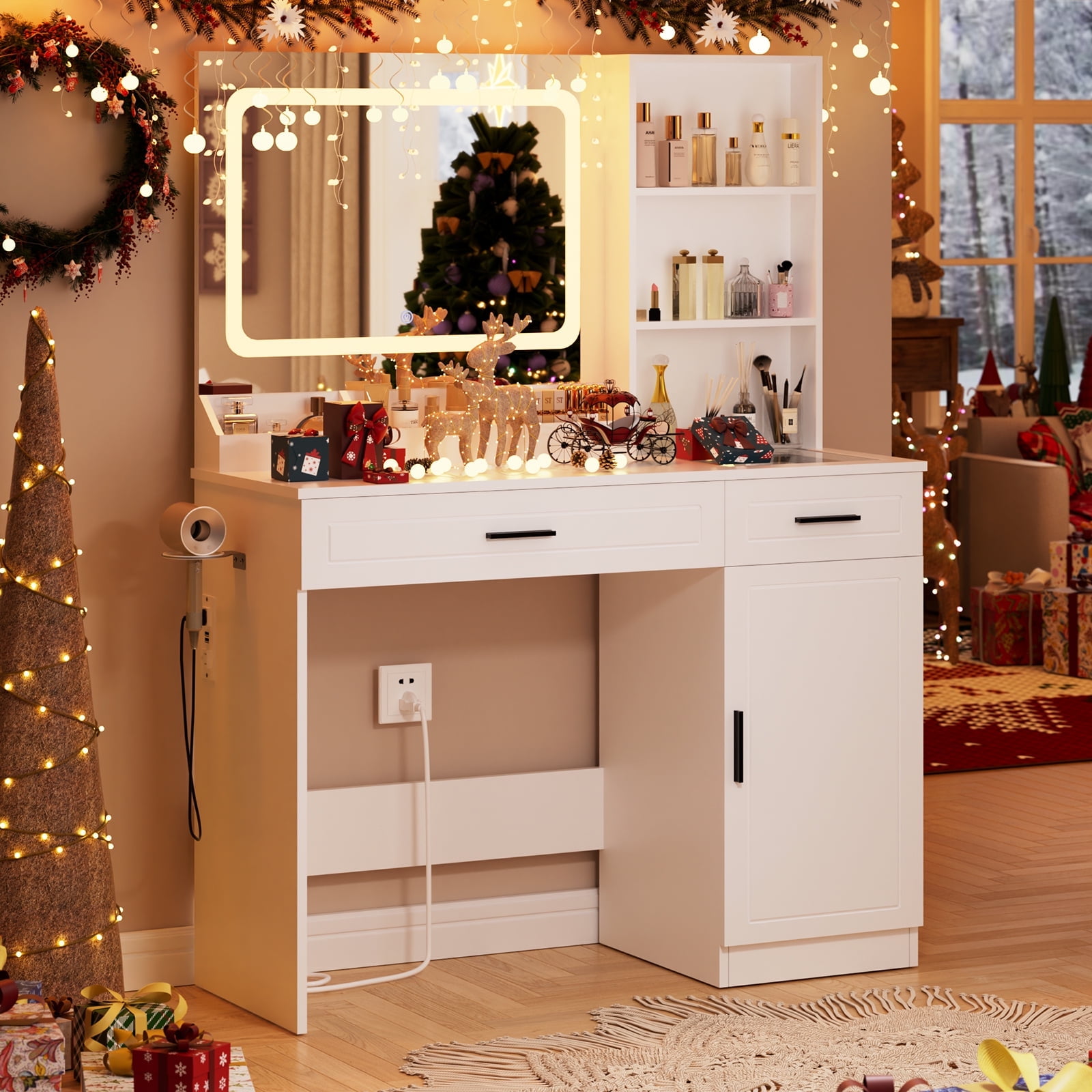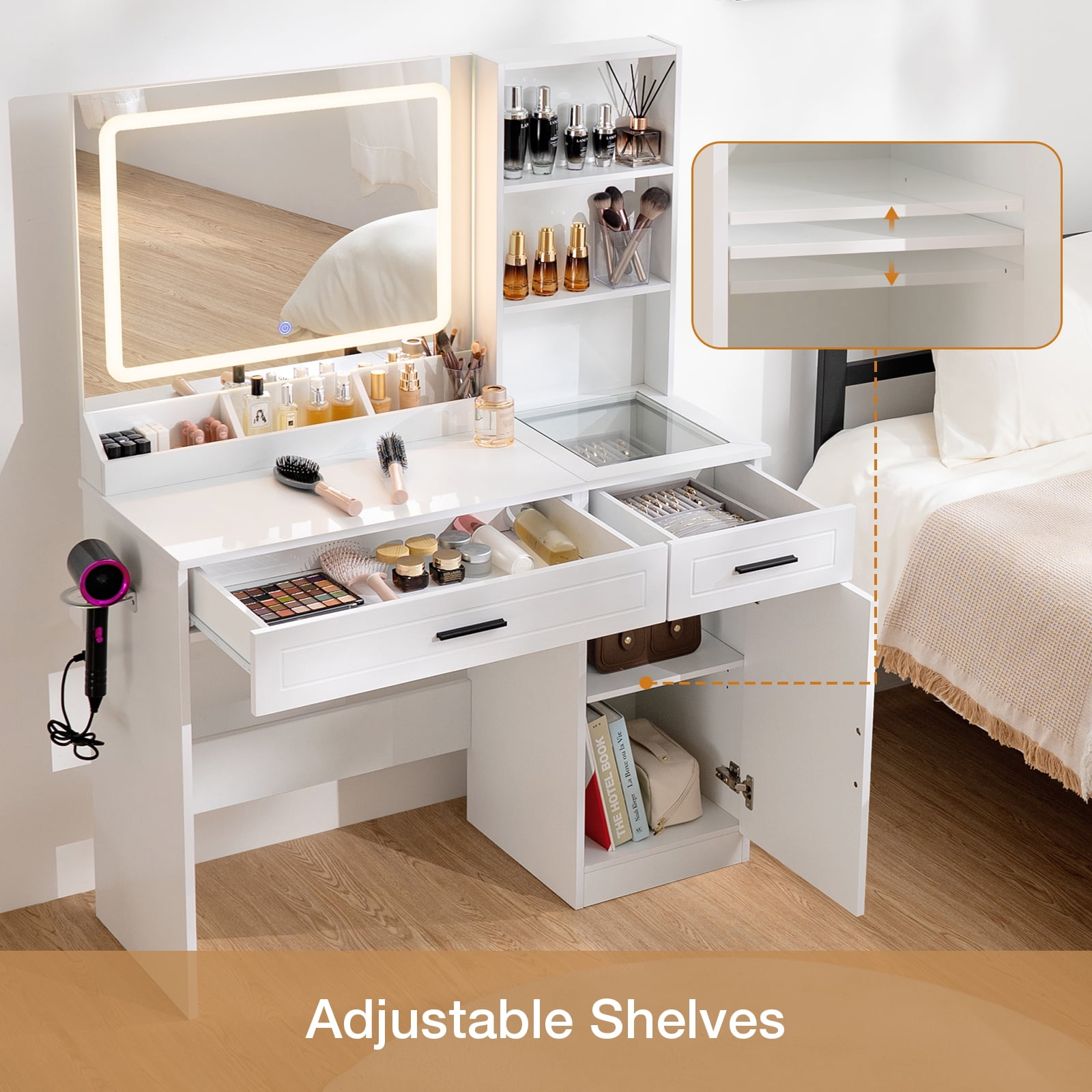 Vanity Desk with Mirror and Lights This vanity desk features a large LED mirror with 3 color modes (warm, natural, and cool), which is safer than ordinary light bulbs. Change colours and adjust brightness with the touch of a switch, which makes it easier to view your makeup in detail, perfect for everyday makeup, selfies and live streaming. Ample Storage Equipped with 3 open shelves, 2 large drawers, 1 adjustable height cabinet, hair dryer rack, this make up vanity station provide lots storage space for all cosmetics, hair straightener, blow dryer, jewelry and allow you to customize the space according to your needs. Ample Storage Equipped with 3 open shelves, 2 large drawers, 1 adjustable height cabinet, hair dryer rack, this make up vanity station provide lots storage space for all cosmetics, hair straightener, blow dryer, jewelry and allow you to customize the space according to your needs. Glass Tabletop Vanity A clear glass top is easy to clean and provides a clear view of the items stored in the drawer. Power Outlet & Hair Dryer Rack This makeup vanity features a power outlet with USB ports, more convenient for connecting curling iron, beauty device, hair dryer and phone charging. The table comes with a metal stand on the side to ensure that your hairdryer is always within reach and neatly organised. Gift Idea Happy gift for daughter, wife, granddaughter, mom girlfriend on birthday, Valentine’s Day, Mother’s Day, Christmas and anniversary! Detailed Instructions Package step-by-step instructions, all parts and accessories are marked, quick and convenient installation! Package included: 1 x Vanity 1 x Assembly Instructions 1 x Accessory Kit 1 x Screwdriver