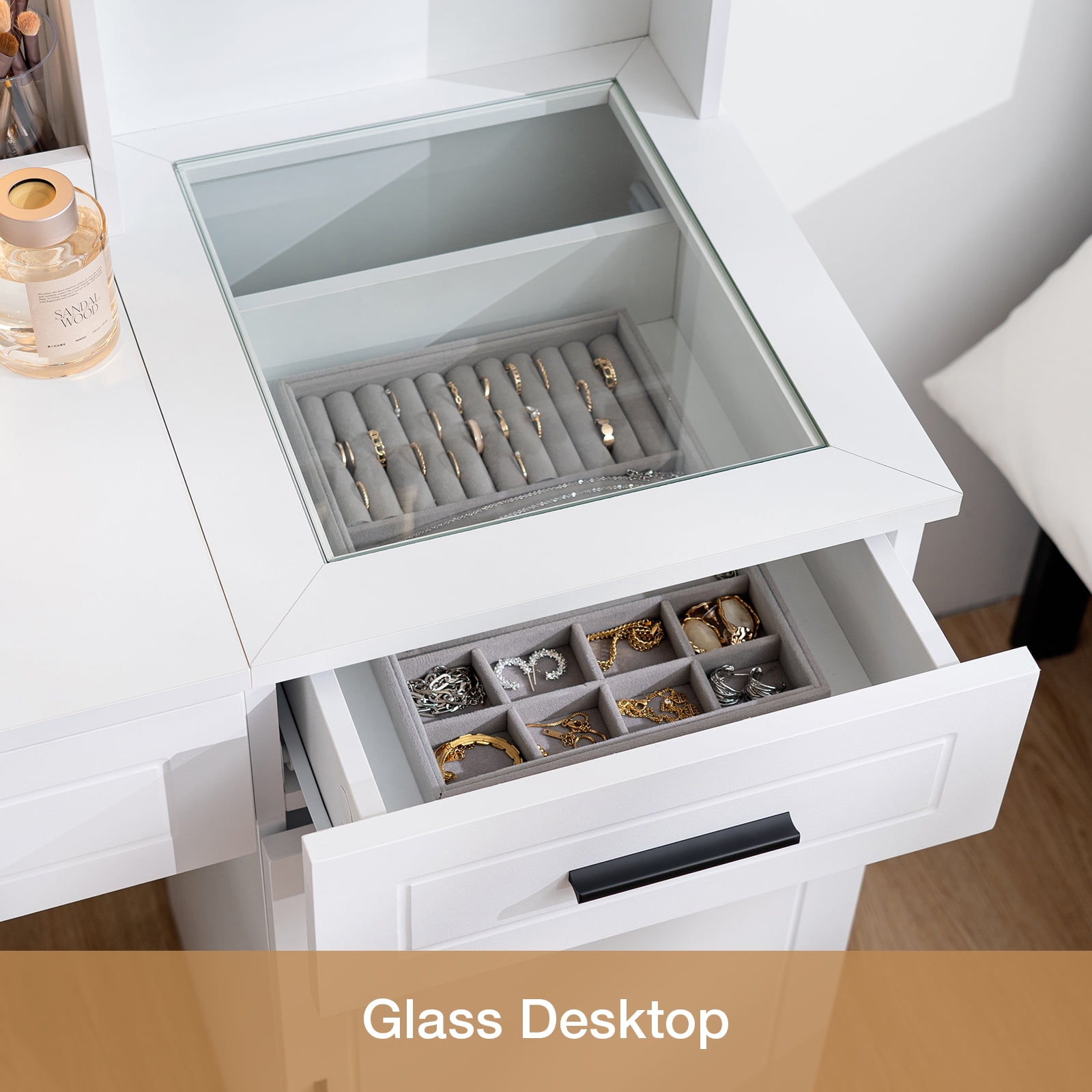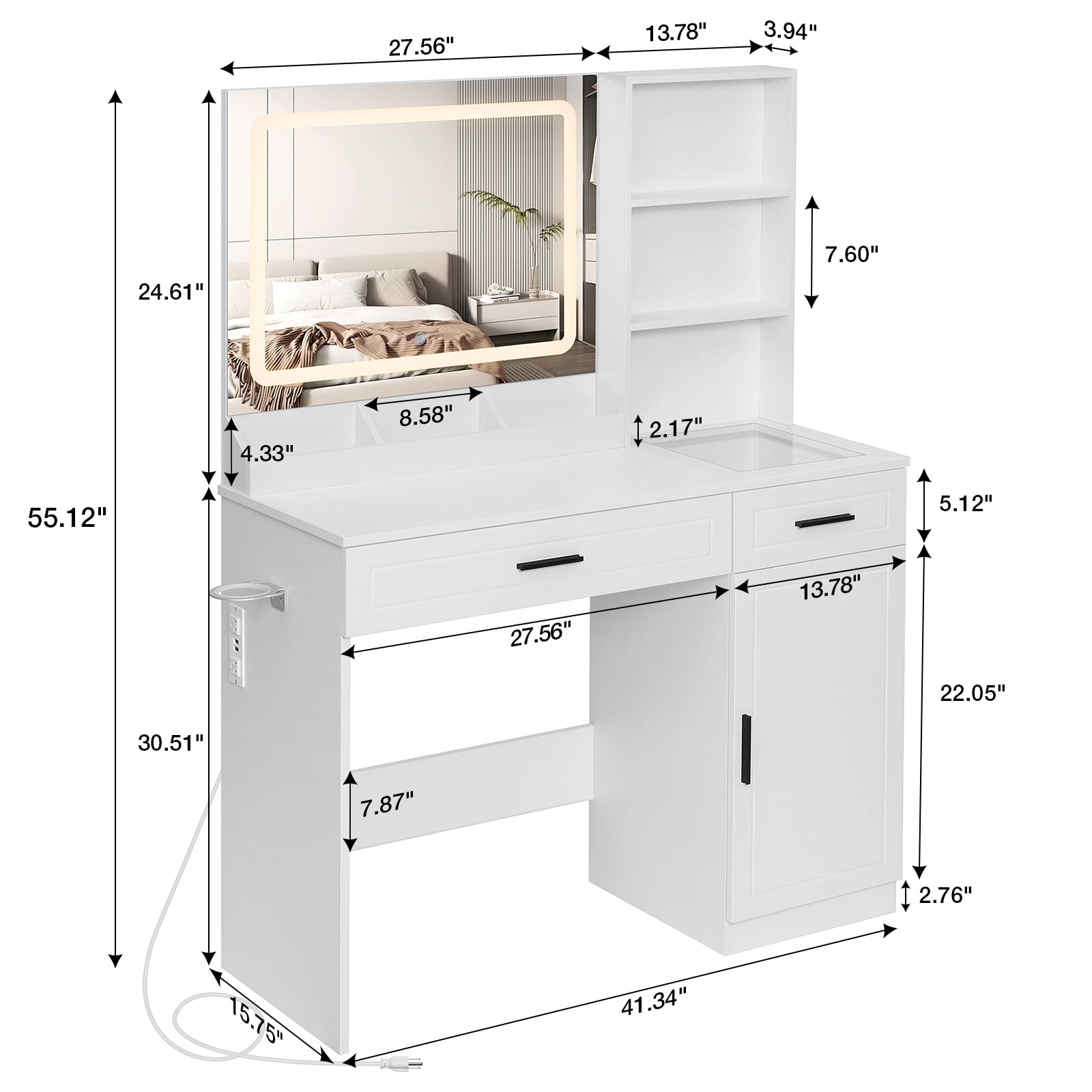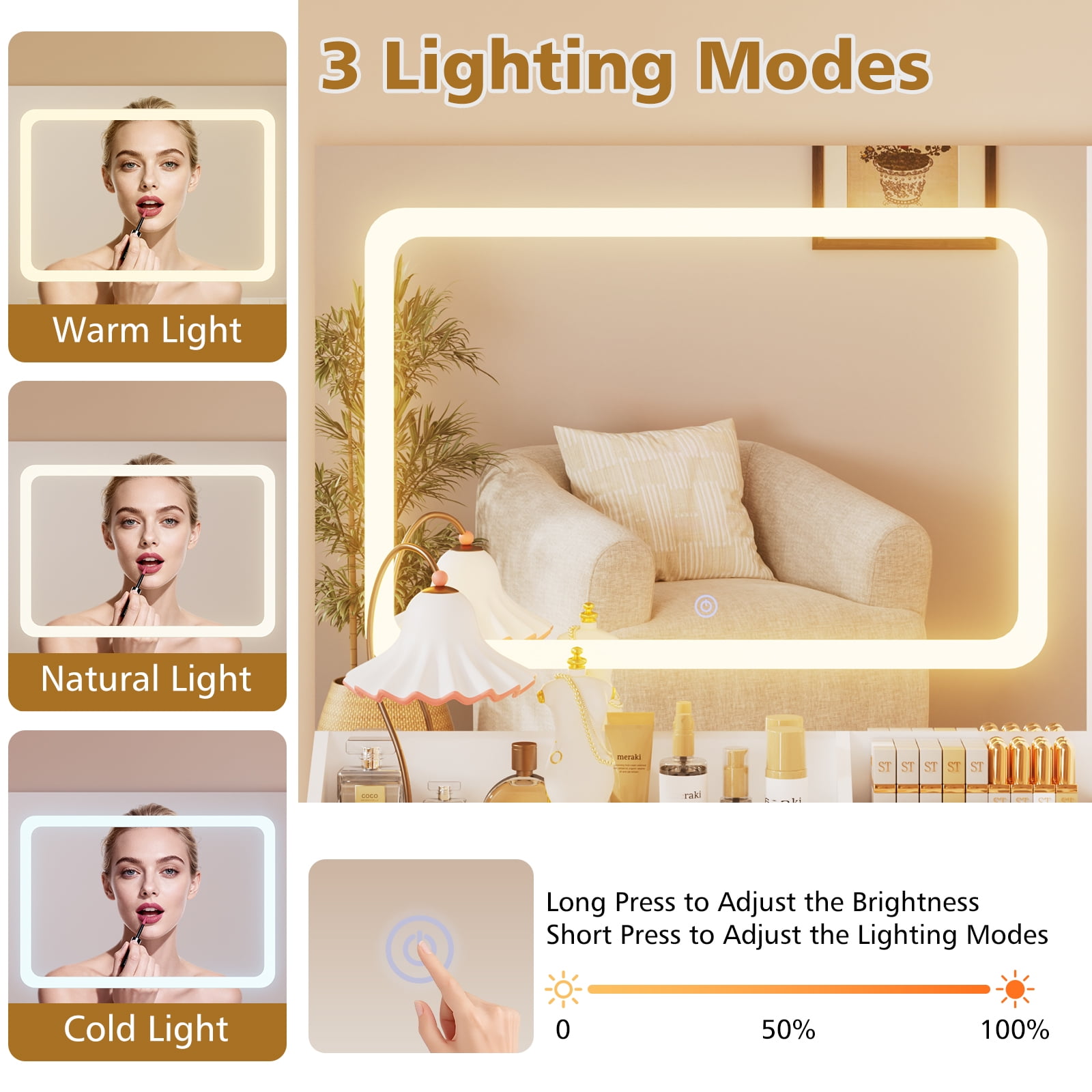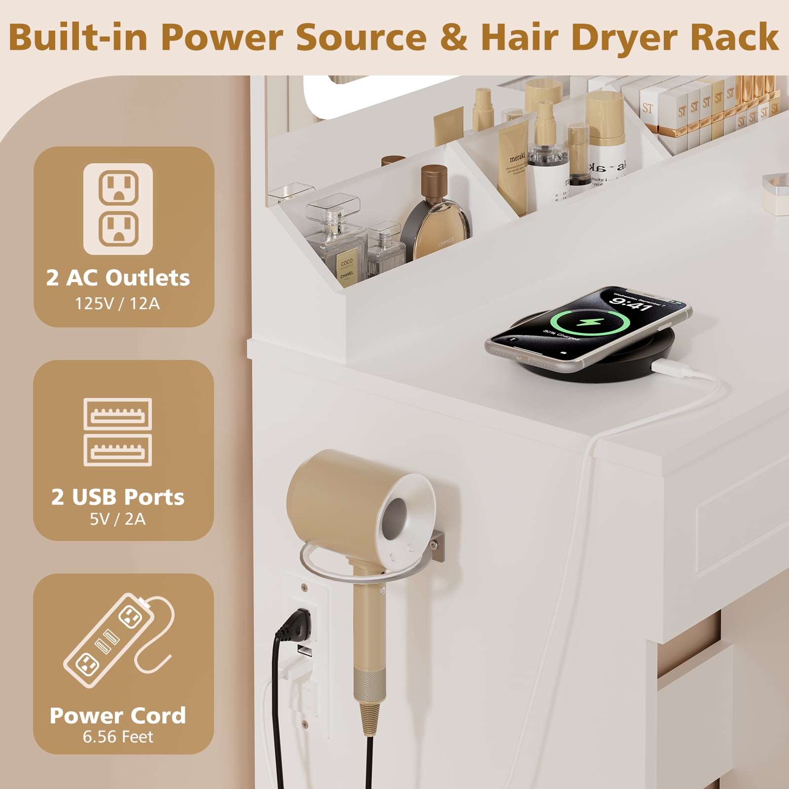 Vanity Desk with Mirror and Lights This vanity desk features a large LED mirror with 3 color modes (warm, natural, and cool), which is safer than ordinary light bulbs. Change colours and adjust brightness with the touch of a switch, which makes it easier to view your makeup in detail, perfect for everyday makeup, selfies and live streaming. Ample Storage Equipped with 3 open shelves, 2 large drawers, 1 adjustable height cabinet, hair dryer rack, this make up vanity station provide lots storage space for all cosmetics, hair straightener, blow dryer, jewelry and allow you to customize the space according to your needs. Ample Storage Equipped with 3 open shelves, 2 large drawers, 1 adjustable height cabinet, hair dryer rack, this make up vanity station provide lots storage space for all cosmetics, hair straightener, blow dryer, jewelry and allow you to customize the space according to your needs. Glass Tabletop Vanity A clear glass top is easy to clean and provides a clear view of the items stored in the drawer. Power Outlet & Hair Dryer Rack This makeup vanity features a power outlet with USB ports, more convenient for connecting curling iron, beauty device, hair dryer and phone charging. The table comes with a metal stand on the side to ensure that your hairdryer is always within reach and neatly organised. Gift Idea Happy gift for daughter, wife, granddaughter, mom girlfriend on birthday, Valentine’s Day, Mother’s Day, Christmas and anniversary! Detailed Instructions Package step-by-step instructions, all parts and accessories are marked, quick and convenient installation! Package included: 1 x Vanity 1 x Assembly Instructions 1 x Accessory Kit 1 x Screwdriver