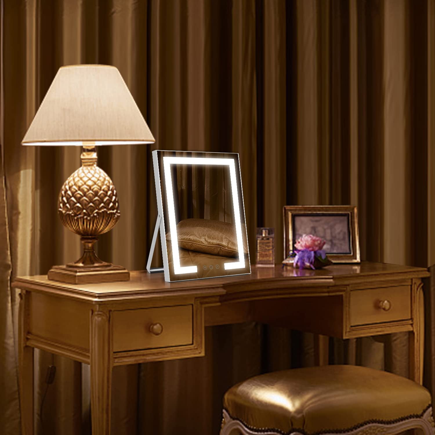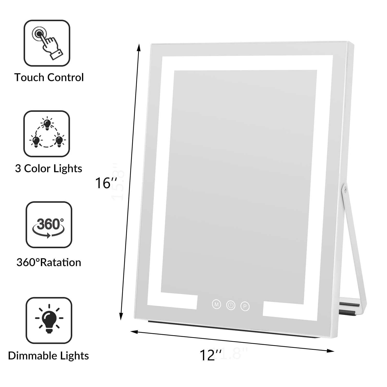 ·Smart Touch Button The lighted makeup mirror has a smart touch sensor design on the screen. you can adjust on/off, brightness and color modes by touching the buttons. ·Three colors lights To meet all requirement of your making up, we design offer you three colors of lights,you also can adjust the dimmable lightings. ·Adjustable mirror angle Easy to adjust the mirror and find the proper viewing angle you need. ·Mirror Size: 12 x 16 inch Smart Touch Button|Three colors lights|Adjustable mirror angle|360 Degree Rotation