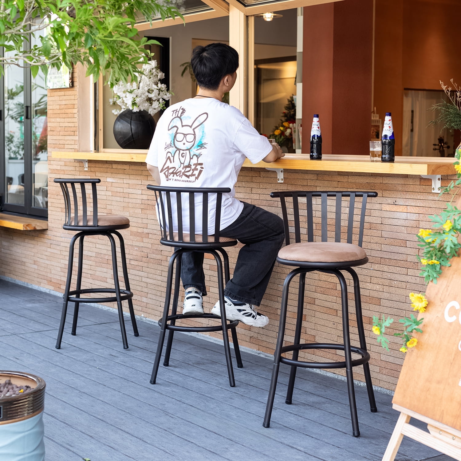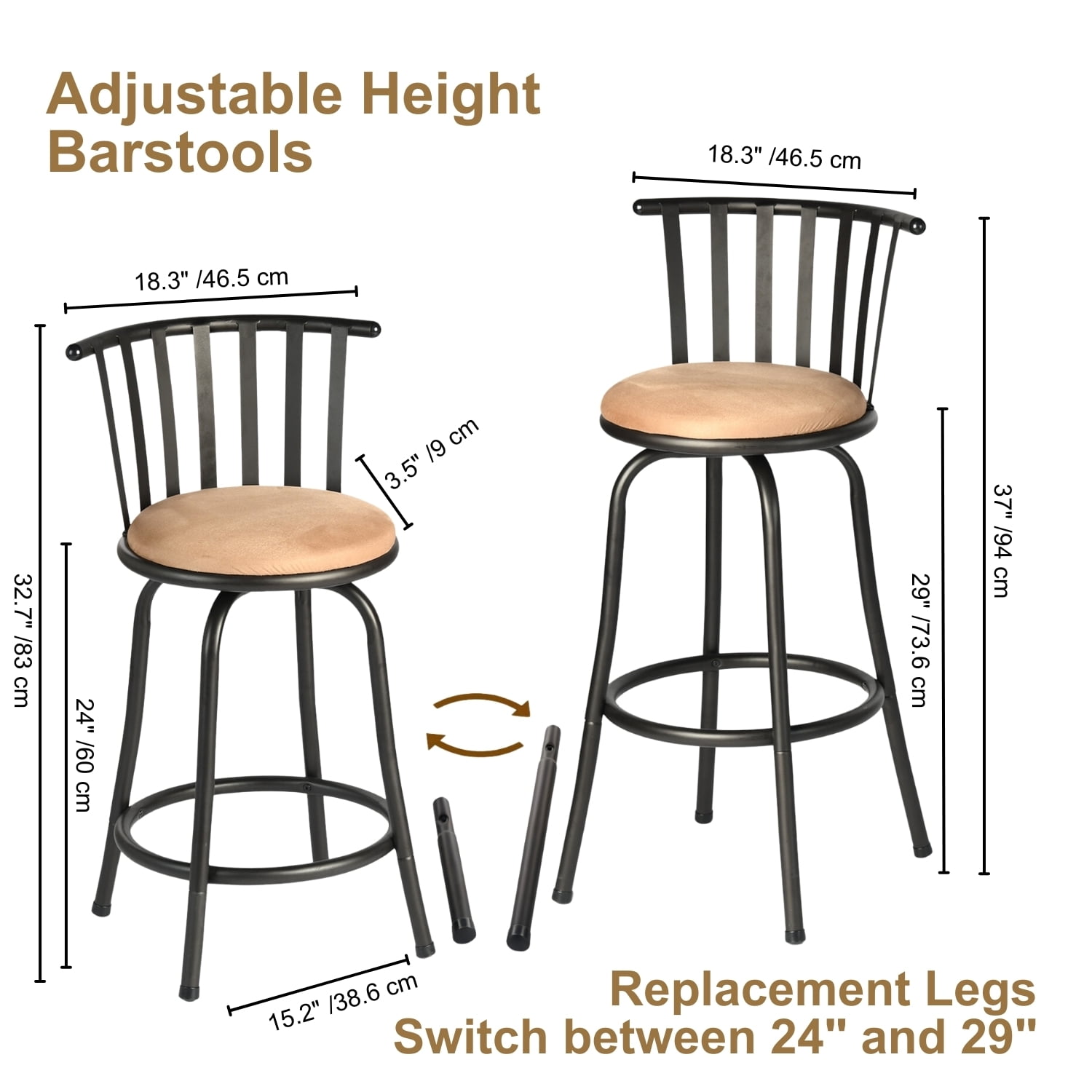 Adjustable Heights: Easily switch between 24″ and 29″ seat heights with replaceable legs, allowing versatile use for various table heights. 360° Swivel Seat: Enjoy full freedom of movement with the 360-degree swivel seat, perfect for social gatherings and dining convenience. Durable Build: Crafted with a sturdy metal frame and designed to support up to 250 lbs, these bar stools ensure stability and long-lasting use. Comfortable Cushion: The cushioned seat provides extra comfort for extended sitting, covered with a soft, easy-to-clean fabric. Sleek Design: With a modern metal backrest and compact footprint, these stools seamlessly fit into any home décor style, from contemporary to industrial. Dimensions: Seat Width: 18.3″ Seat Depth: 3.5″ Overall Height Options: 32.7″ (24″ seat height) and 37″ (29″ seat height) Seat Diameter: 15.2″ Suitable for: Counter-height tables (34-36 inches) and bar-height tables (40-42 inches). Weight Capacity: 250 lbs Assembly Required: Yes, tools included Set Includes: Two bar stools with interchangeable legs