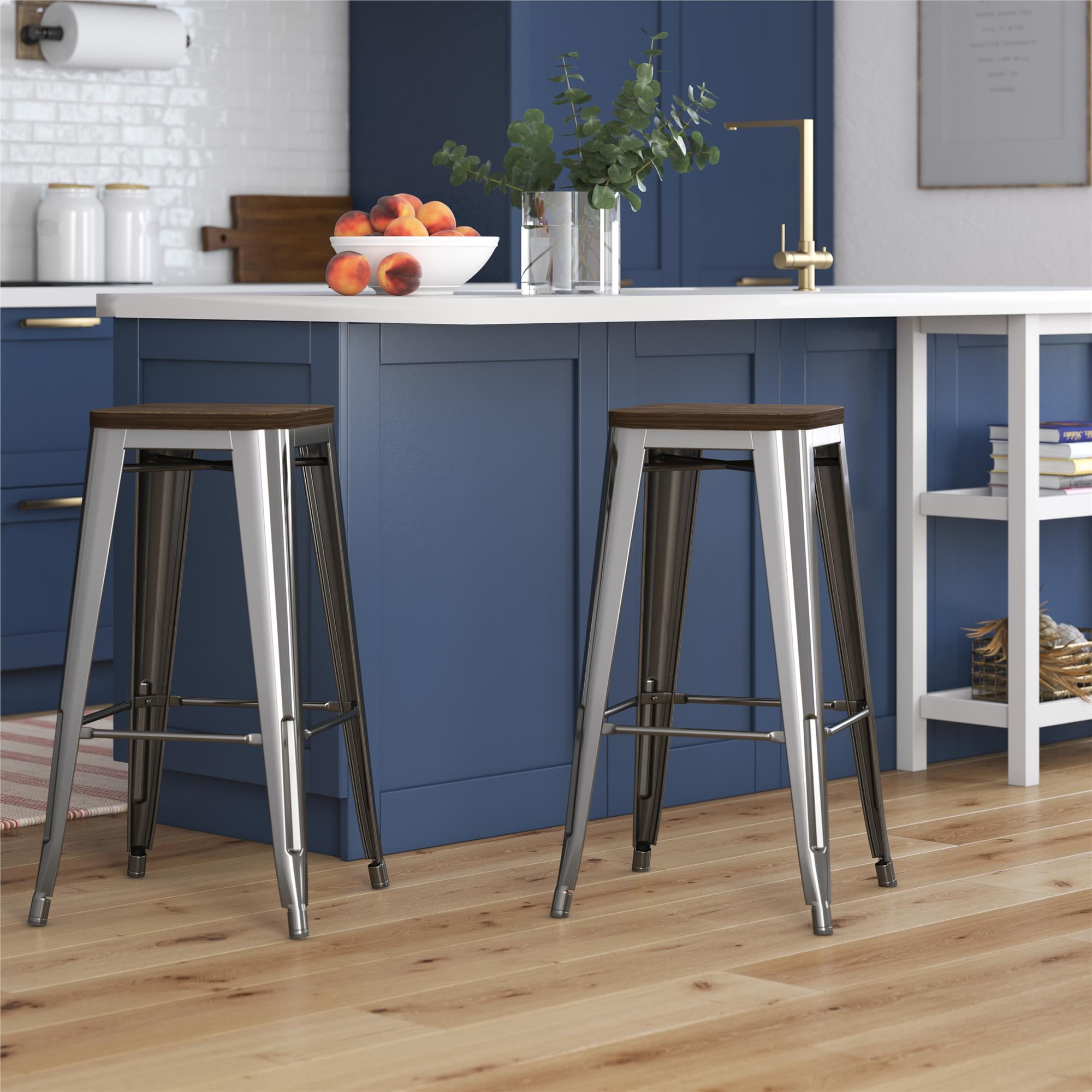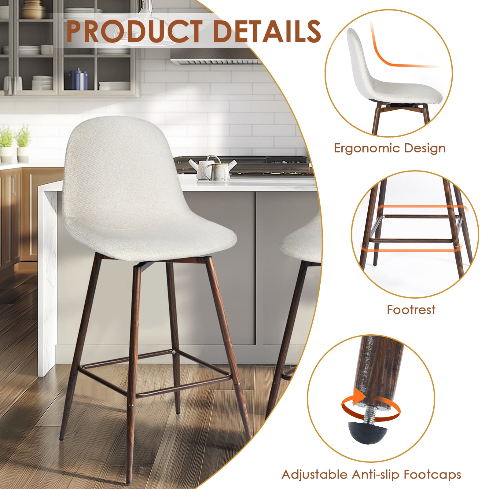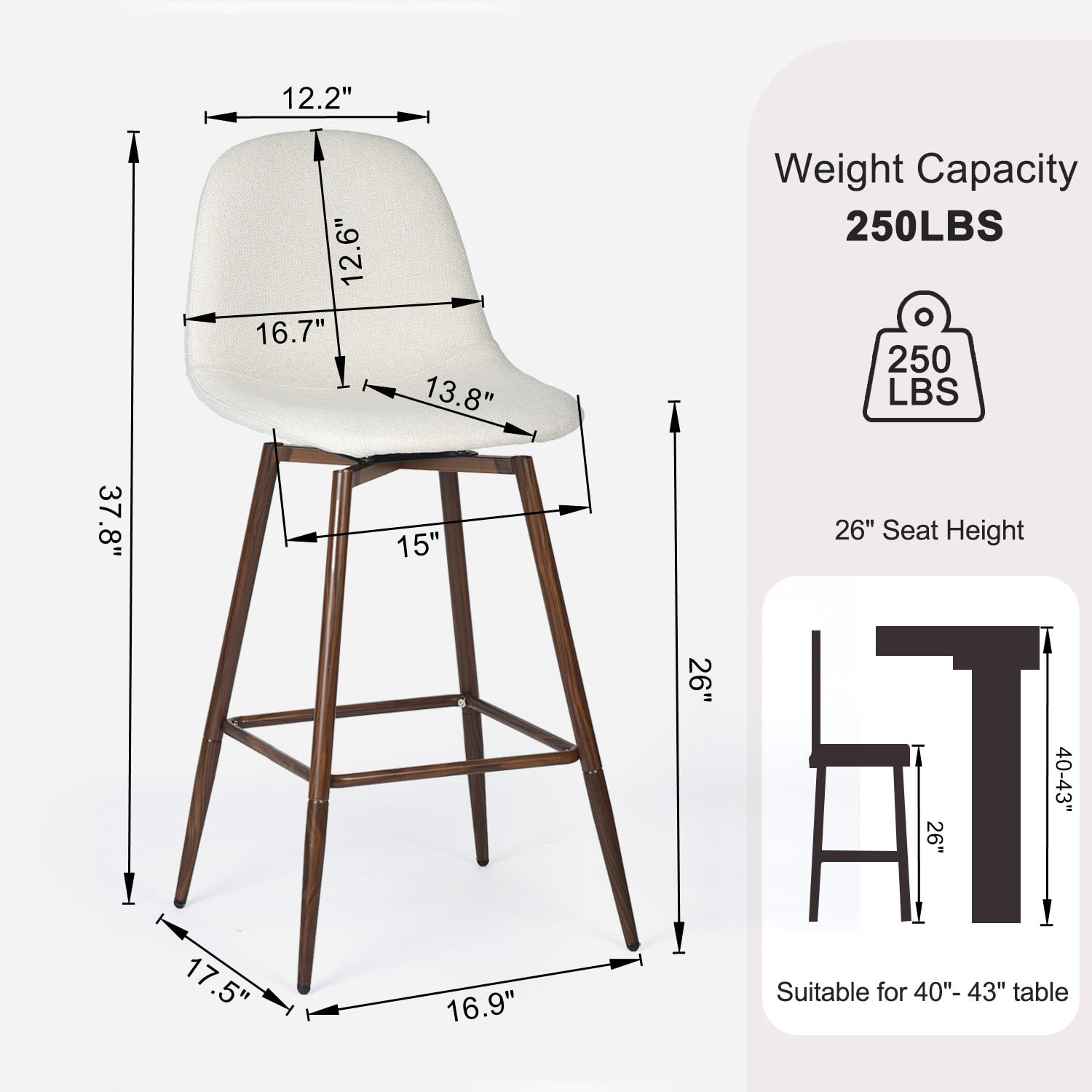 360-Degree Swivel: The smooth swivel function allows easy movement, making these stools perfect for social gatherings. Elegant Beige Fabric Seat: The soft beige fabric adds a touch of warmth and elegance to any kitchen or bar setting. Sturdy Walnut Metal Legs: Designed with durable walnut-finished metal legs, these stools provide a stable base with a stylish contrast to the beige seat, supporting up to 250 lbs. Perfect Counter Height: The 26-inch seat height is ideal for counters ranging from 40-43 inches, offering comfortable seating for meals and conversations. Ergonomic Comfort: Featuring a high backrest and contoured seat, these stools ensure comfortable seating even for extended periods. Compact and Stylish Design: With a compact footprint of 17.5″ x 16.9″, these stools are a great fit for smaller spaces, blending functionality with modern style. Dimensions: Overall Height: 37.8″ Seat Height: 26″ Seat Dimensions: 16.7″ W x 13.8″ D Backrest Height: 12.6″ Leg Dimensions: 26″ H x 17.5″ W x 16.9″ D Weight Capacity: 250 lbs Assembly Required: Yes Package Included: Swivel Barstools set of 2