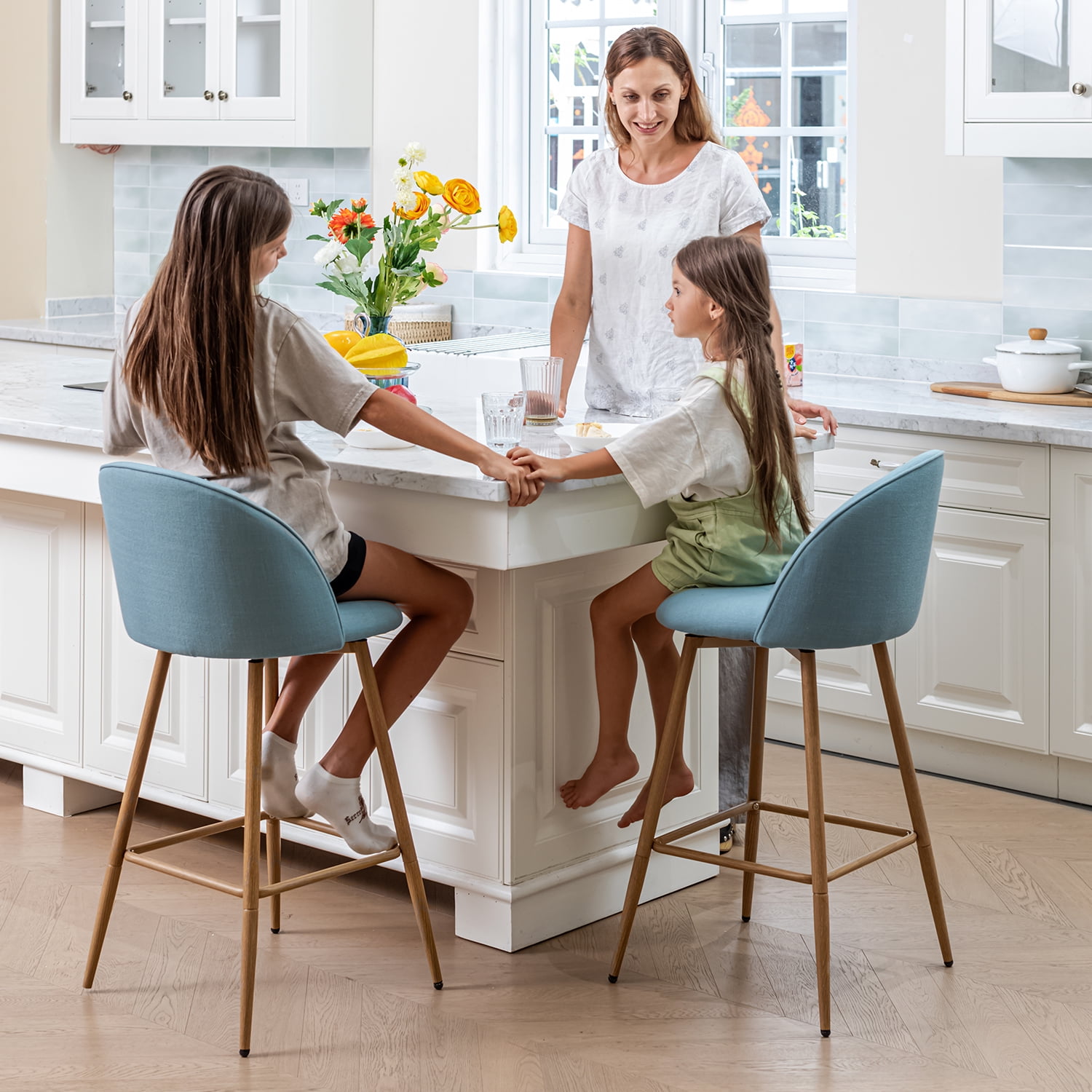 Vibrant Lake Blue Upholstery: Adds a fresh pop of color to your dining or bar area. Full 360° Swivel Seat: Ideal for dynamic seating during conversations or multitasking. Mid-Century Modern Design: Tapered metal legs with oak wood finish provide a stylish and stable base. Perfect Counter Height: 26” seat height fits most kitchen islands and counter tables (40–43” high). Comfort-Focused Build: Cushioned seat and curved backrest offer ergonomic support for prolonged use. Perfect for everyday use in kitchens, breakfast nooks, or home bars. Ideal for casual dining, family meals, and entertaining guests. Suitable for holiday gatherings, housewarmings, or daily seating. Great for modern kitchens, coffee corners, and weekend brunches. Package Included:Swivel Barstools set of 2