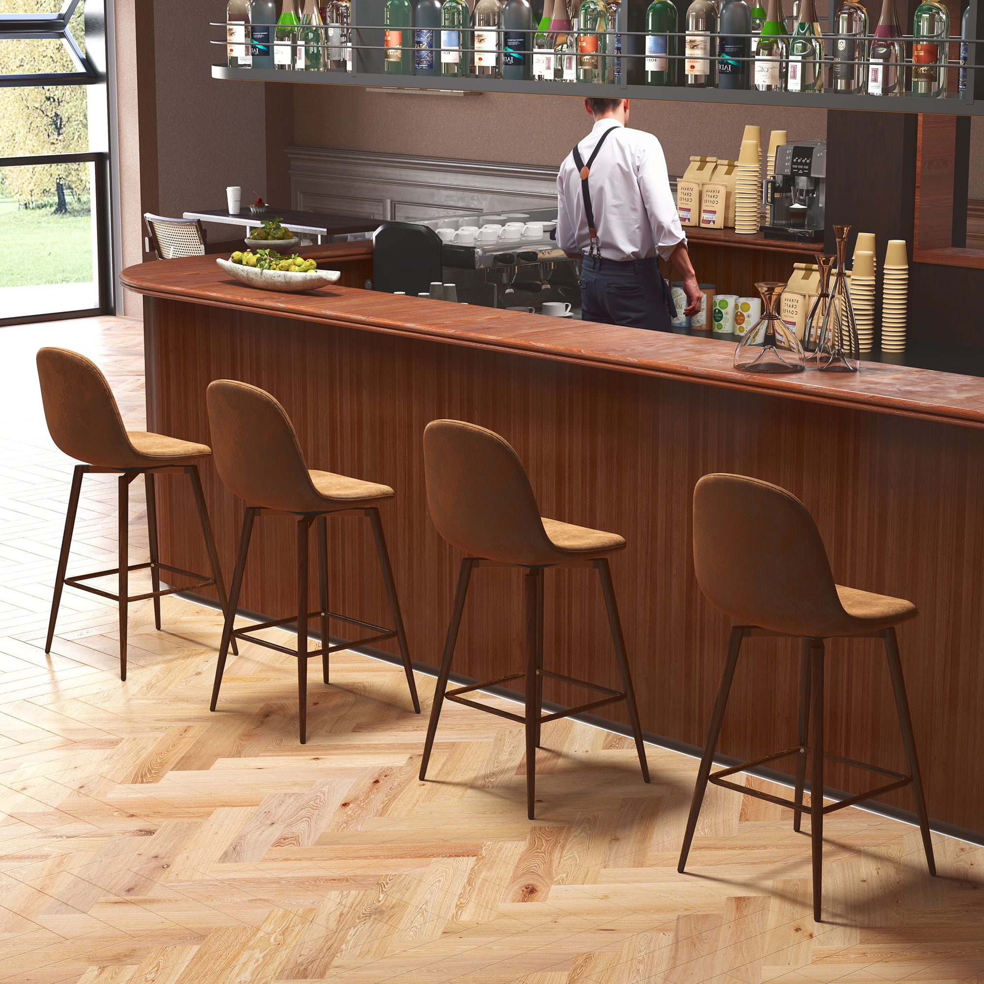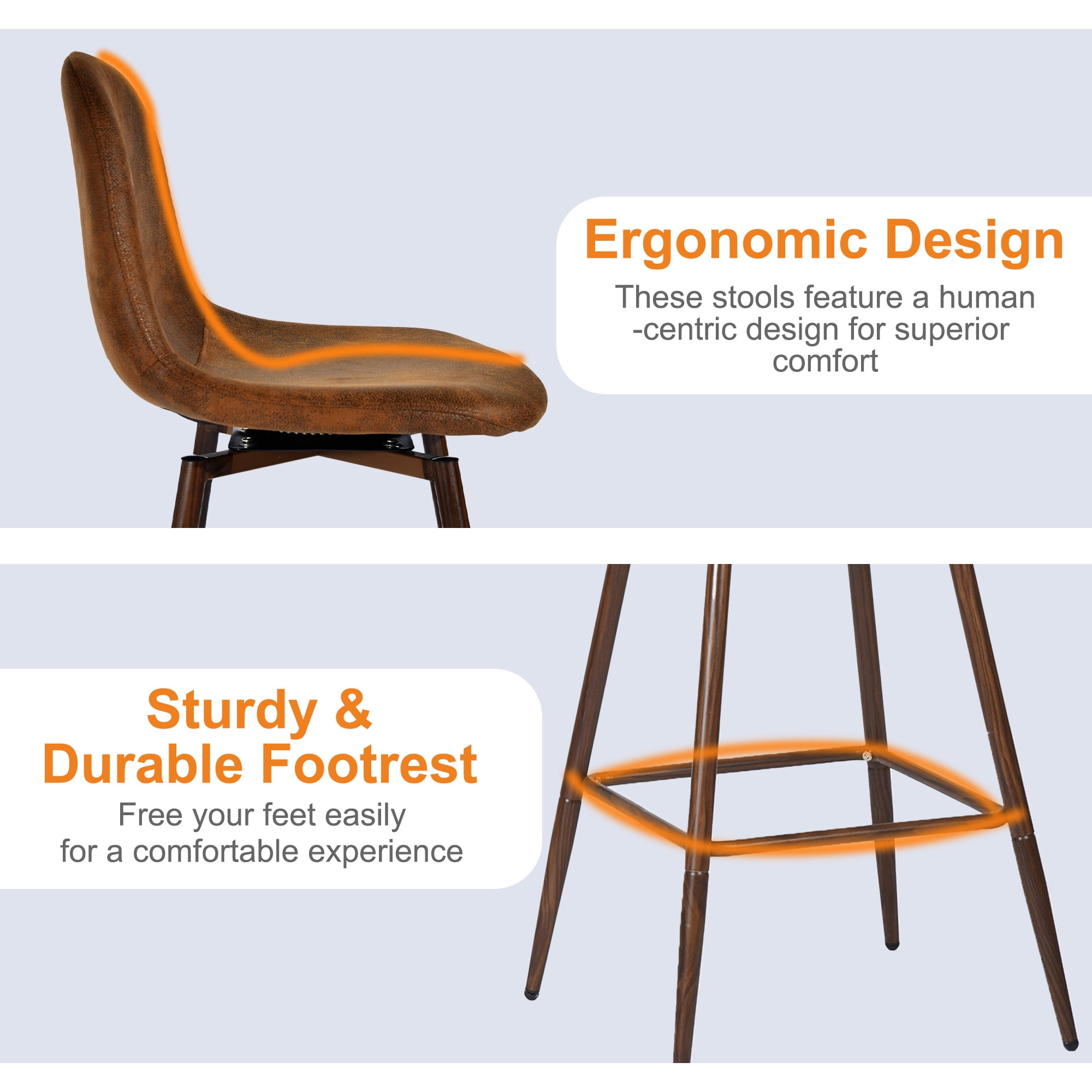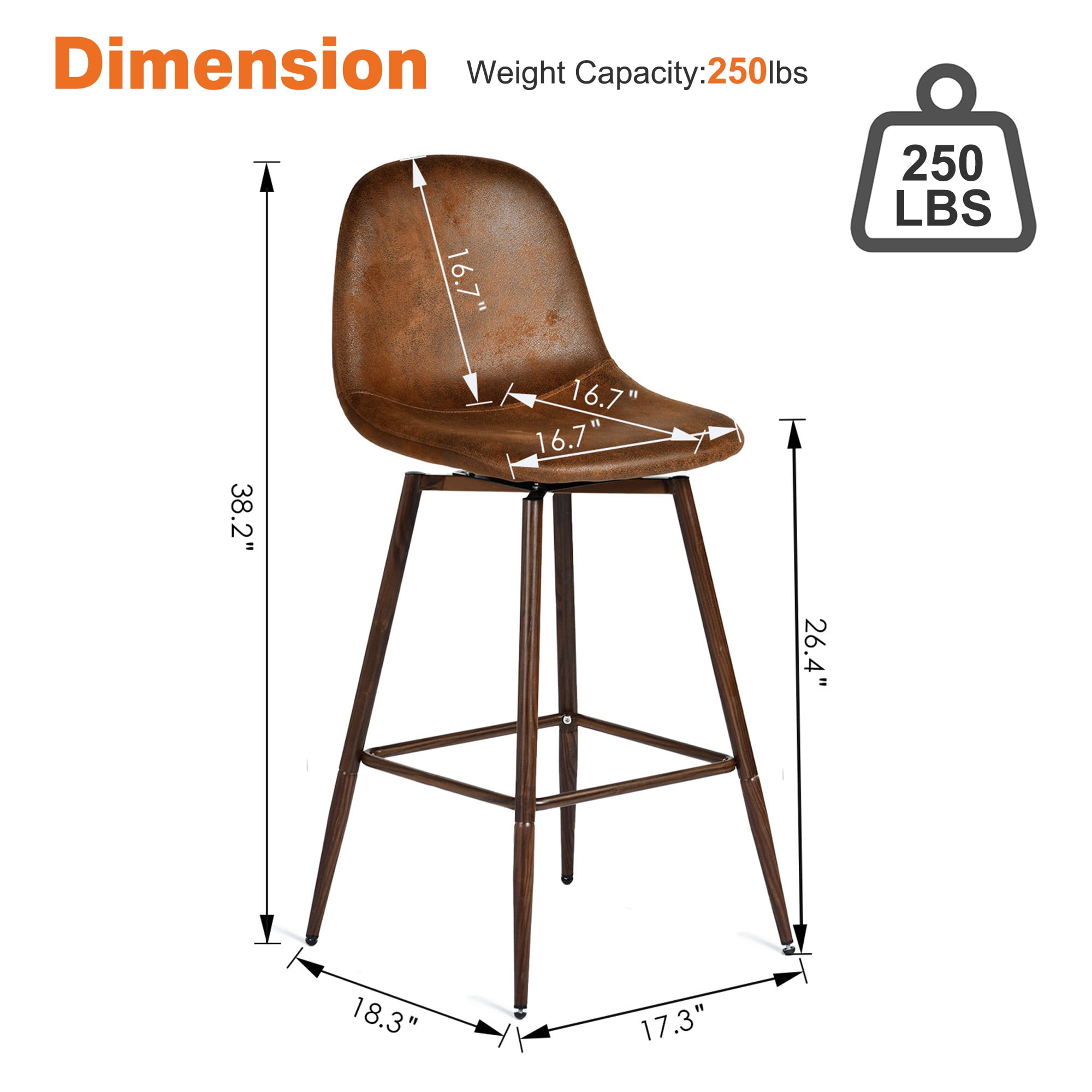 Swivel Seat Design: 360° rotation makes it easy to engage in conversations or move around comfortably. Counter-Height Fit: 26-inch seat height is perfect for surfaces 40–43 inches tall, ideal for kitchen islands, breakfast nooks, or casual bars. Supportive Curved Backrest: Ergonomic shape follows your natural spine curve for added comfort during long seating. Durable Build: Strong metal frame with a woodgrain finish combines style and strength. Upholstered Seat: Available in soft fabric or faux suede/leather to suit different home aesthetics. Weight Capacity: Each stool supports up to 250 lbs, suitable for family and guest use. Overall Height: 38.2″ Seat Height: 26.4″ Seat Depth: 16.7″ Seat Width: 16.7″ Backrest Height: 16.7″ Front Leg Width: 17.3″ Side Leg Depth: 18.3″ Perfect for a variety of settings, this swivel bar stool set effortlessly complements kitchen islands, breakfast bars, home bars, basement bars, counter-height dining areas, and even open-concept living spaces. Whether you’re enjoying morning coffee at a breakfast nook, hosting friends in a game room, or relaxing on a rooftop terrace, these stools provide the ideal mix of comfort and style. Their sleek profile and versatile height also make them a great fit for studio apartments, rental lofts, or multi-use dining corners.