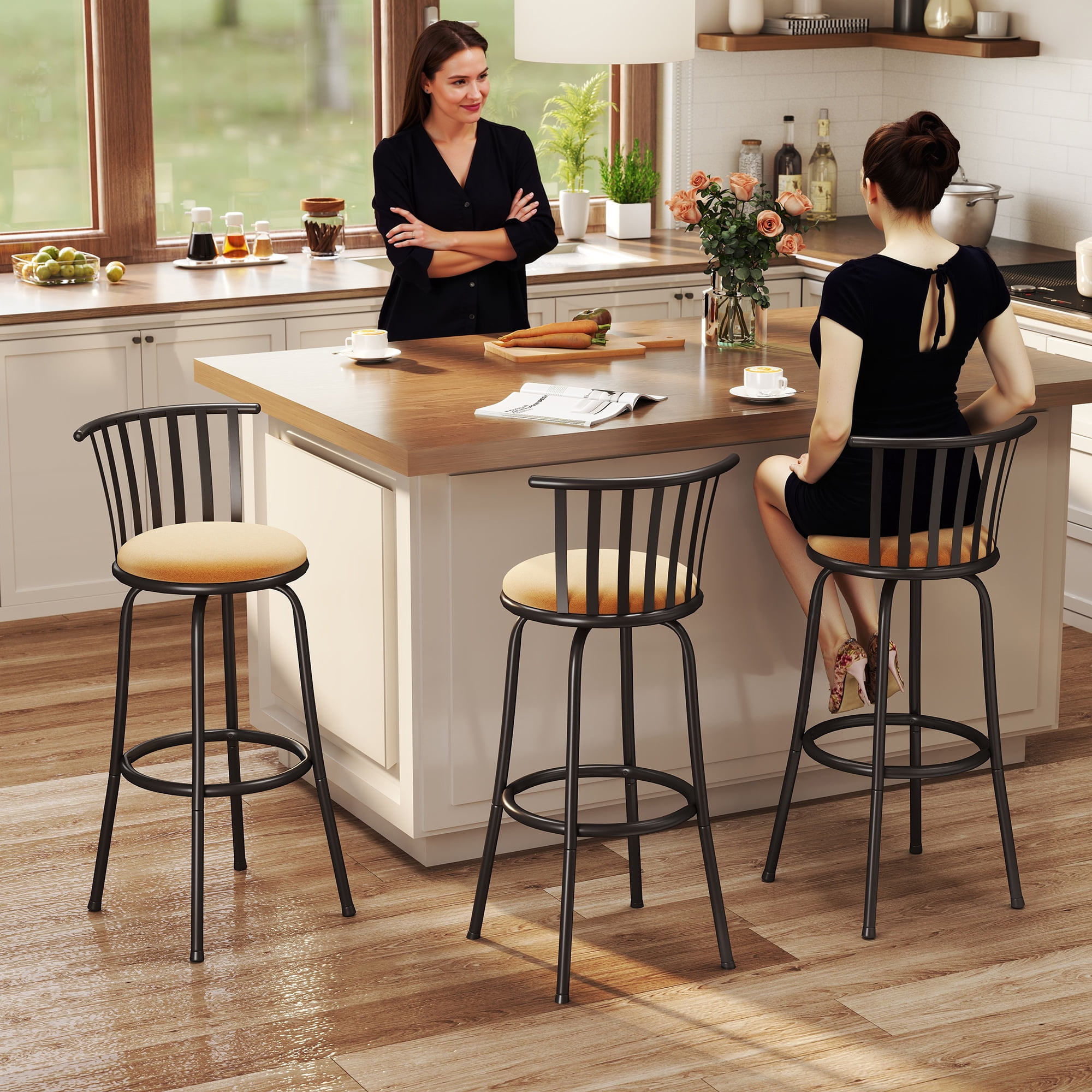 Dual Height Design: Comes with both 24″ and 29″ legs to suit counter seating or bar table setups. 360° Swivel Function: Ideal for kitchen island entertaining and home pub gatherings. Versatile Use: Great for coffee corners, basement bars, high-top dining, or open concept kitchens. Comfortable Seat: Soft padded cushion perfect for apartment bar stools or breakfast nook seating. Space-Saving Stool: Compact footprint fits well in studio apartments and compact homes. Sturdy Build: Powder-coated black steel base supports up to 250 lbs, suitable for everyday use in busy kitchens. Easy Setup: Tool-free leg replacement—great for those needing quick seating adjustments during house parties or family dinners.