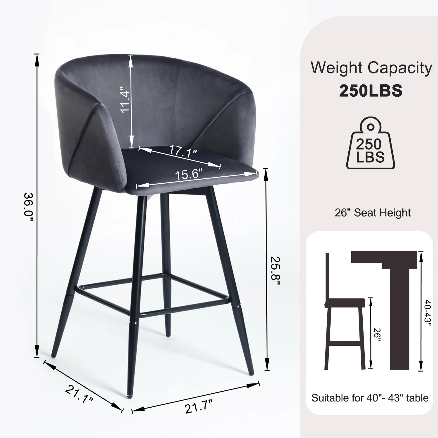 Elegant Velvet Upholstery: Luxurious velvet fabric provides a soft and stylish seating surface. Modern Aesthetic: The sleek design and black-painted metal legs add a touch of sophistication to any space. 360-Degree Swivel: Enjoy full rotation for easy access and enhanced social interaction. Durable Build: Sturdy metal legs ensure stability and support up to 250 lbs. Comfortable Design: High backrest and cushioned seat offer superior comfort and ergonomic support. Set of 2: Includes two barstools, perfect for pairing with kitchen islands or bar counters. Easy Assembly: Comes with all necessary hardware and instructions for quick setup. Compact Packaging: Safely packed in a box measuring 27.6″ x 21.7″ x 23.6″ for convenient delivery. Dimensions: Overall Dimensions: 21.7″ L x 21.1″ W x 36.0″ H Seat Dimensions: 17.1″ W x 15.6″ D Backrest Height: 11.4″ Seat Height: 26″ Footrest Height: 25.8″ Weight: Net Weight (each): 30.4 lbs Gross Weight (each): 37.3 lbs Bring home the Homy Casa Swivel Barstool set and transform your dining area into a stylish and comfortable retreat.