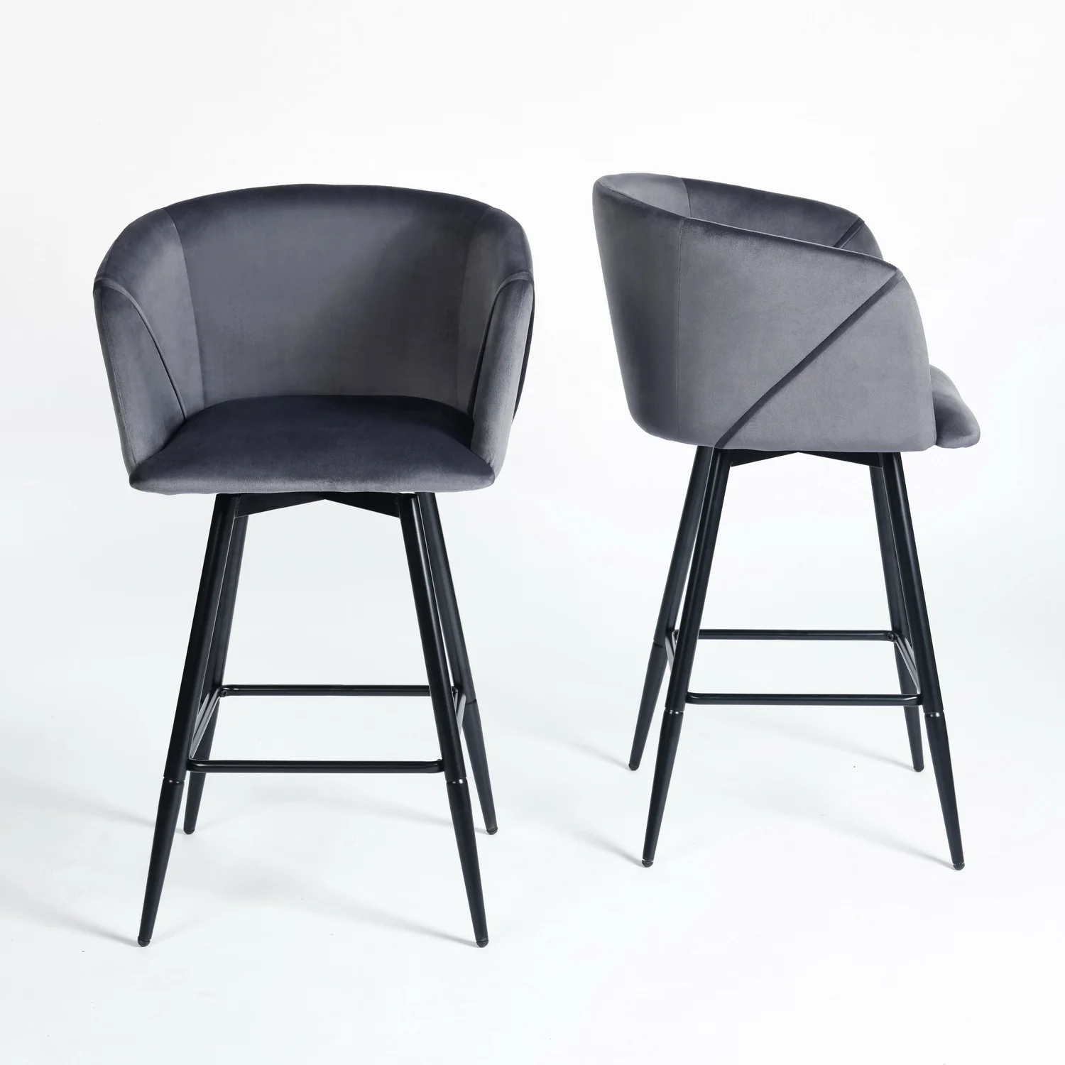 Elevate your home bar or kitchen with the Homy Casa Swivel Barstool, a perfect fusion of style, comfort, and practicality. These barstools come in an elegant set of 2, featuring a plush velvet fabric cover, paired with sleek black-painted metal legs. Designed to provide an exquisite seating experience, these barstools are an ideal addition to any modern home. The 360-degree swivel function allows for easy maneuverability, making socializing and dining a breeze. The sturdy metal construction ensures durability and stability, supporting up to 250 lbs, so you can sit comfortably and securely.Each barstool is thoughtfully crafted with a high backrest and cushioned seat, offering exceptional comfort for extended periods of sitting. The design promotes proper posture and reduces strain, making these stools perfect for both casual meals and formal gatherings. Whether you’re enjoying a quick breakfast, a leisurely dinner, or entertaining guests, these barstools provide the perfect perch.