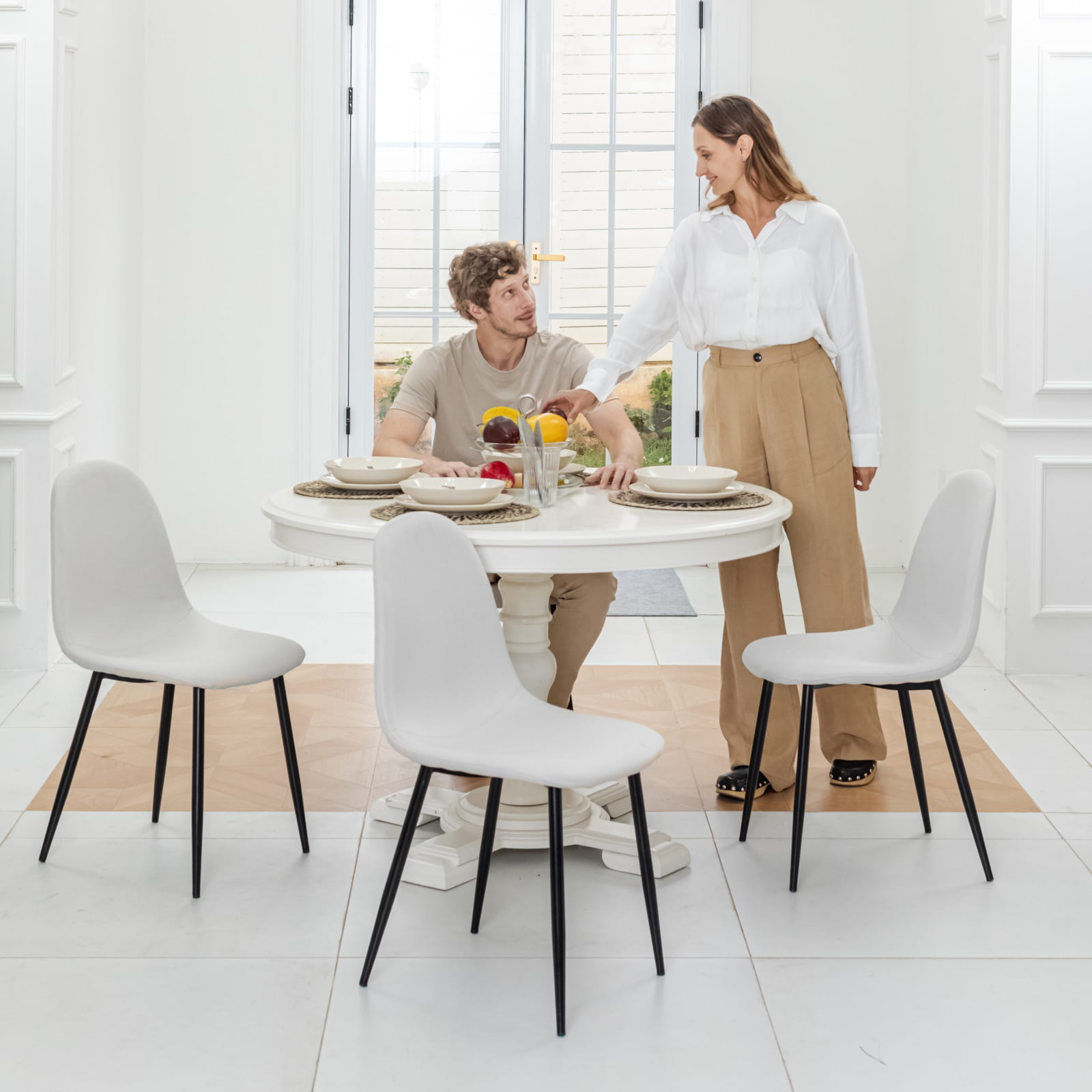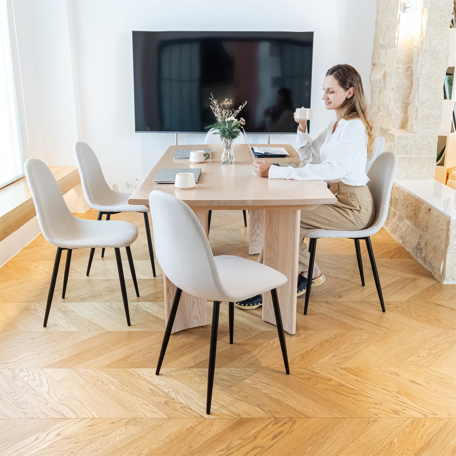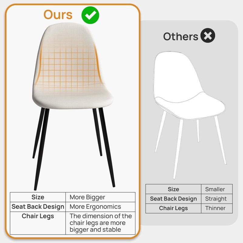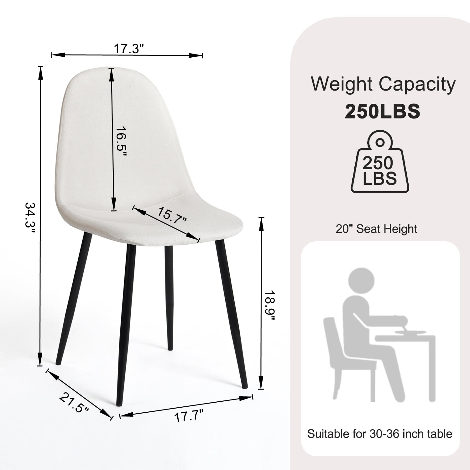 This set of four modern minimalist dining chairs is the perfect addition to your dining room or kitchen. Crafted with high-quality beige fabric and robust black metal legs, these chairs offer both style and comfort. The spacious seat dimensions, along with a 20-inch seat height, are ideally suited for tables between 30-36 inches in height. Each chair can support up to 250 pounds, accommodating various family members with ease. Whether for daily meals or special gatherings, these dining chairs will enhance your dining area with both style and comfort.