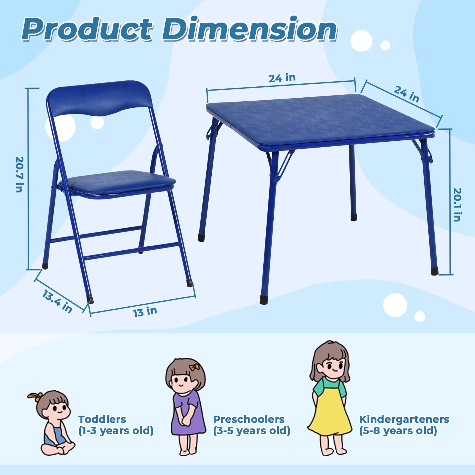 Bring vibrant fun to any space with the Homy Casa Folding Table and Chair Set, a perfect classroom playset. This 5-piece set includes a sturdy table and four colorful folding chairs, making it an ideal choice for kids’ play tables. Each chair comes in a bright color – red, yellow, blue, and green. The table (24″L x 24″ W x 20″ H) and chairs (12″L x 11″W x 22″ H) are designed for toddlers aged 2-8. With rounded corners and foldable legs for easy storage, this durable set is perfect for indoor use, such as playrooms, classrooms, and daycares, encouraging creativity and social interaction.