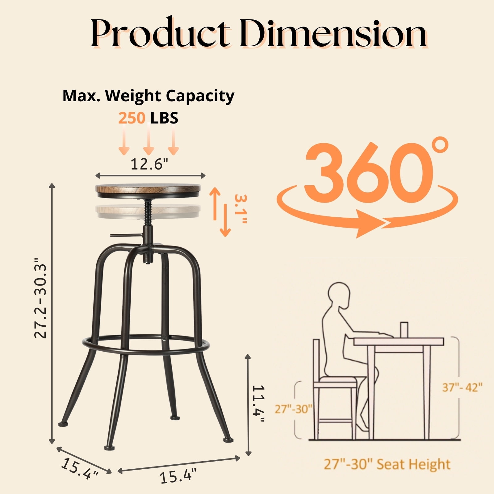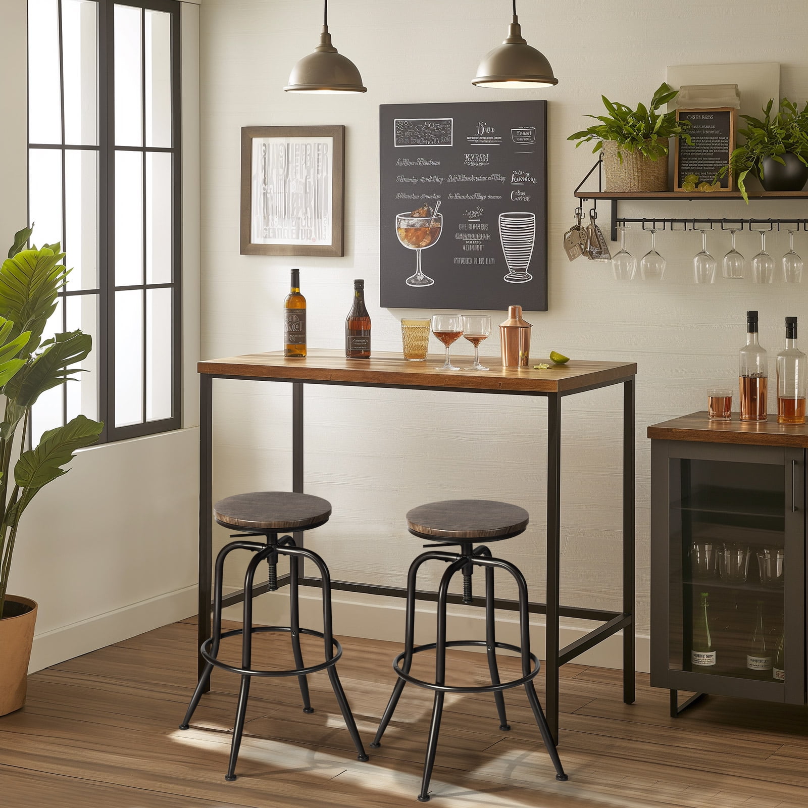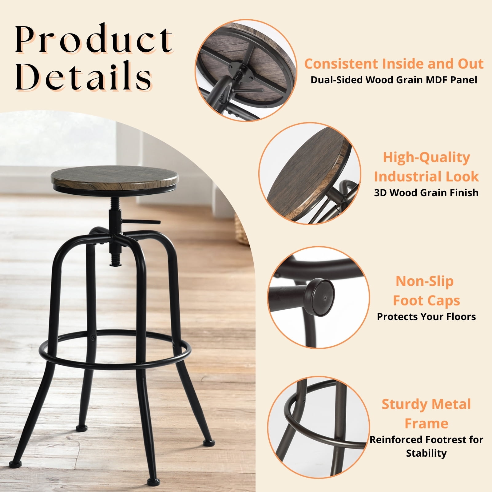 Versatile Use: Perfect for kitchen islands, home bars, breakfast nooks, and counter-height dining areas. Adjustable Height: Easily customize stool height to suit counters or bar surfaces. 360° Swivel Seat: Enjoy full mobility and easy conversation with smooth swivel function. Stylish Wood Seat: Walnut-finished wood top adds warmth and a modern touch to any décor. Comfortable Design: Footrest and ergonomic seat shape provide added comfort for extended use. Space-Saving: Armless design tucks neatly under counters when not in use.