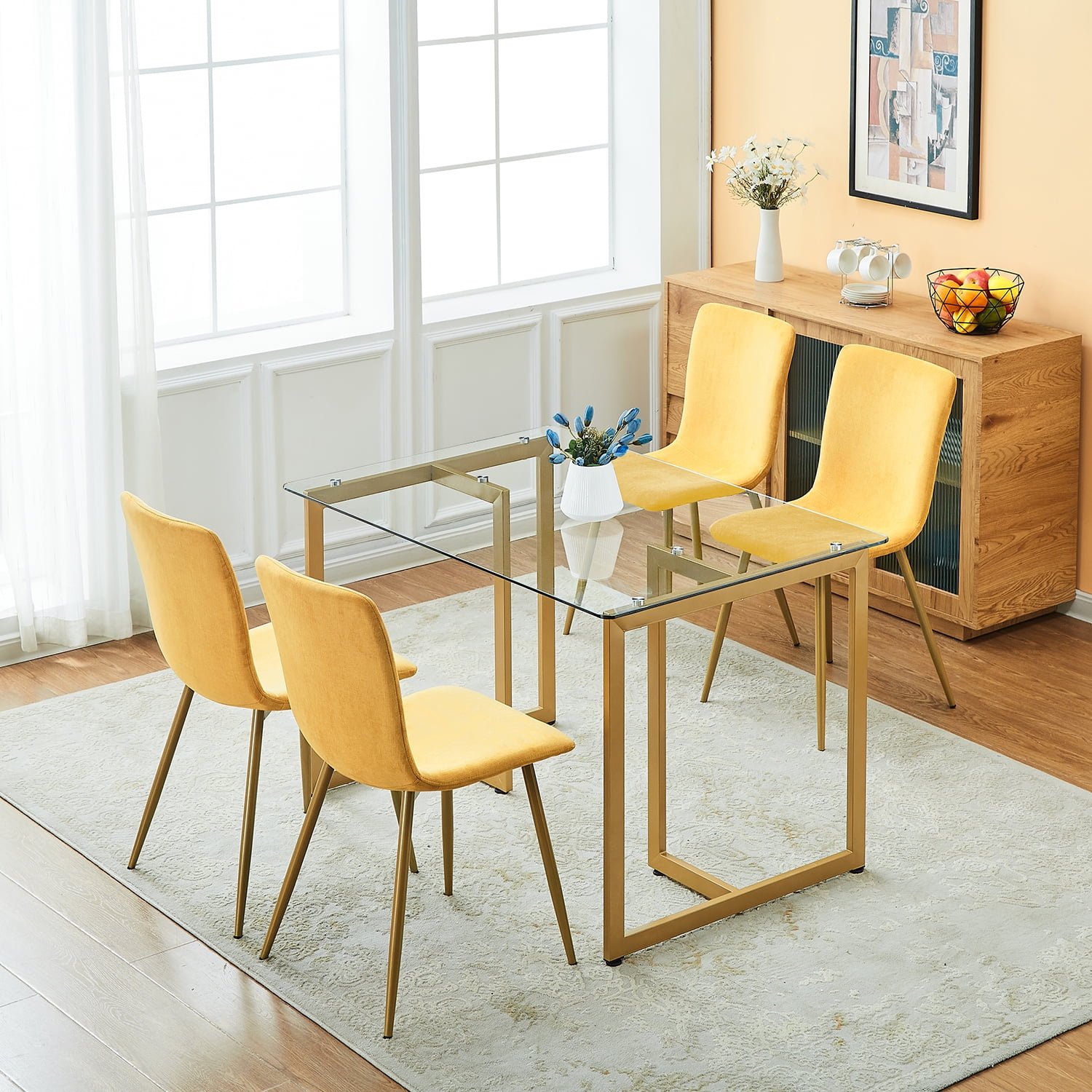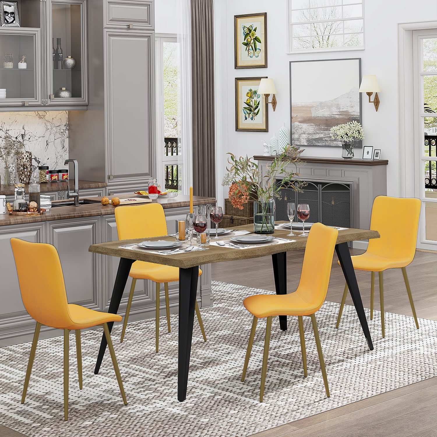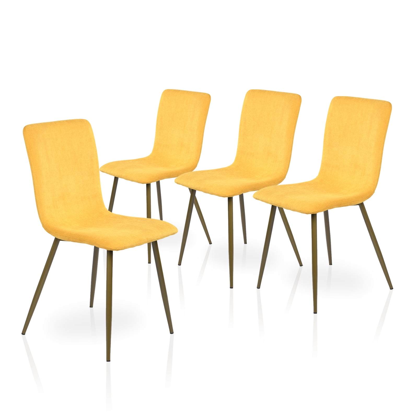 Brighten up your dining area with this set of four vibrant yellow dining chairs, designed to bring life and color to your home. Each chair is wrapped in a soft, radiant yellow terry cloth fabric that’s not only eye-catching but also incredibly comfortable, perfect for enjoying meals and making memories with loved ones. The gold-finished metal legs provide a chic contrast and add an element of glamour to your decor. These chairs are built with a focus on durability and stability, ensuring they are a long-lasting addition to your home. They’re also easy to assemble, so you can transform your space with ease. Not just limited to the dining room, their versatile design makes them suitable for use as stylish accent chairs in any room.