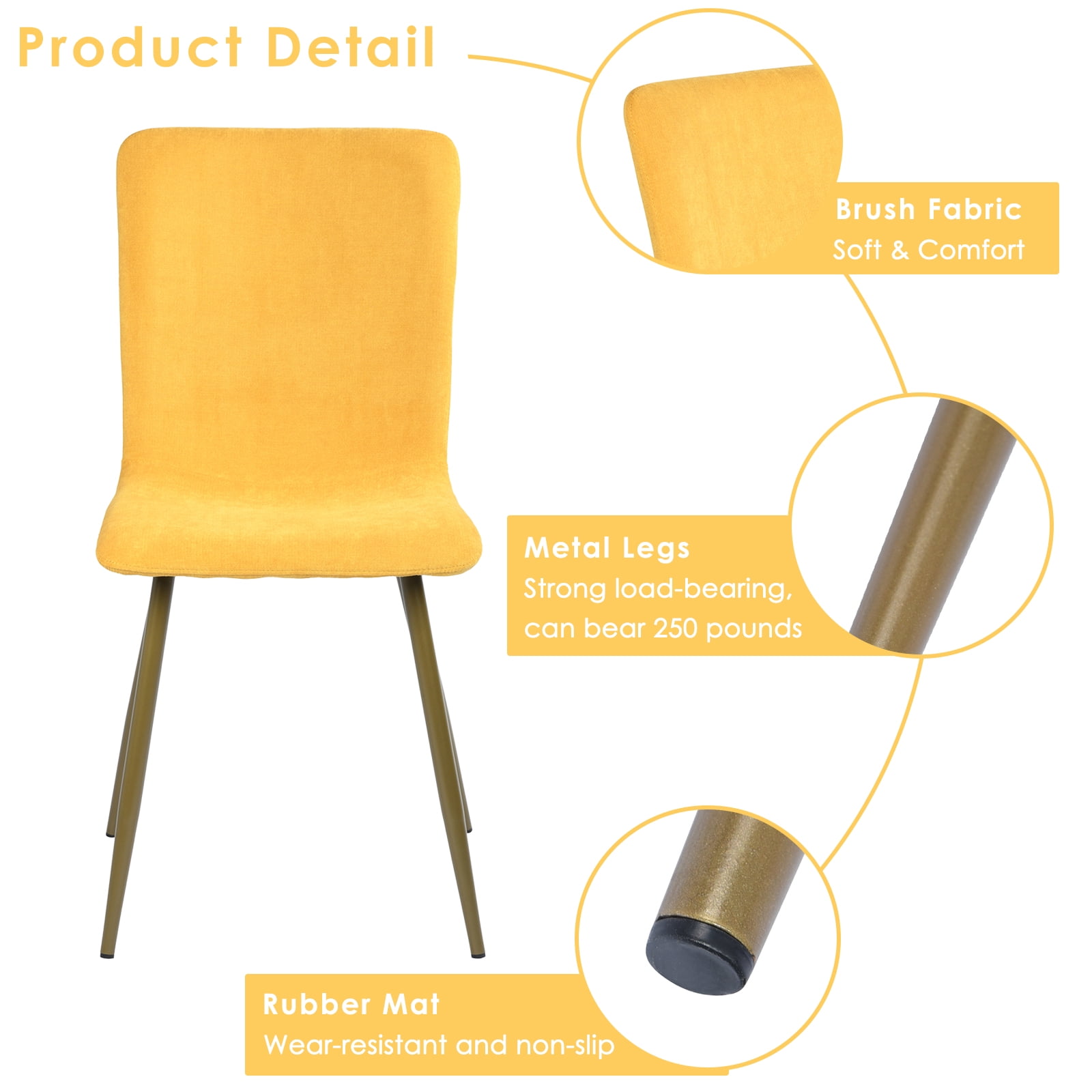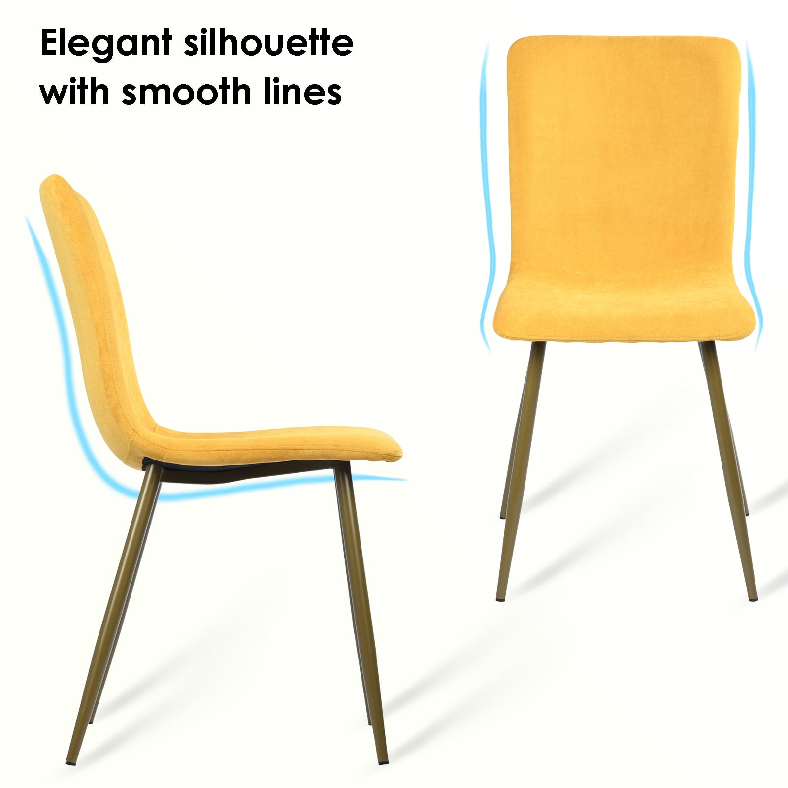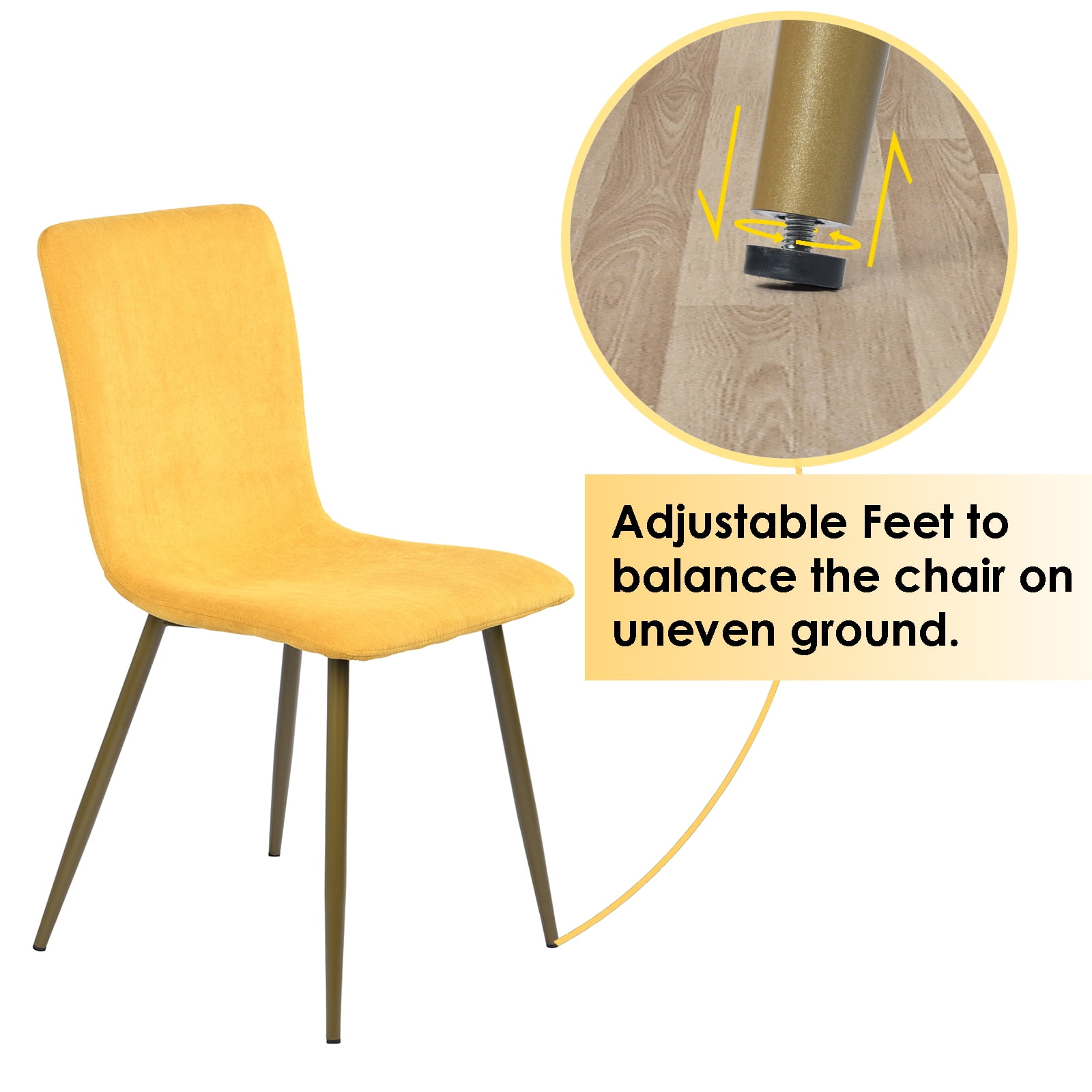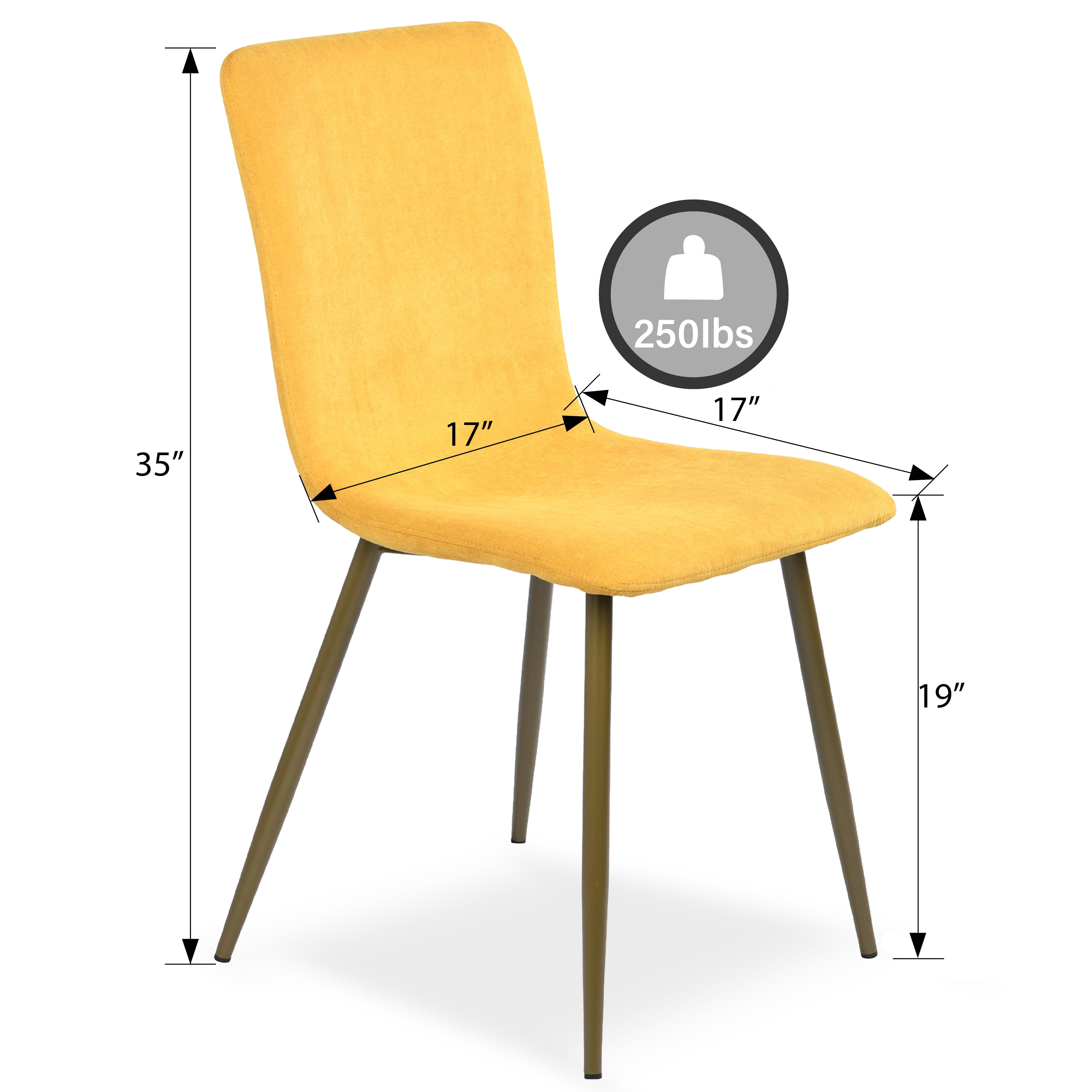 Bright Yellow Upholstery: The chairs are upholstered in a radiant yellow terry cloth fabric, offering a pop of color that energizes any dining space. Comfortable and Soft: Soft terry cloth material provides a comfortable seating experience, perfect for long conversations around the dining table. Chic Gold Metal Legs: The chairs stand on sleek gold-finished metal legs, adding a touch of glamour and sophistication to the overall design. Sturdy and Stable: Constructed for durability, the chairs feature a strong metal base, ensuring stability and a long-lasting build. Effortless Assembly: Simple to put together with minimal tools required, these chairs can be assembled quickly so you can enjoy your refreshed space sooner. Versatile Style: While ideal for dining rooms, these chairs can also serve as accent pieces in a living room, office, or bedroom, offering versatile styling options.